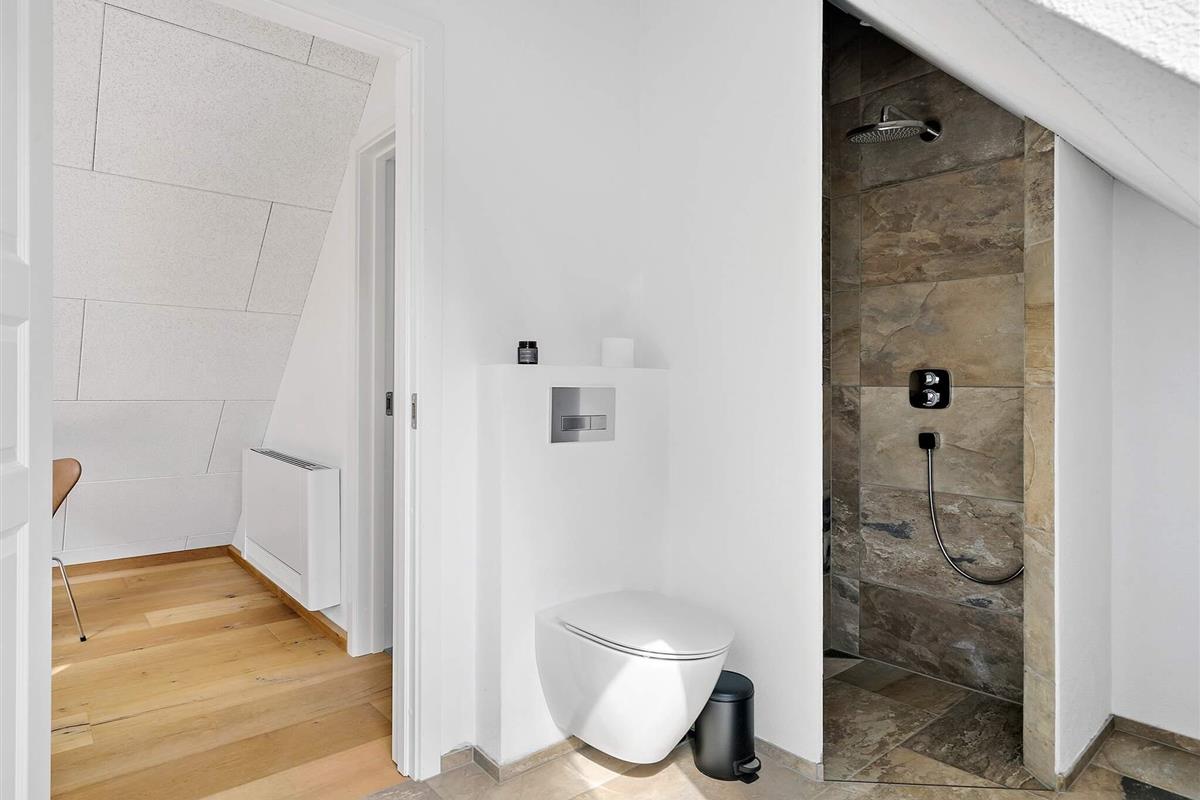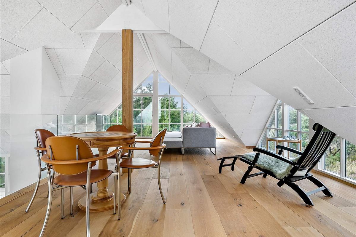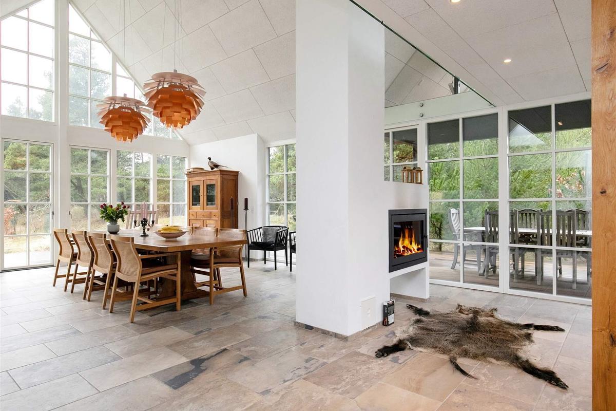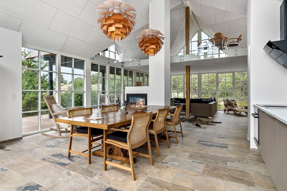 Ein besonderes Highlight ist die beeindruckende Küche mit ihrer integralen Verbindung zum Außenbereich. Das Haus ist mit wunderschönen Naturfliesen ausgestattet, die ein harmonisches Ganzes bilden. Im Erdgeschoss teilen sich der Ess- und der Sitzbereich einen eleganten Kamin, der von beiden Bereichen aus sichtbar ist. Auch die Treppe hinauf in die erste Etage wirkt elegant und stilvoll. Oben genießt man vom Fernsehzimmer aus eine wunderbare Aussicht!