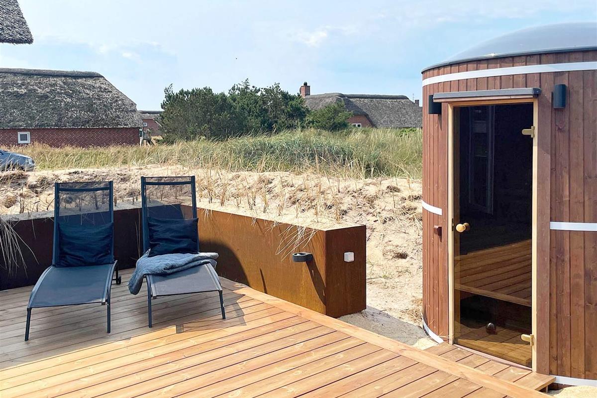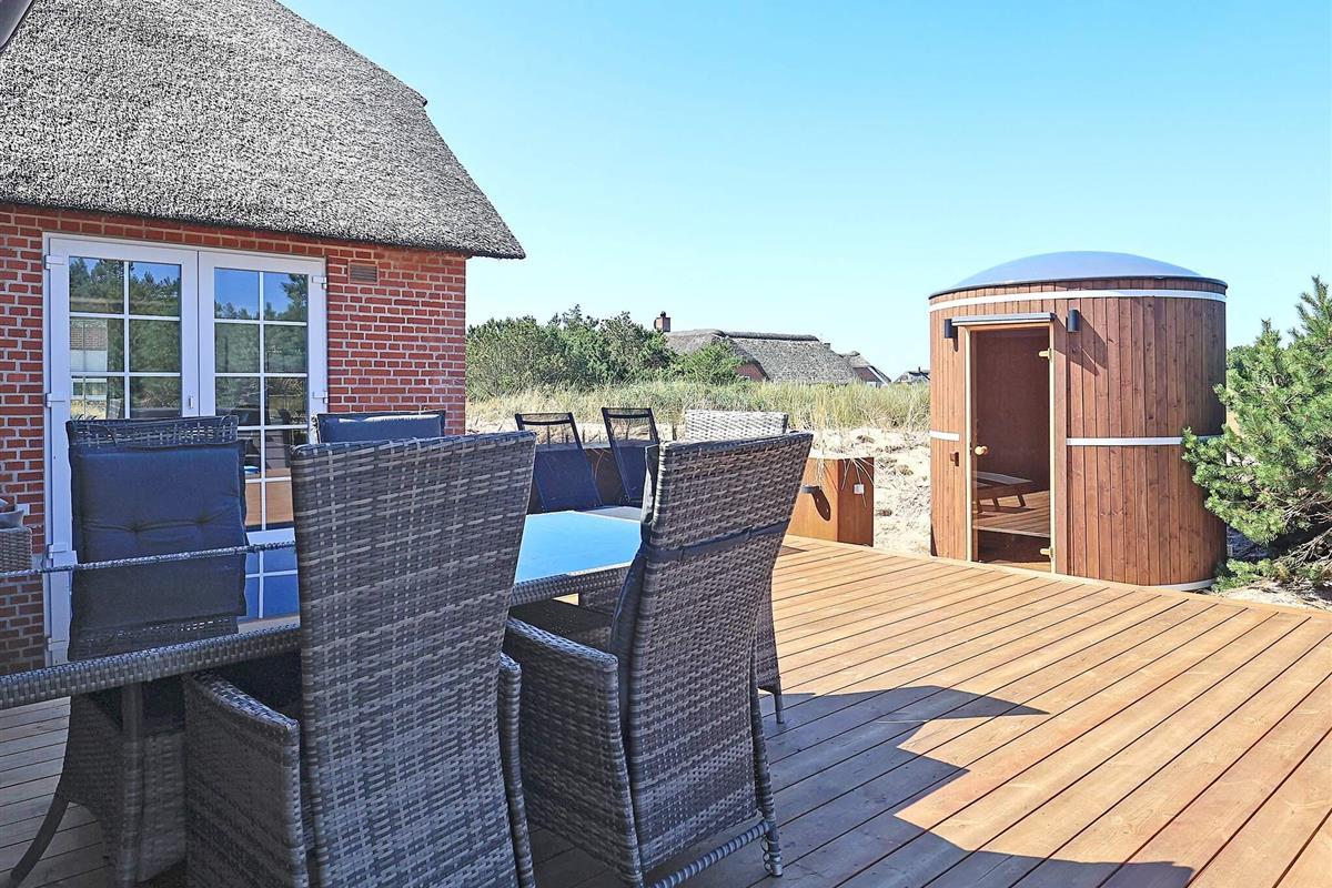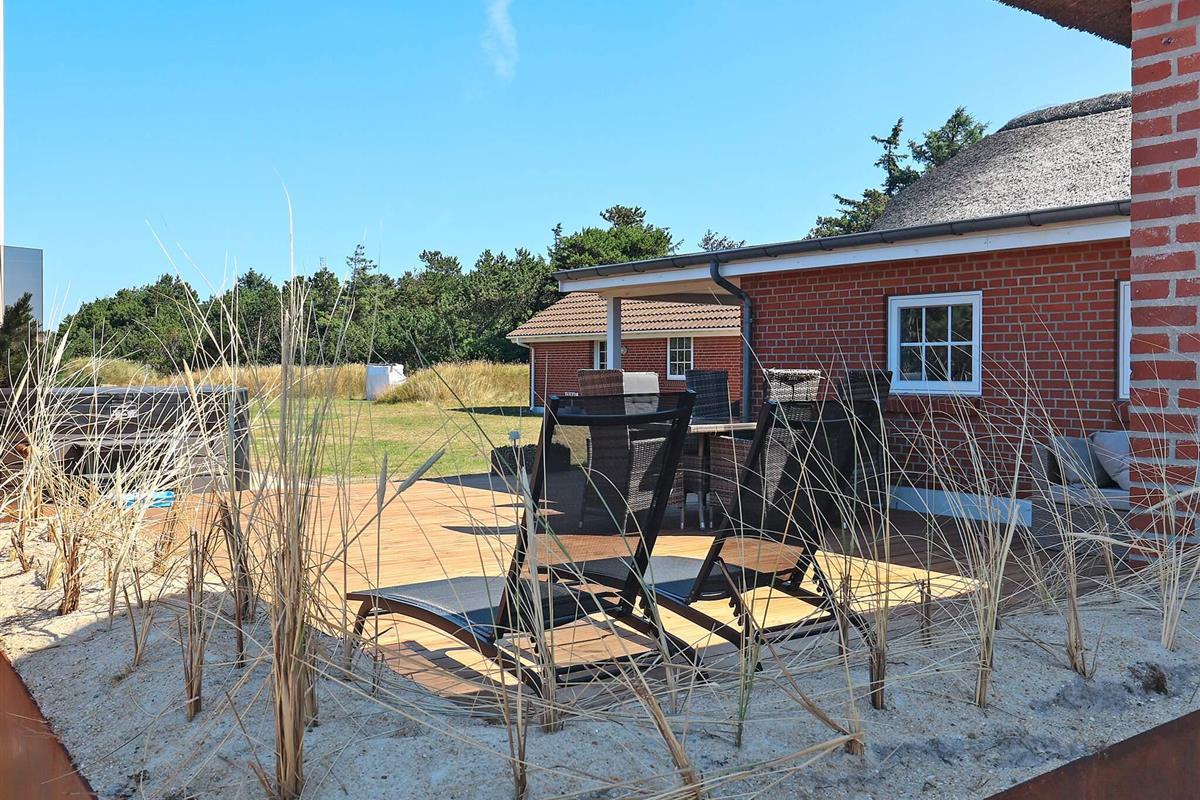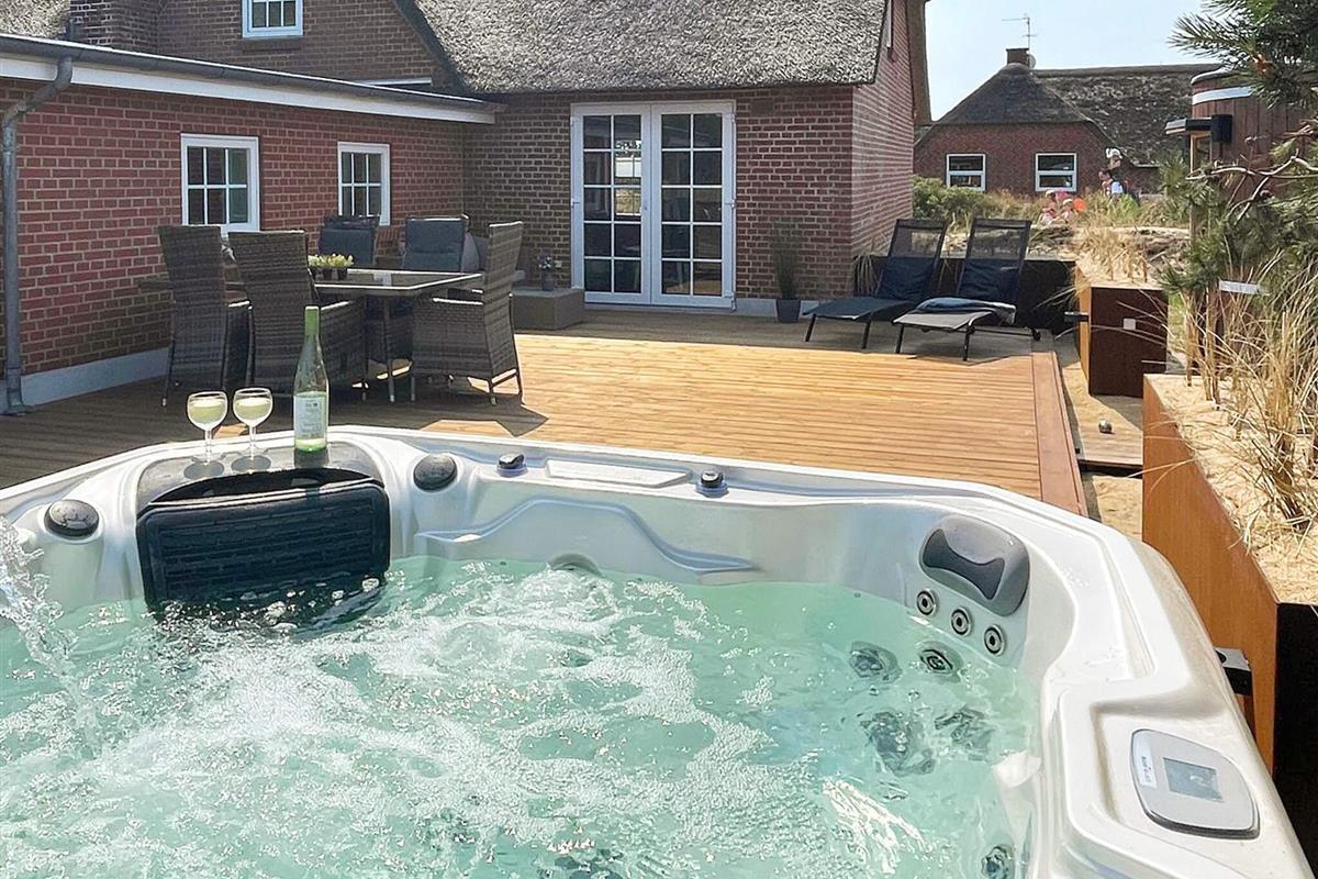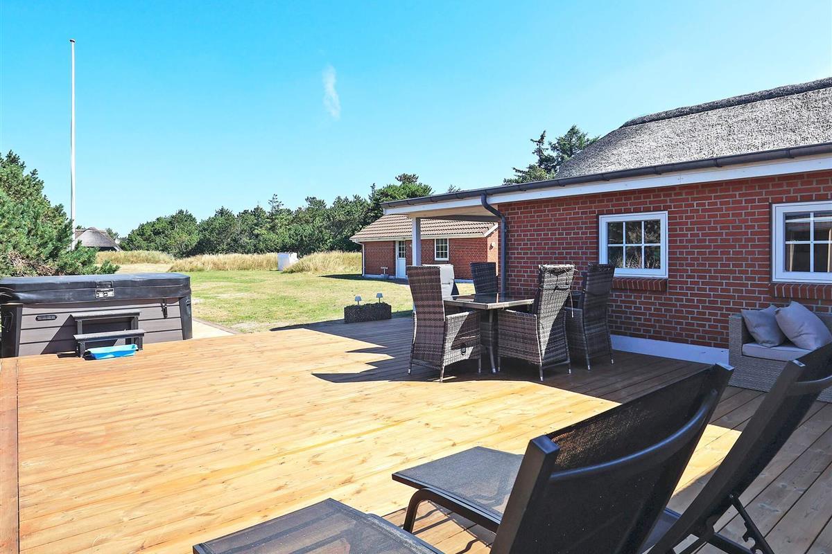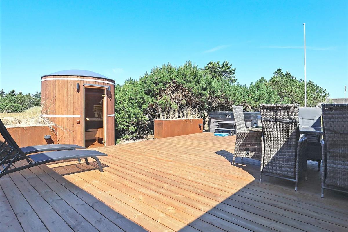Geräumiges Ferienhaus in bester Lage nahe dem Nordseestrand von Blåvand. Die große Holzterrasse mit Whirlpool und Sauna lädt zum Entspannen im Freien ein.