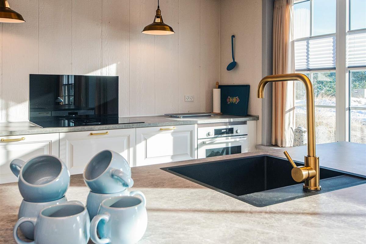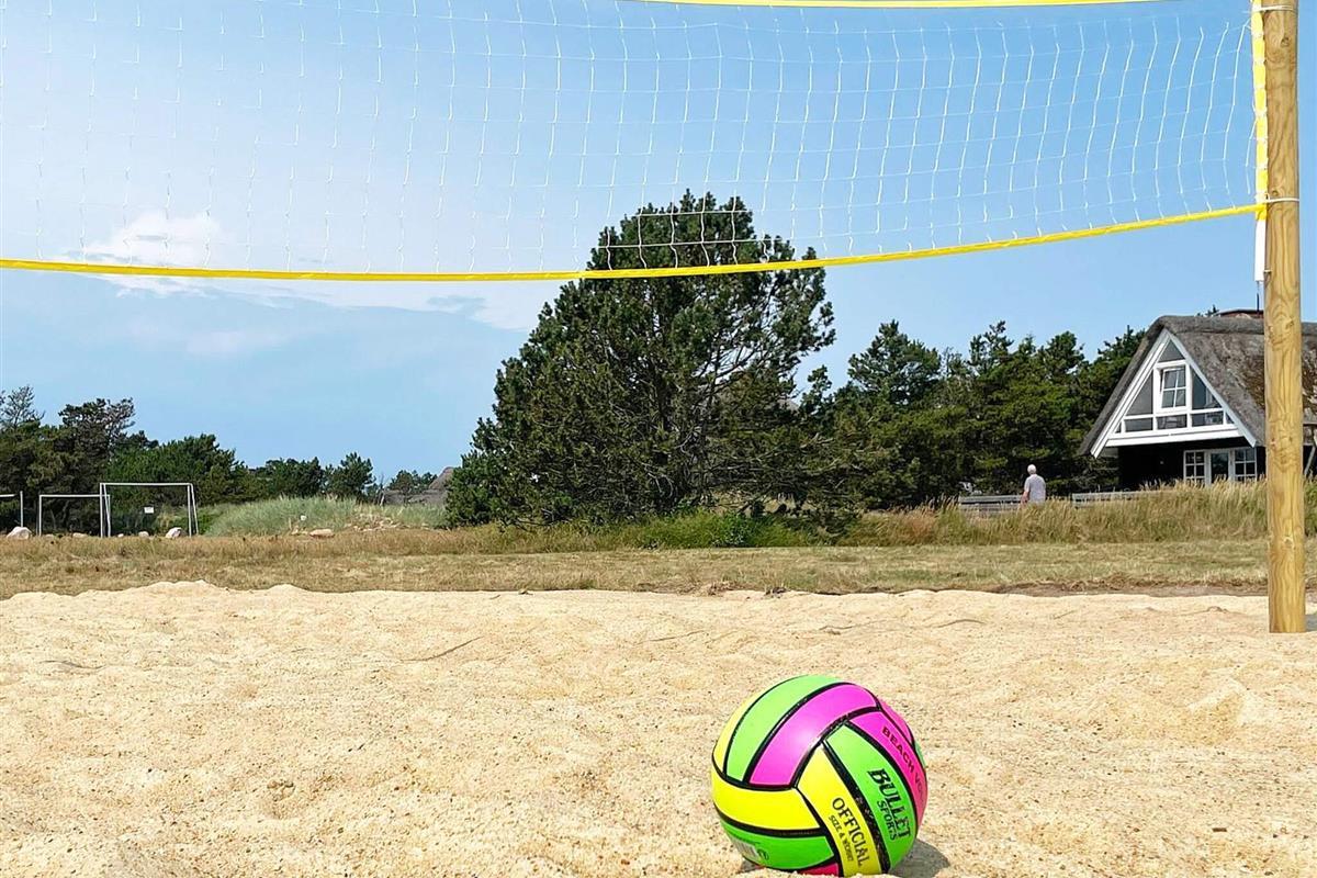 Der Außenbereich bietet zwei Terrassenbereiche nach Nordwesten: Einer ist abgeschirmt und bietet Privatsphäre, während der andere überdacht ist – ideal für Mahlzeiten im Freien oder einfach zum Entspannen bei jedem Wetter. Auf dem großen Naturgrundstück befindet sich außerdem ein Beachvolleyballfeld für aktives Spielen.
