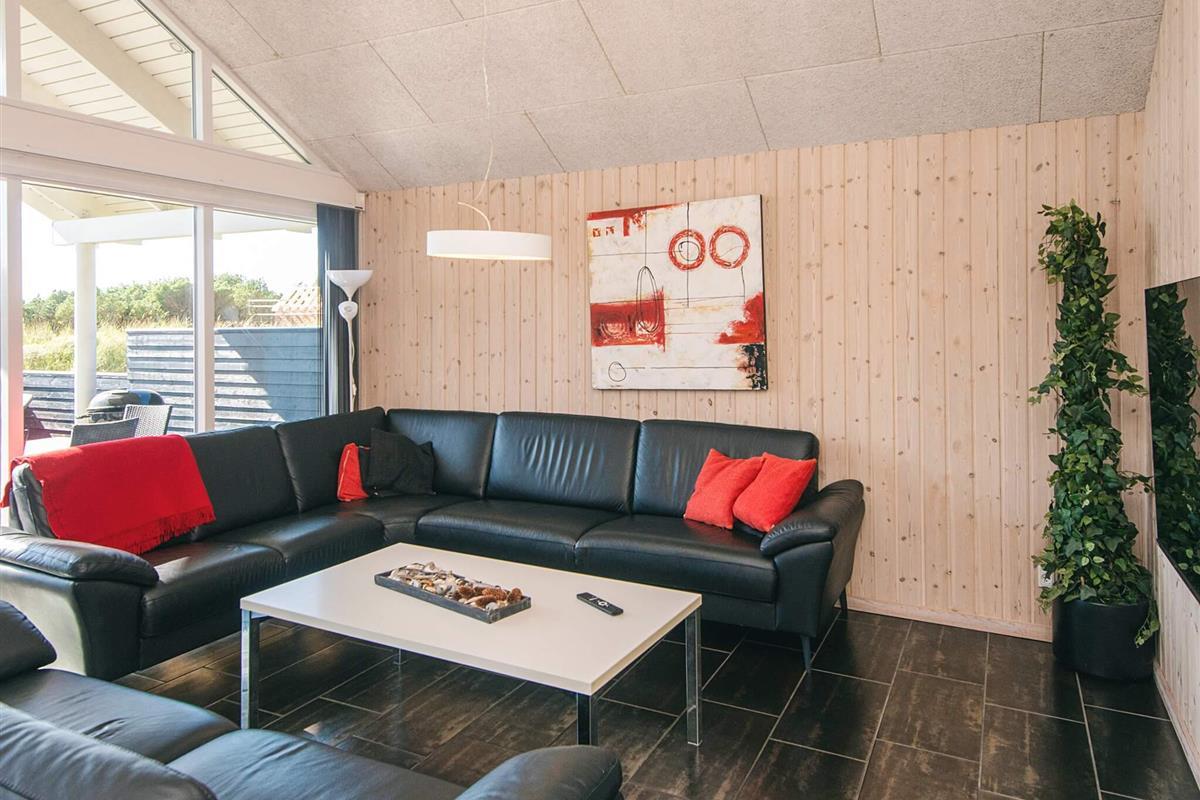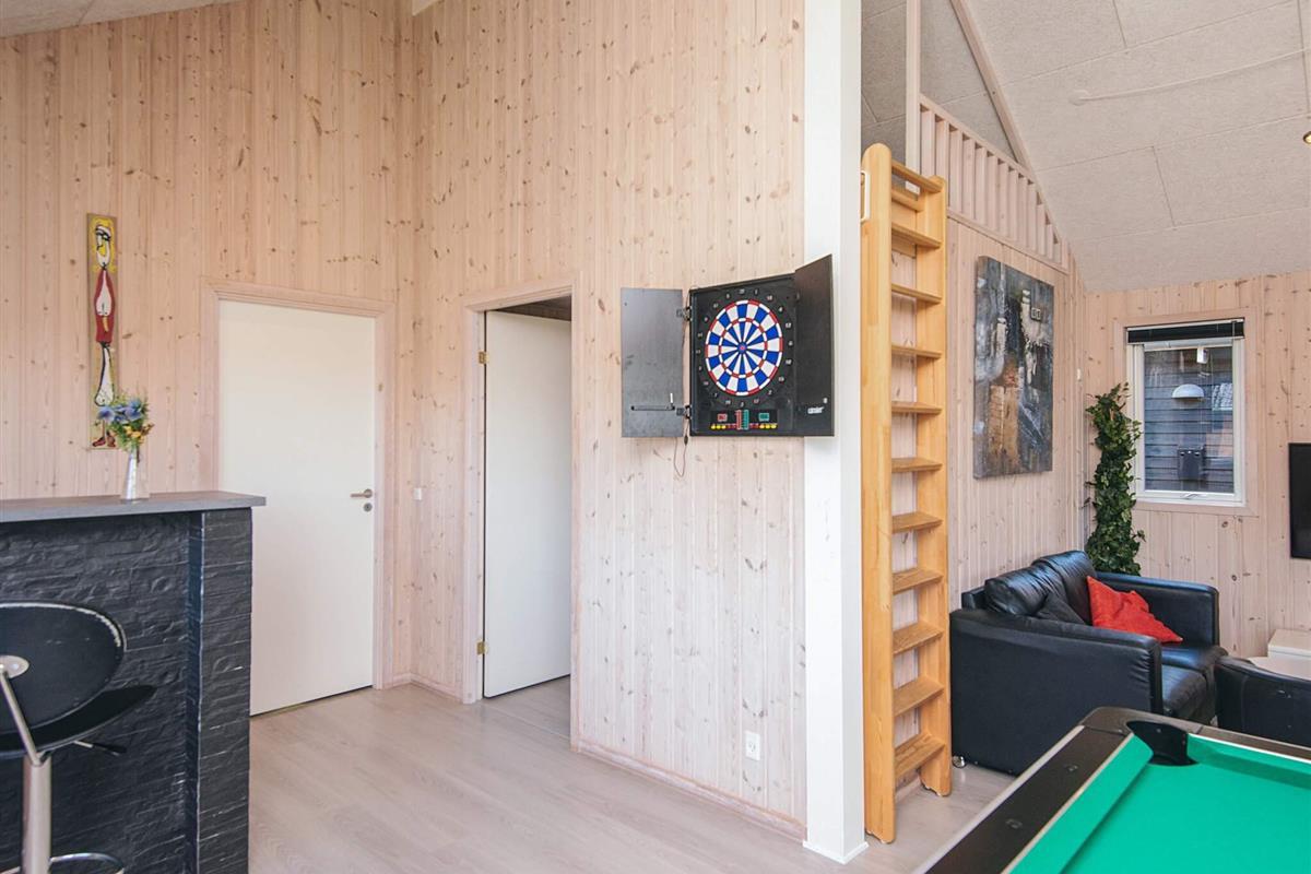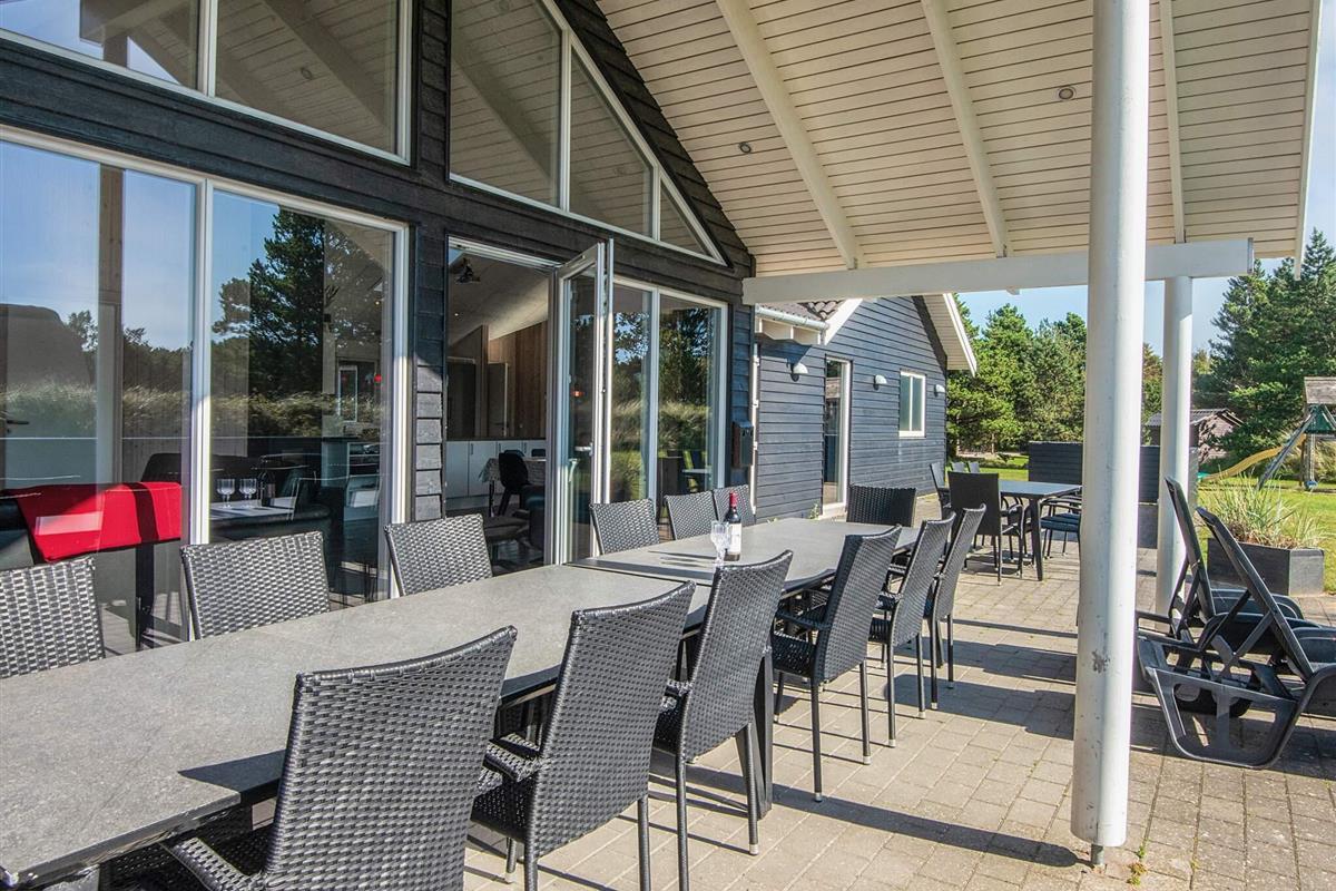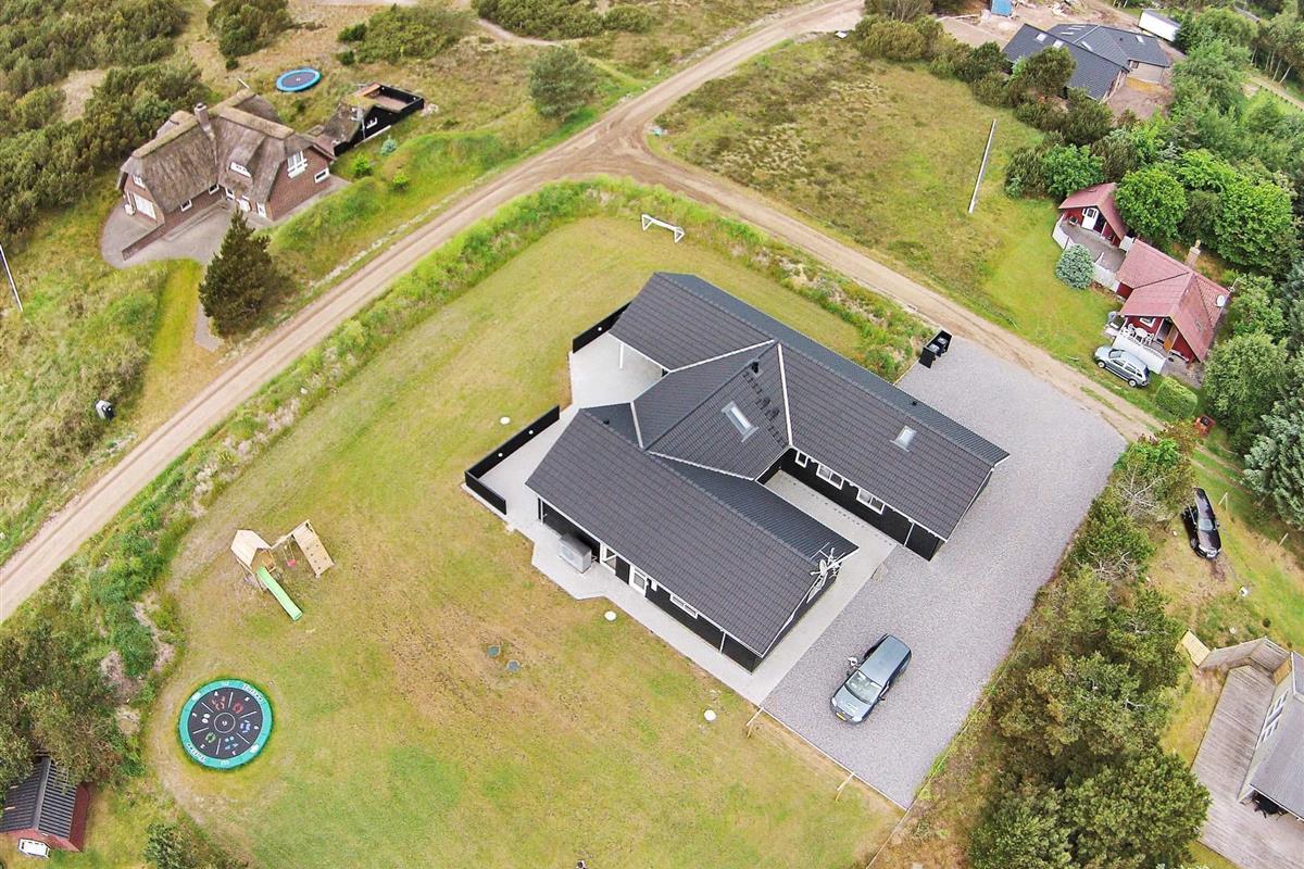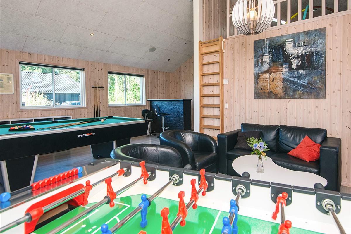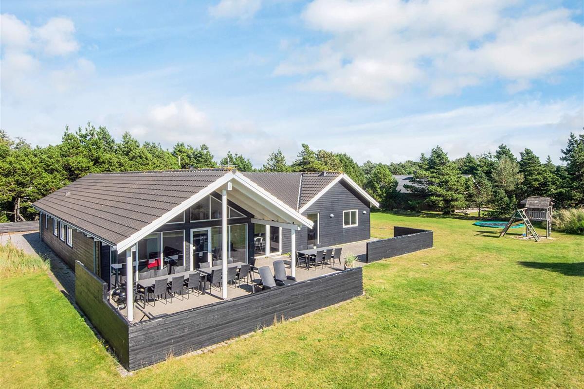 Gut durchdachtes Aktivitätsferienhaus auf einem windgeschützten Naturgrundstück in den Dünen. Der nahe Sandstrand ist, ebenfalls wie der lebhafte Ort Blåvand, zu Fuß gut erreichbar. Das architektonisch interessante Haus ist gut aufgeteilt und eingerichtet und bietet Platz für bis zu 18 Personen. Es gibt drei Badezimmer, sieben Schlafzimmer und einen großen Hems/Schlafboden - alle modern und gut eingerichtet. Fernsehen kann man im Wohnzimmer, im Aktivitätsraum und auf dem Hems. Weiterhin gibt es einen Projektor im Küchen-Aufenthaltsbereich. Spielkonsole für Wii U sowie PlayStation3 vorhanden.