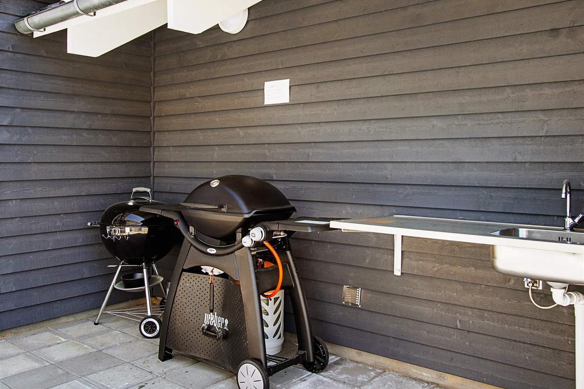 Außenküche mit Spüle und einen Gasgrill. Für Kinder stehen Schaukeln