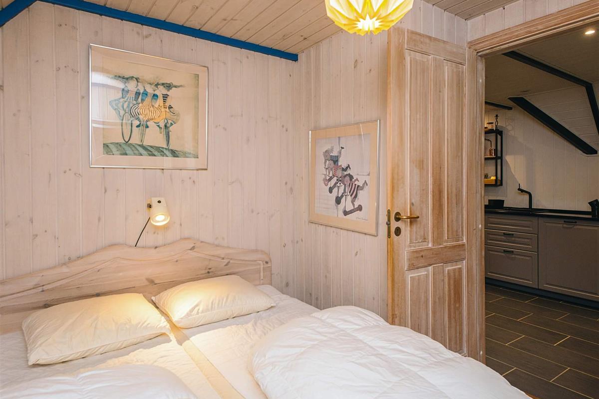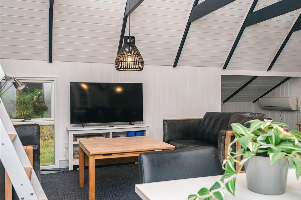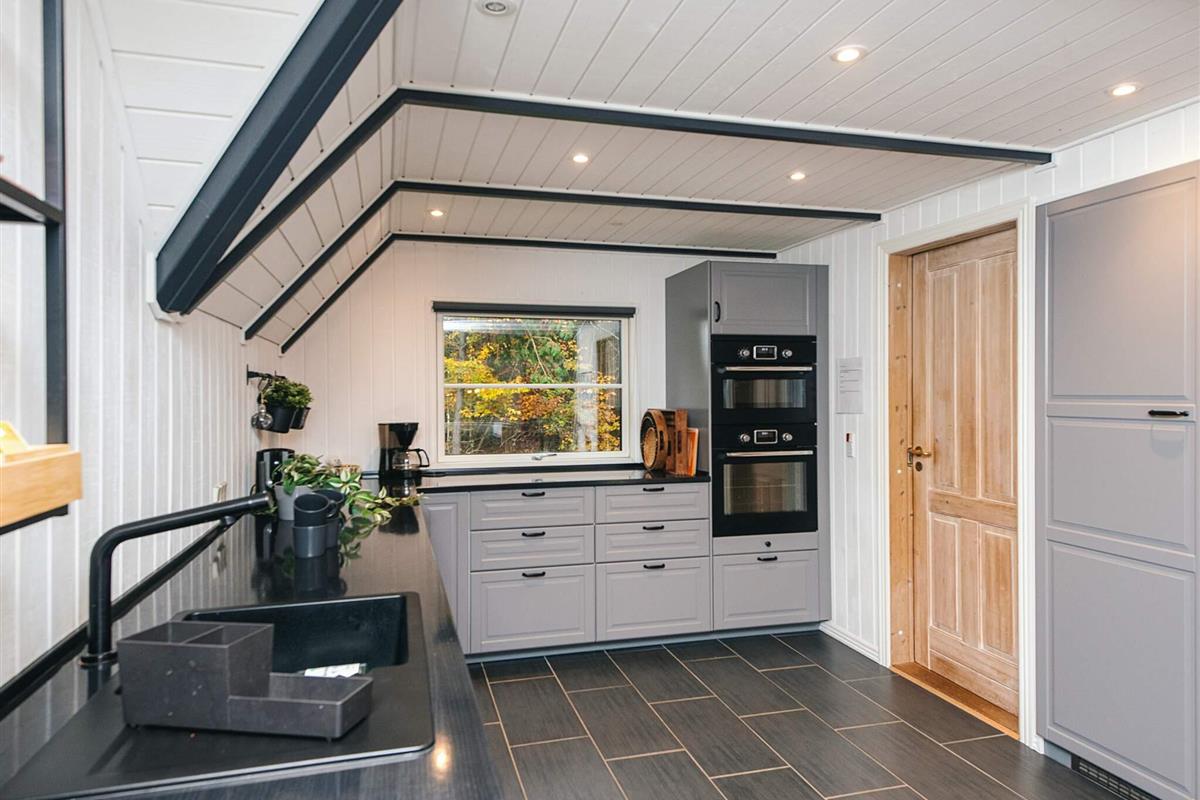 Im Wohnzimmer, mit offener Decke bis zum First und sichtbaren Balken, steht auch ein Holzofen für gemütliche Atmosphäre bereit. Das Wohnzimmer ist mit bequemem Mobiliar ausgestattet. Großes TV-Paket mit Viaplay. Von hier gelangt man hinaus auf eine gemütliche Terrasse. Im Haus zudem Hochstuhl und Kinderbett vorhanden.