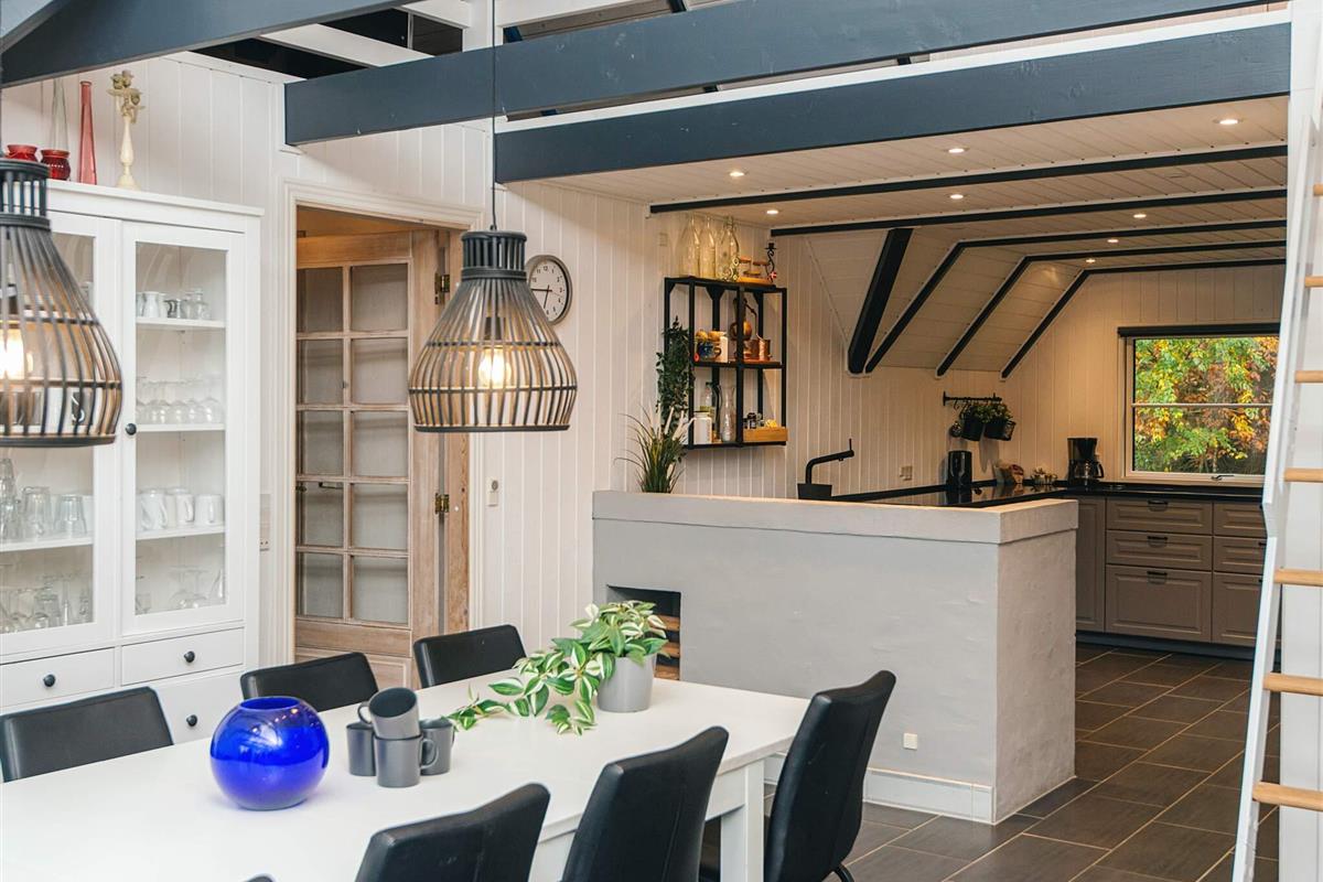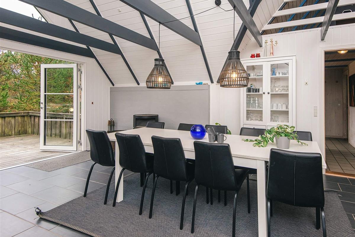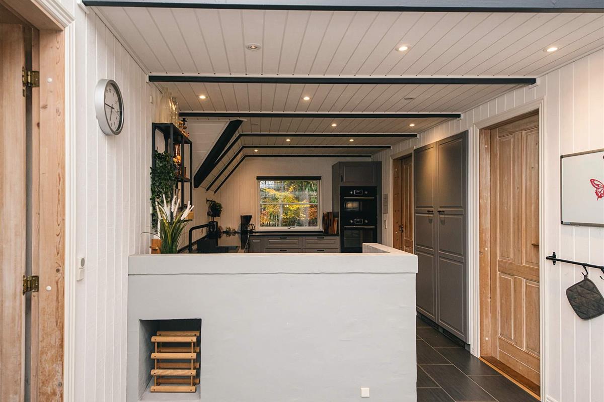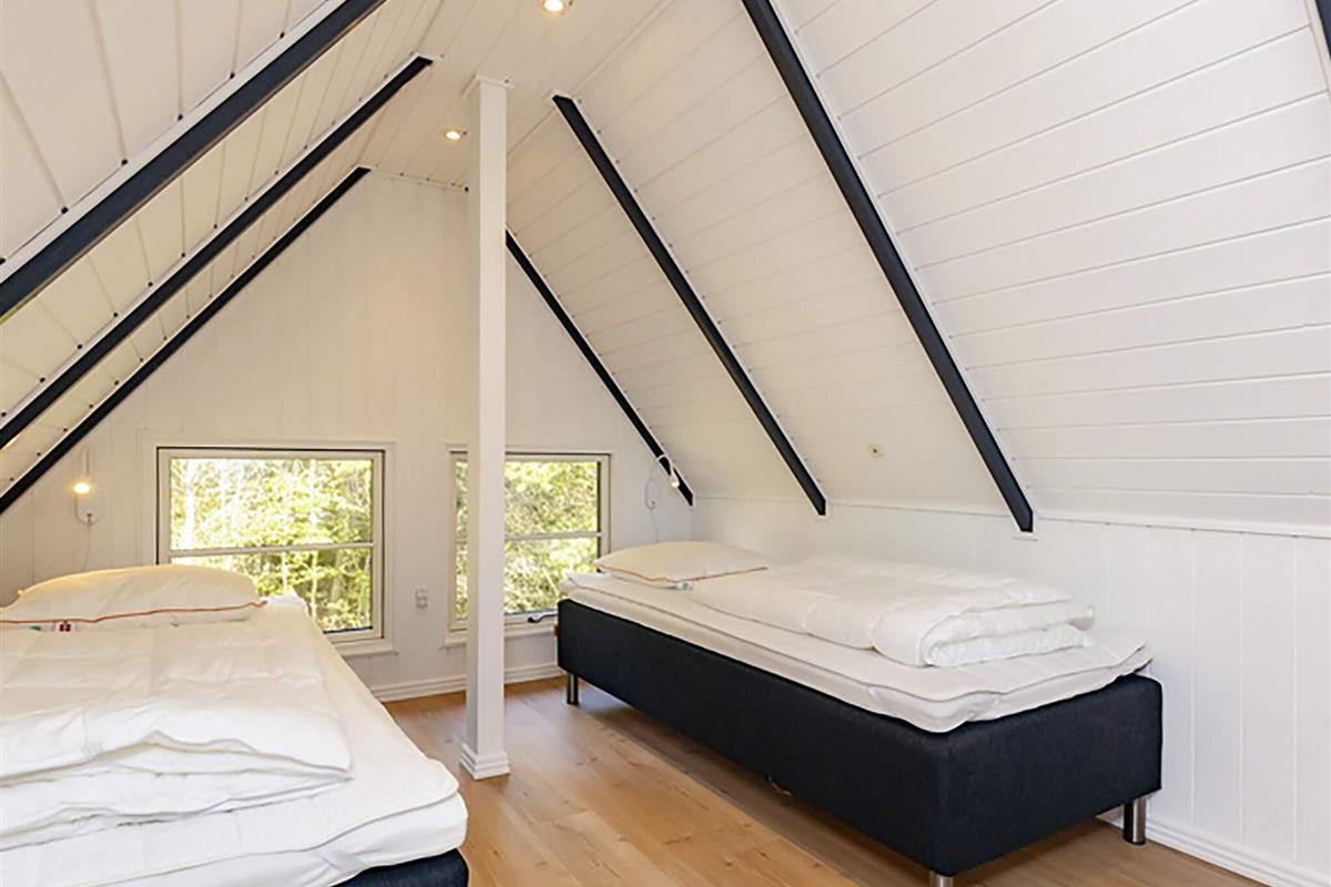 Im Wohnzimmer, mit offener Decke bis zum First und sichtbaren Balken, steht auch ein Holzofen für gemütliche Atmosphäre bereit. Das Wohnzimmer ist mit bequemem Mobiliar ausgestattet. Großes TV-Paket mit Viaplay. Von hier gelangt man hinaus auf eine gemütliche Terrasse. Im Haus zudem Hochstuhl und Kinderbett vorhanden.