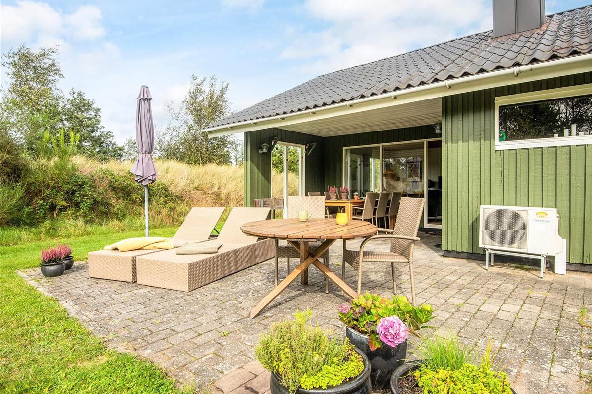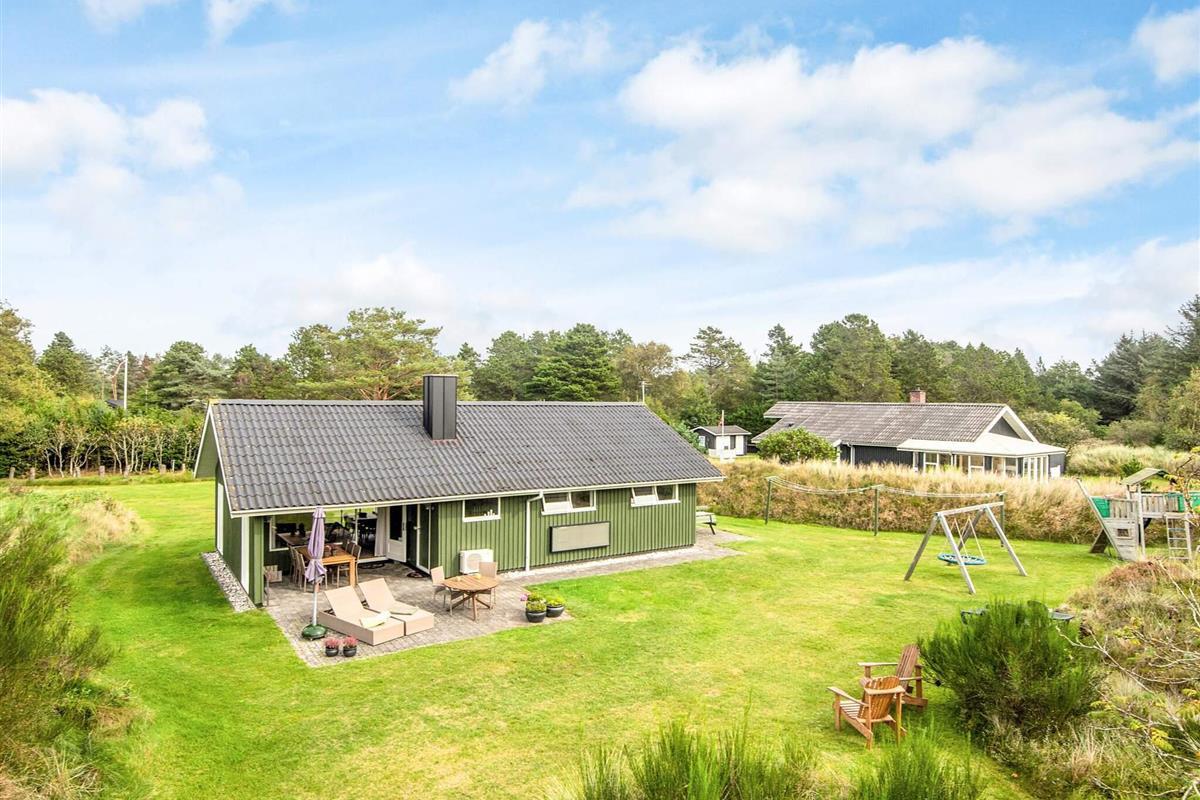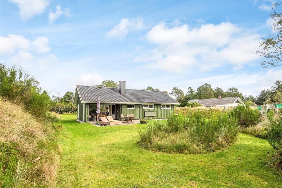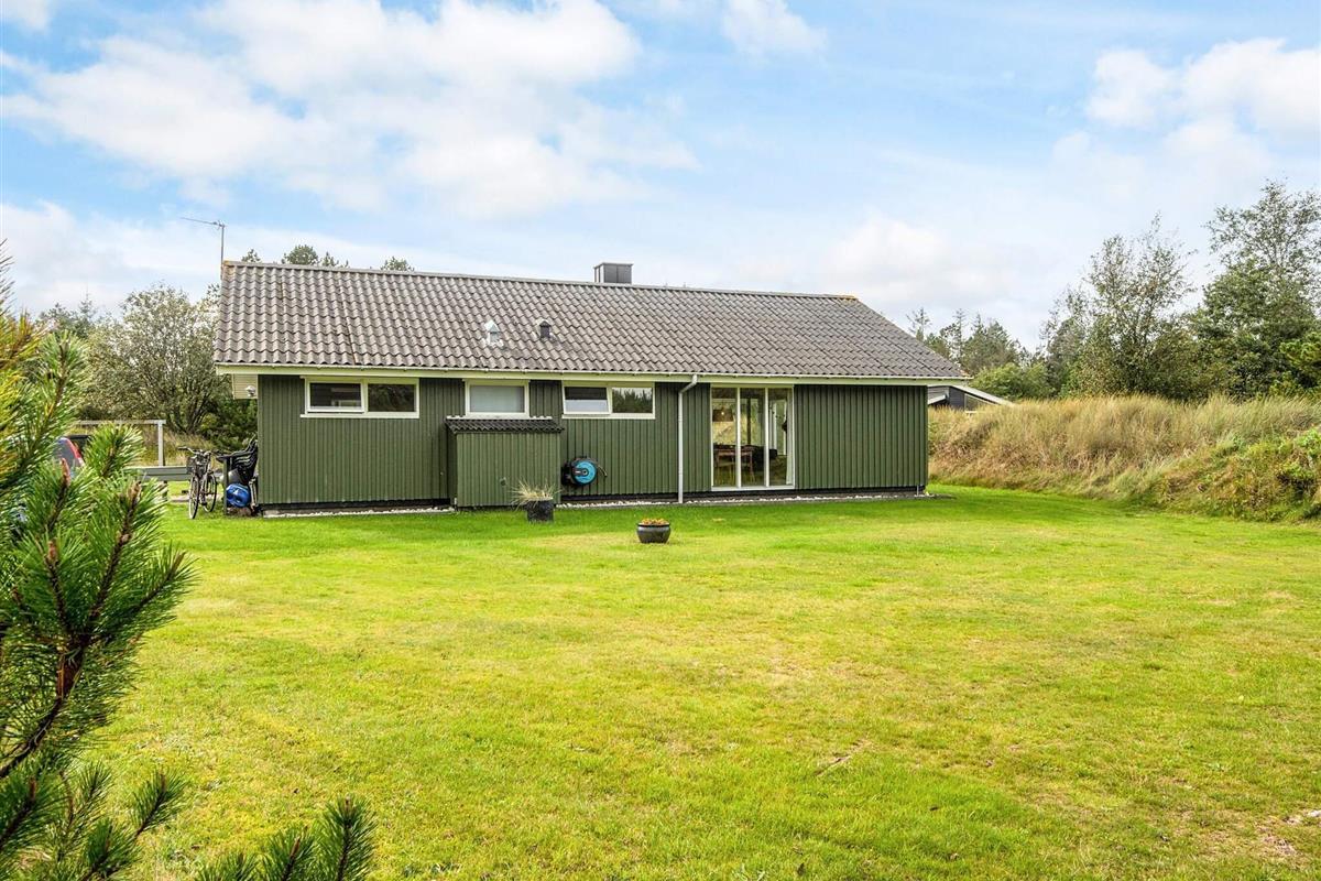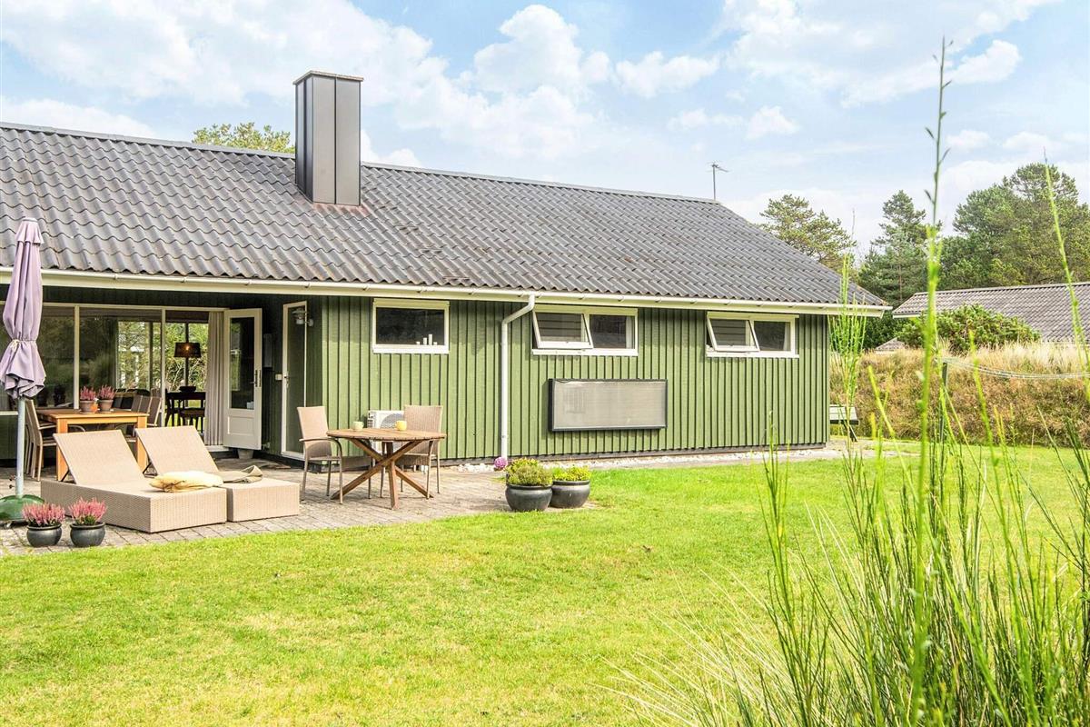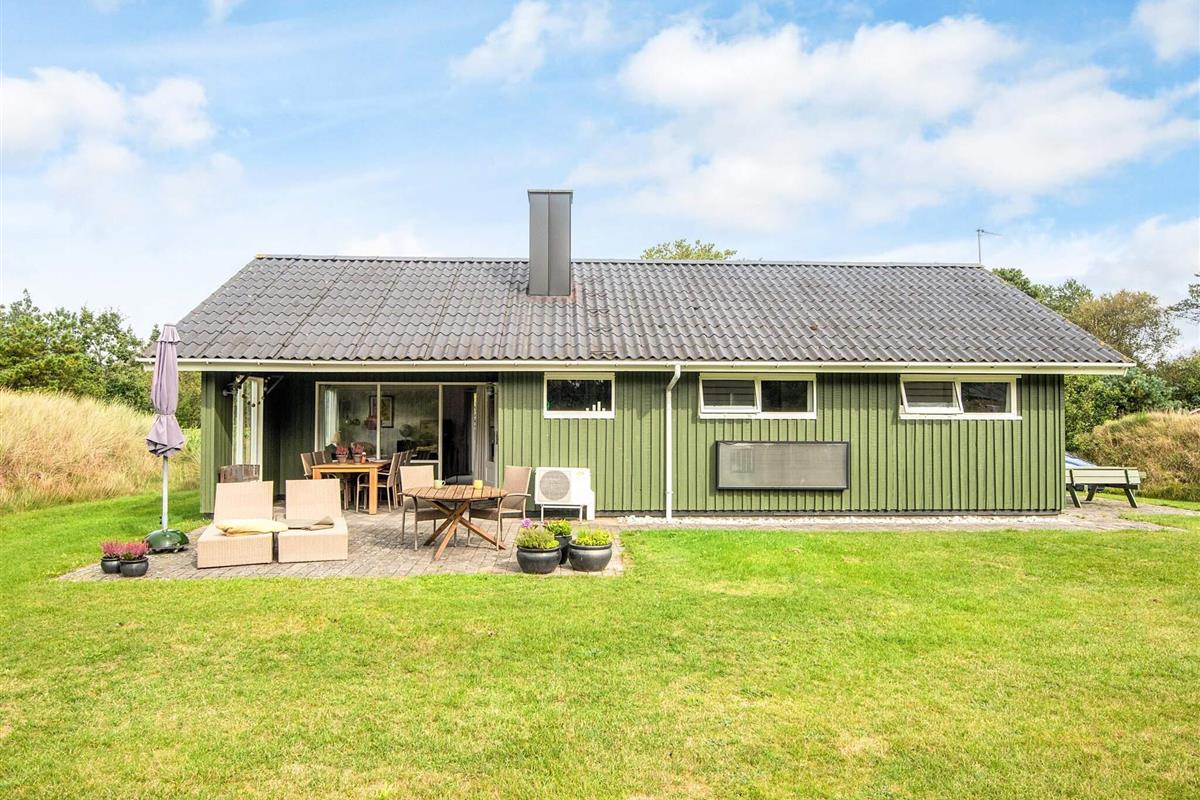 Das schöne Ferienhaus in Blavand mit einem großen Naturgrundstück hat eine sehr ruhige Lage. Die helle Küche ist in direkter Verbindung mit dem Wohnzimmer. Deshalb können Sie, auch wenn Sie kochen, zusammen mit Ihrer Familie sein. Im Wohnzimmer finden Sie den Kaminofen, der an kälteren Tagen Wärme spendet und eine gemütliche Urlaubsstimmung verbreitet. Das Wohnzimmer hat Zugang zur großen Terrassen, auf der Sie ungeniert die Sonne genießen können. Ein Teil von der Terrasse ist überdacht, weshalb Sie auch an einen Regenwettertag draußen sitzen können. Das Ferienhaus hat 3 Schlafzimmer mit 1 Doppelbett, 2 Einzelbetten und 2 Etagenbetten. Auf dem Badezimmer finden Sie sowohl eine Waschmaschine als auch einen Wäschetrockner. Schönes und gemütliches Ferienhaus in Blavand mit kostenloser Endreiningung.Kleiner zusätzlicher Gefrierschrank im Schuppen