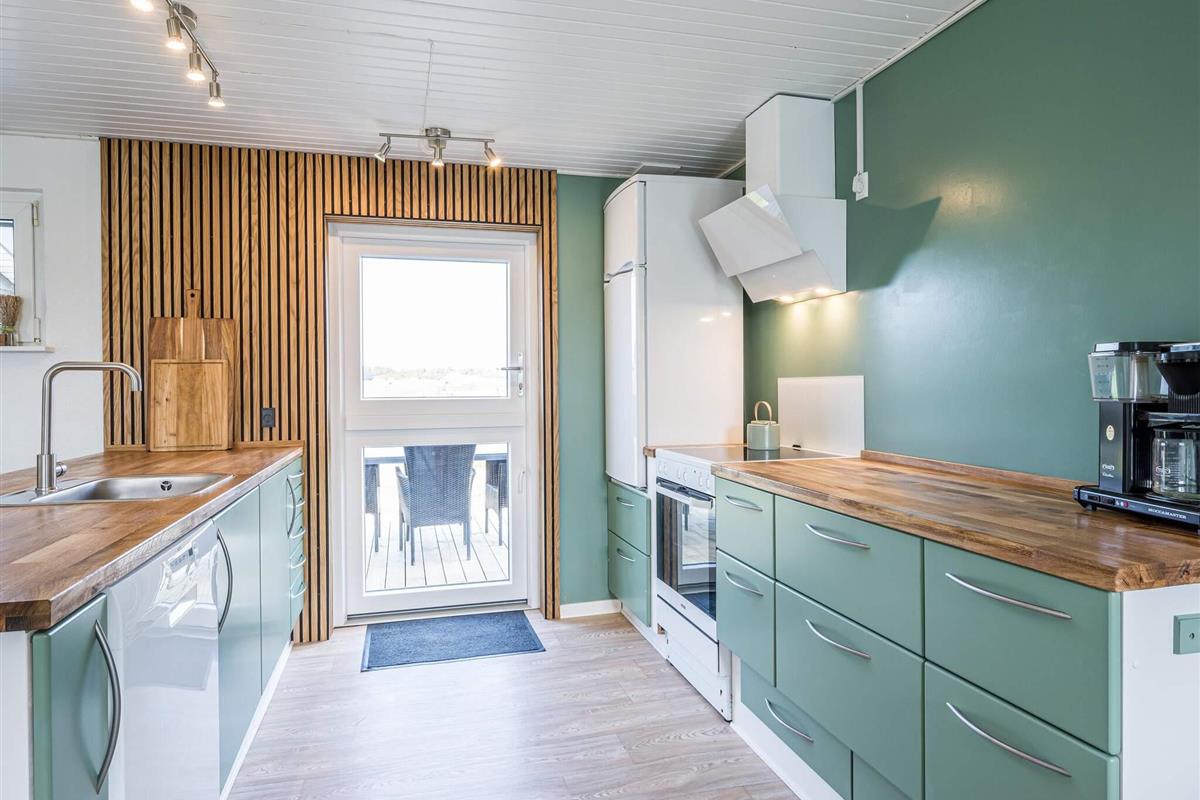 Im Inneren bietet der offene Küchen- und Wohnbereich einen einladenden Raum für das Familienleben. Ein Holzofen sorgt für gemütliche Abende, während eine klimafreundliche Wärmepumpe das ganze Jahr über für angenehme Temperaturen sorgt. Vom Wohnbereich aus gelangt man direkt auf eine überdachte Holzterrasse mit bequemen Gartenmöbeln und Sonnenliegen. Von der Terrasse auf dem Deich genießen Sie einen atemberaubenden Panoramablick auf die umliegende Küstenlandschaft.