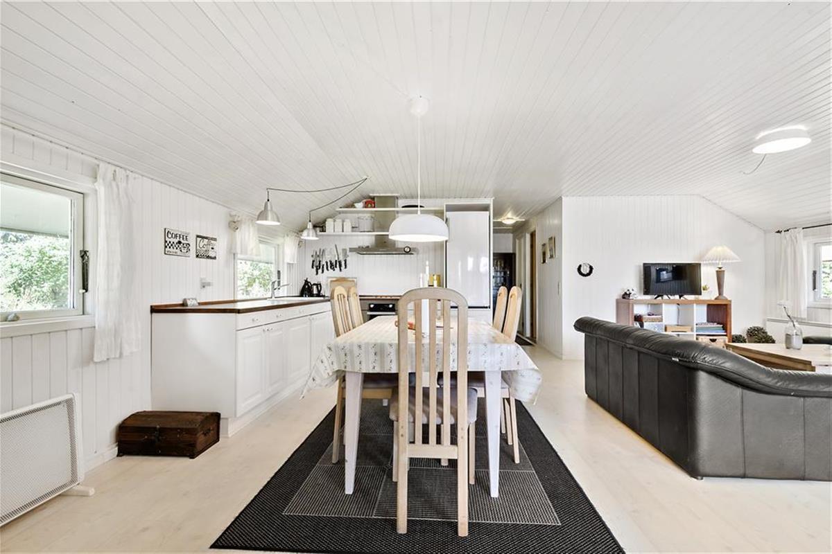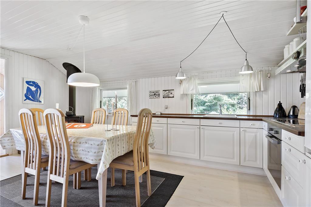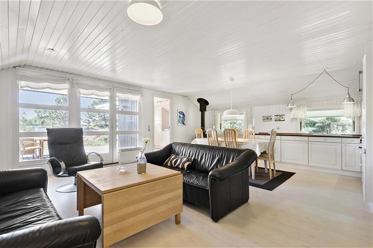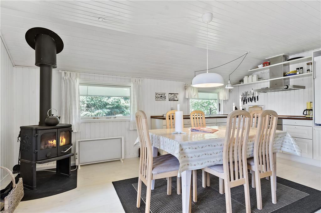 Wenn Sie die Terrasse des Ferienhauses betreten, können Sie bereits die gemütliche Atmosphäre wahrnehmen, die das ganze Haus ausstrahlt. Das Haus ist gut eingerichtet mit einer Kombination aus Küche/Aufenthaltsraum und einem Wohnzimmer. Im Wohnzimmerteil gibt es auch eine schöne Bettnische, wo Sie einen Mittagsschlaf machen oder die Kinder drinnen spielen können. Im Aufenthaltsraum steht ein Kaminofen, der an kühlen Tagen eine angenehmen Wärme verbreitet. Der hintere Teil des Hauses ist mit einem Badezimmer mit Bodenheizung, zwei Zimmer mit Doppelbetten und einem Zimmer mit einem Schlafsofa ausgestattet.