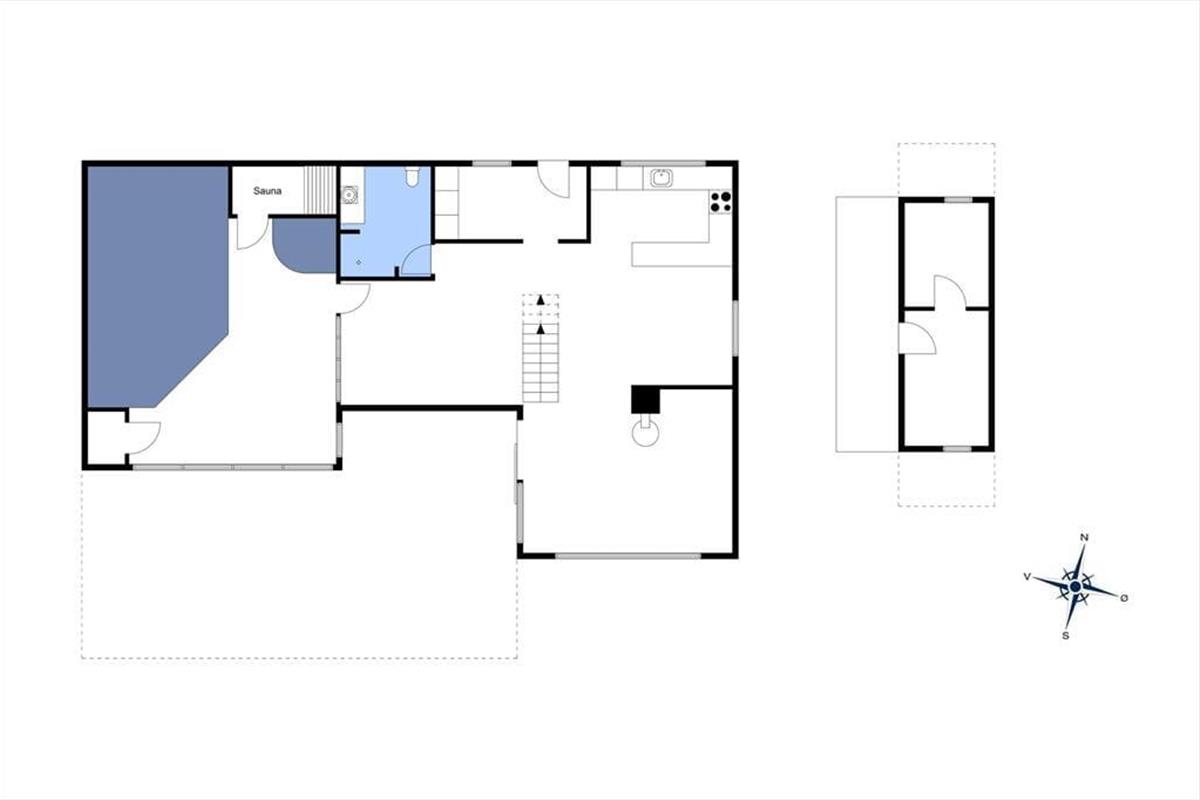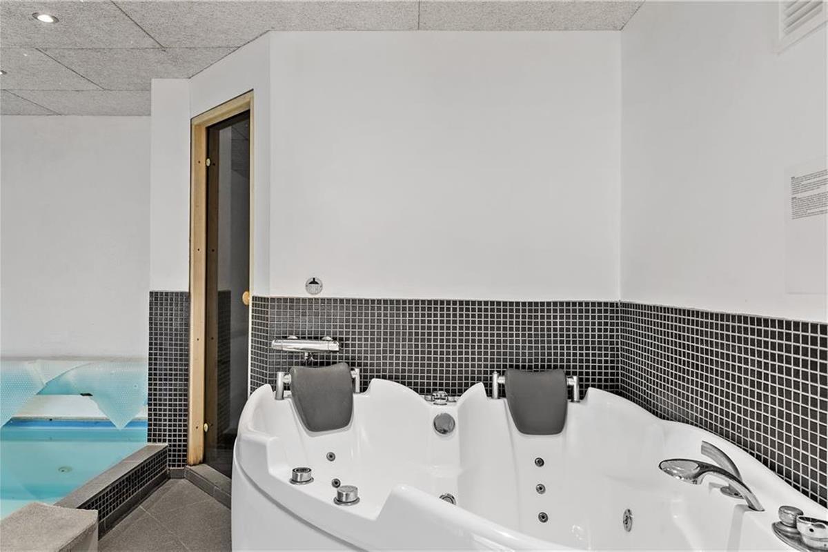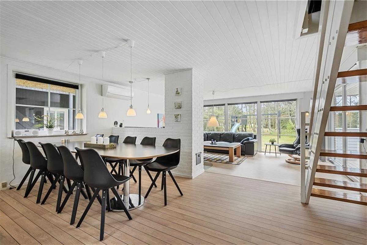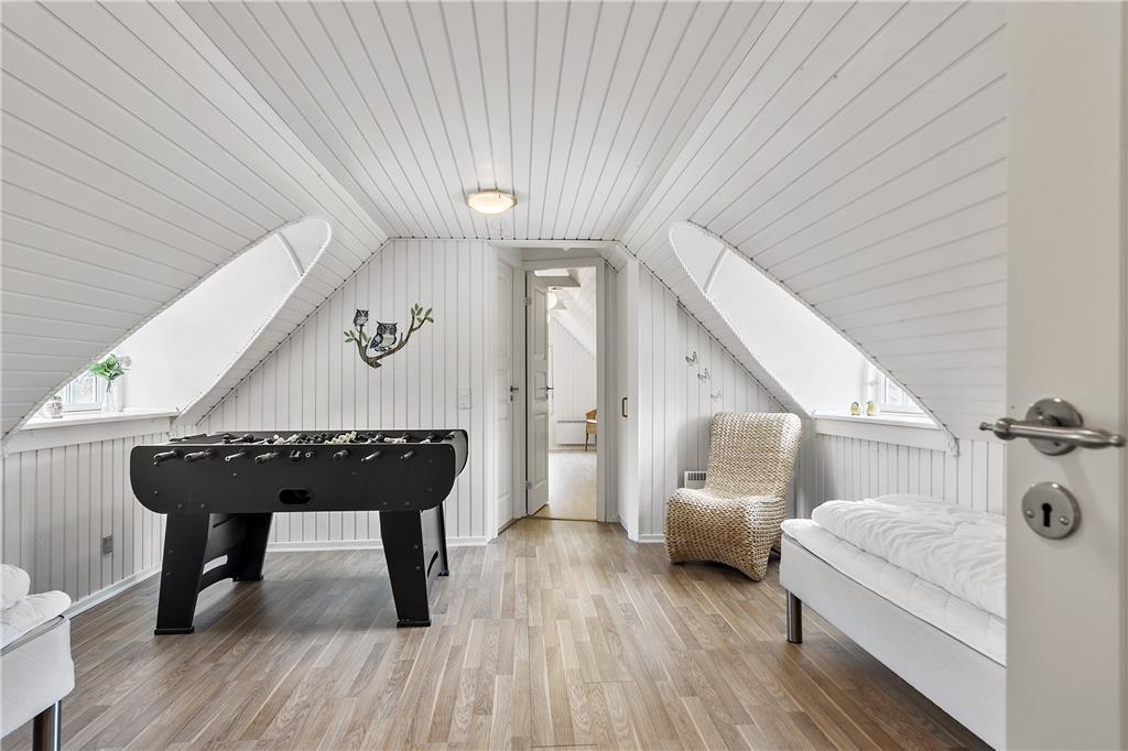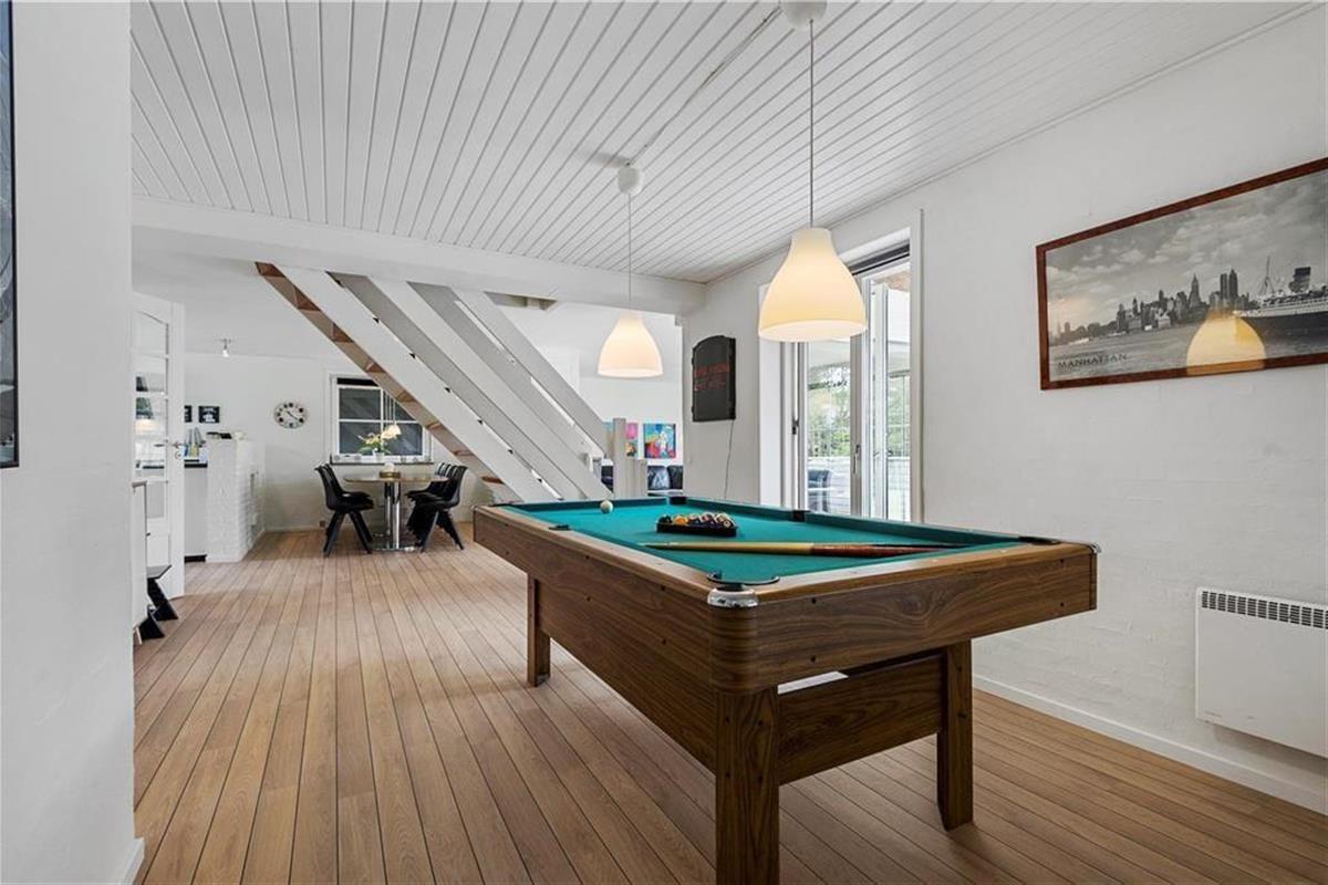Zweistöckiges Ferienhaus, in der unteren Etage befinden sich eine große Küche kombiniert mit dem Wohnzimmer. In diesem Teil des Hauses besteht auch die Möglichkeit Billard zu spielen. Im Poolraum erwarten Sie und Ihre Familie vergnügliche Stunden im Pool, Whirlpool und Sauna. Außerdem ist ein großes Badezimmer mit Duschnische vorhanden. Vom Wohnzimmer führt eine Treppe in den ersten Stock, in dem sich eine Schlafnische, ein Tischkicker, TV, PS3 und DVD befinden. Drei der fünf Schlafzimmer im ersten Stock sind mit jeweils einem Doppelbett ausgestattet, das vierte mit einem Doppel- und einem Einzelbett und das letzte ist ein Durchgangszimmer mit zwei Einzelbetten.