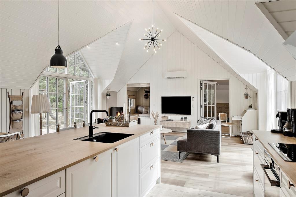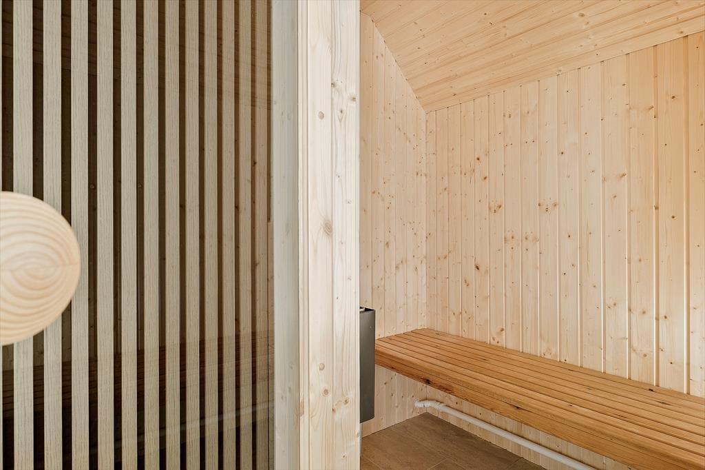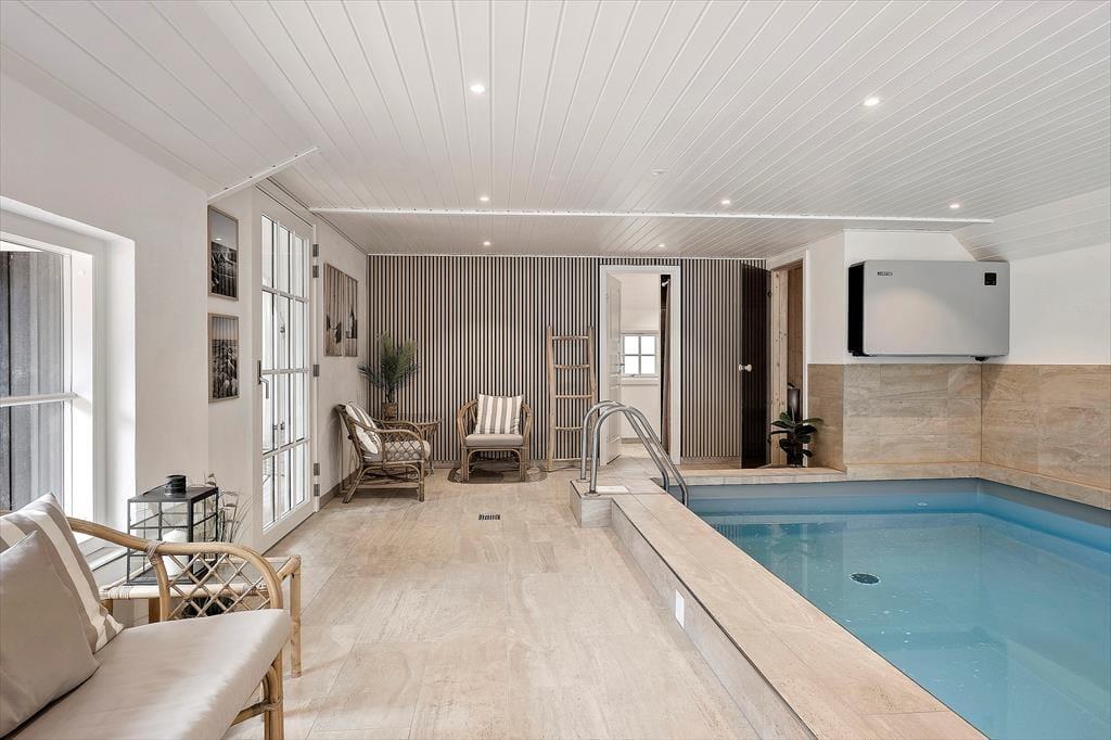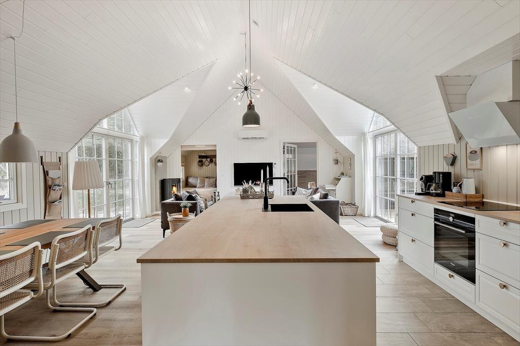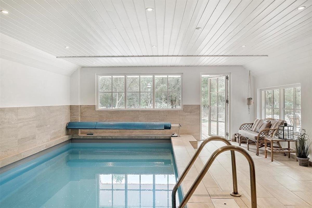 Bereits von außen überzeugt das Ferienhaus mit seinem eleganten Erscheinungsbild, das maßgeblich durch das Reetdach, die schwarze Holzfassade und die attraktiven Terrassen geprägt wird. Im Haus erwartet Sie nach der gelungenen Renovierung eine helle, leichte Wohnatmosphäre. Das gesamte Objekt wurde mit liebevoller Hand im geschmackvollen, klassischen Ferienhausstil eingerichtet. Die vier ansprechenden Schlafräume liegen zusammen am westlichen Hausende. Hier befinden sich außerdem zwei Duschbadezimmer und ein geräumiger Hauswirtschaftsbereich mit einer Waschmaschine und einem Wäschetrockner. Der Aufenthaltsraum, der den Wohnraum und die Küche offen in sich vereint, bildet das Herzstück des Hauses. In diesem wunderschönen Raum werden Sie viele gemeinsame Stunden bei der Zubereitung der Mahlzeiten, beim Essen am Esstisch und während gemütlicher Runden in der Polstersitzgruppe verleben. Für ein Nickerchen bietet sich die gemütliche Schlafnische an. Der Kaminofen verzaubert mit schönster Ferienhausstimmung. Vom Wohnraum blicken Sie in den Wellnessbereich. Neben dem Pool stehen Ihnen schöne Sitzgelegenheiten zur Verfügung. Vom Poolbereich gelangen Sie in eine Sauna und in das dritte Badezimmer, das ebenso hell und schön gestaltet ist, wie die anderen Räumlichkeiten.