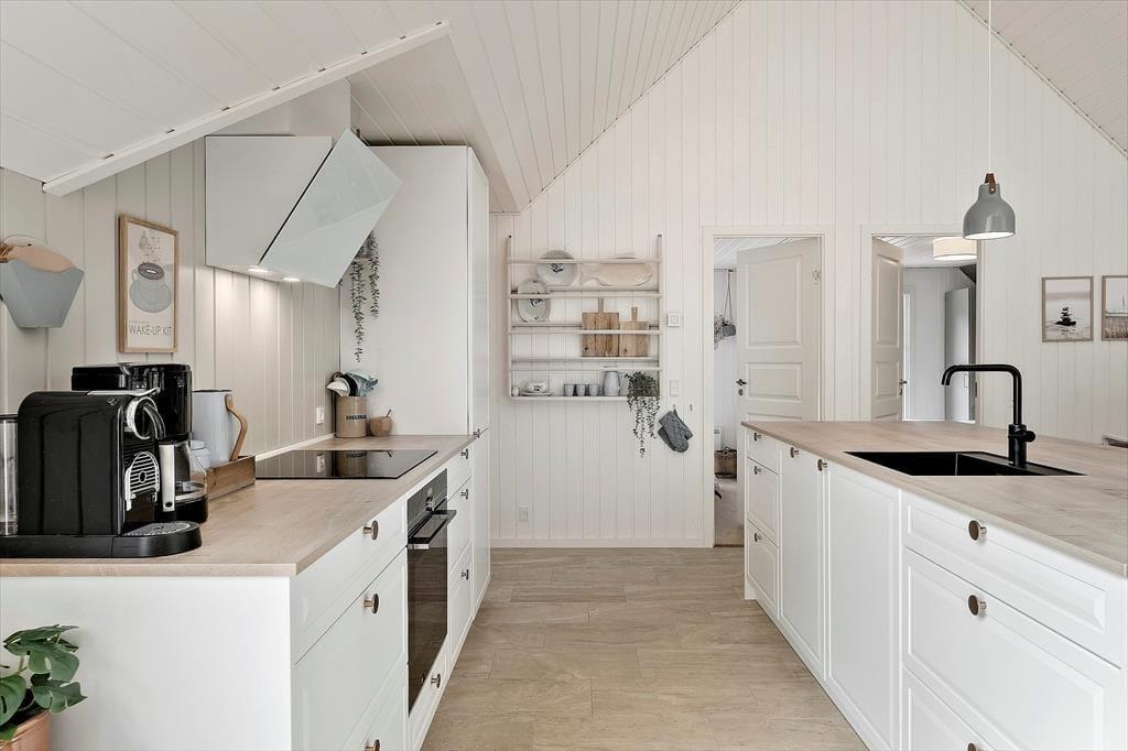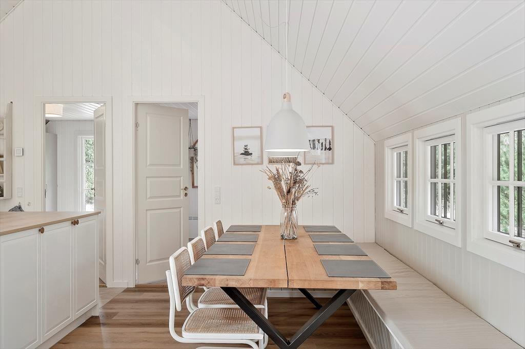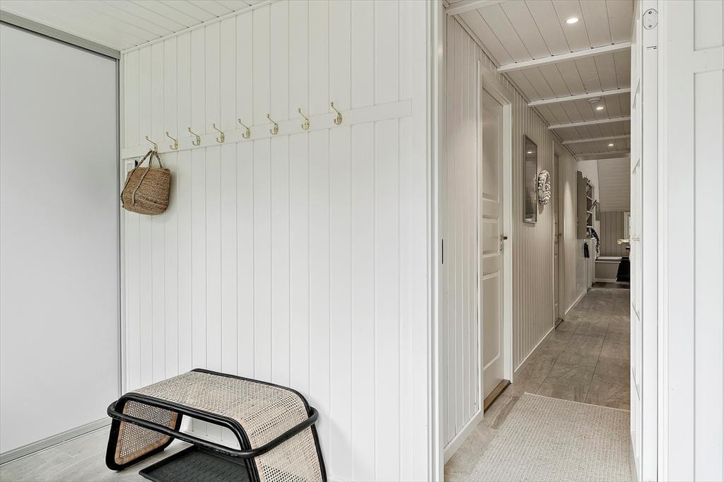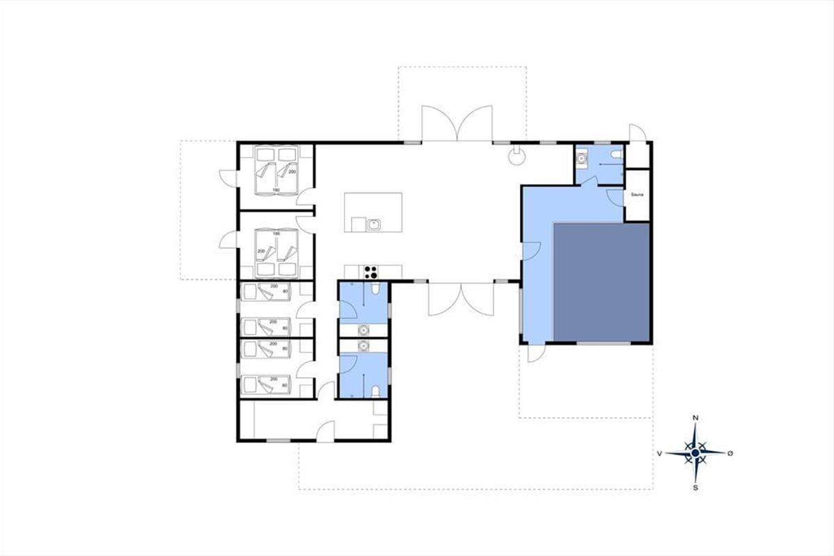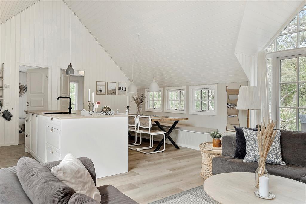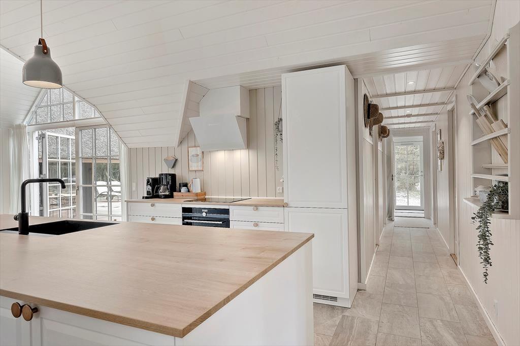 Bereits von außen überzeugt das Ferienhaus mit seinem eleganten Erscheinungsbild, das maßgeblich durch das Reetdach, die schwarze Holzfassade und die attraktiven Terrassen geprägt wird. Im Haus erwartet Sie nach der gelungenen Renovierung eine helle, leichte Wohnatmosphäre. Das gesamte Objekt wurde mit liebevoller Hand im geschmackvollen, klassischen Ferienhausstil eingerichtet. Die vier ansprechenden Schlafräume liegen zusammen am westlichen Hausende. Hier befinden sich außerdem zwei Duschbadezimmer und ein geräumiger Hauswirtschaftsbereich mit einer Waschmaschine und einem Wäschetrockner. Der Aufenthaltsraum, der den Wohnraum und die Küche offen in sich vereint, bildet das Herzstück des Hauses. In diesem wunderschönen Raum werden Sie viele gemeinsame Stunden bei der Zubereitung der Mahlzeiten, beim Essen am Esstisch und während gemütlicher Runden in der Polstersitzgruppe verleben. Für ein Nickerchen bietet sich die gemütliche Schlafnische an. Der Kaminofen verzaubert mit schönster Ferienhausstimmung. Vom Wohnraum blicken Sie in den Wellnessbereich. Neben dem Pool stehen Ihnen schöne Sitzgelegenheiten zur Verfügung. Vom Poolbereich gelangen Sie in eine Sauna und in das dritte Badezimmer, das ebenso hell und schön gestaltet ist, wie die anderen Räumlichkeiten.