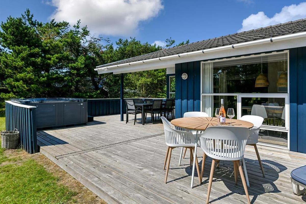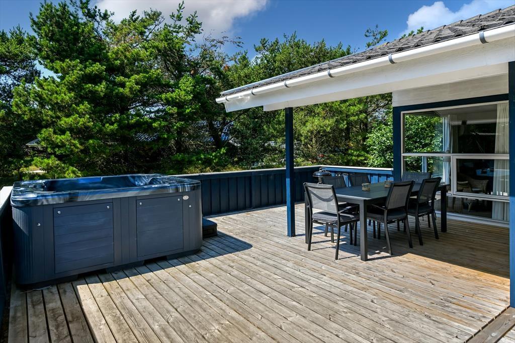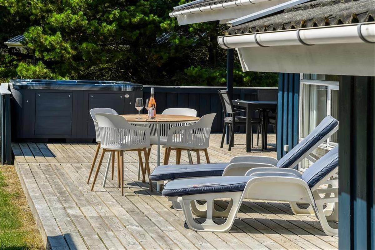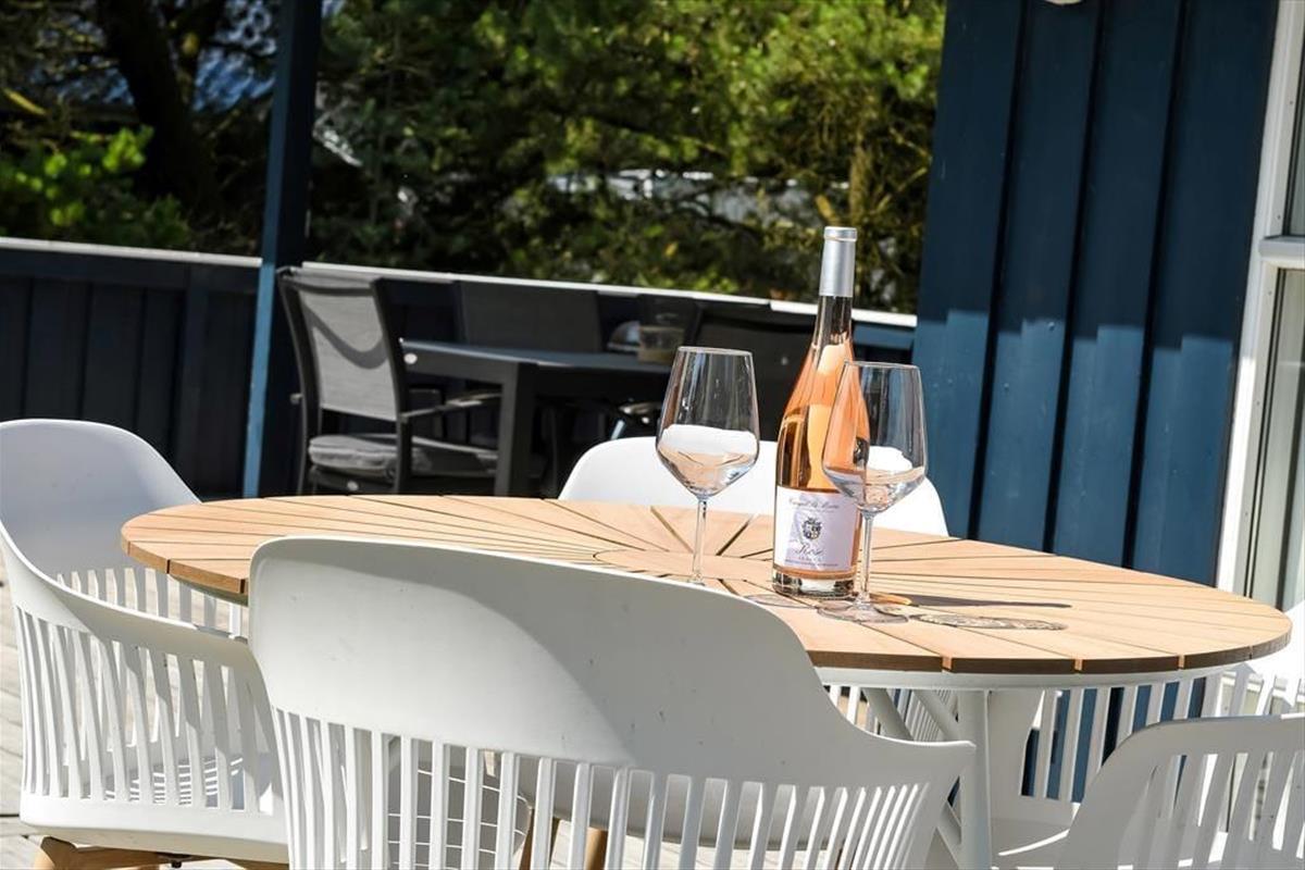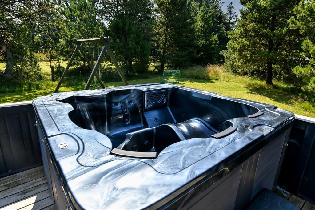 Das Leben als Genießer kann sich auch draußen auf der großen Holzterrasse des Ferienhauses abspielen. Hier können Sie sich sonnen oder unter dem Sonnenschirm eine Siesta machen, und am Abend können Sie sich mit einem Grill und guten Abendessen auf dem überdachten Teil der Terrasse verwöhnen – vielleicht während die Kinder vor dem Schlafengehen auf dem Naturgrundstück spielen, das mit einer Schaukel, einem Spielturm, einem Sandkasten und einem Fußballtor ausgestattet ist. Ein perfekter Abschluss des Tages ist ein Whirlpool im Freien, denn es gibt nichts Schöneres, als sich in einem warmen Bad mit freiem Blick zurückzulehnen.