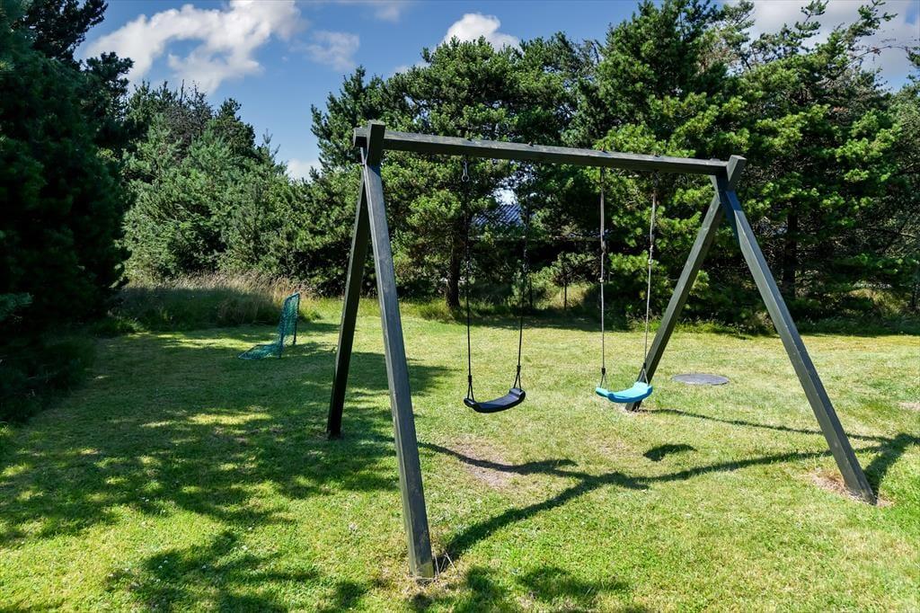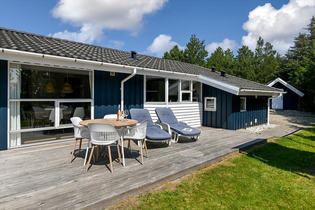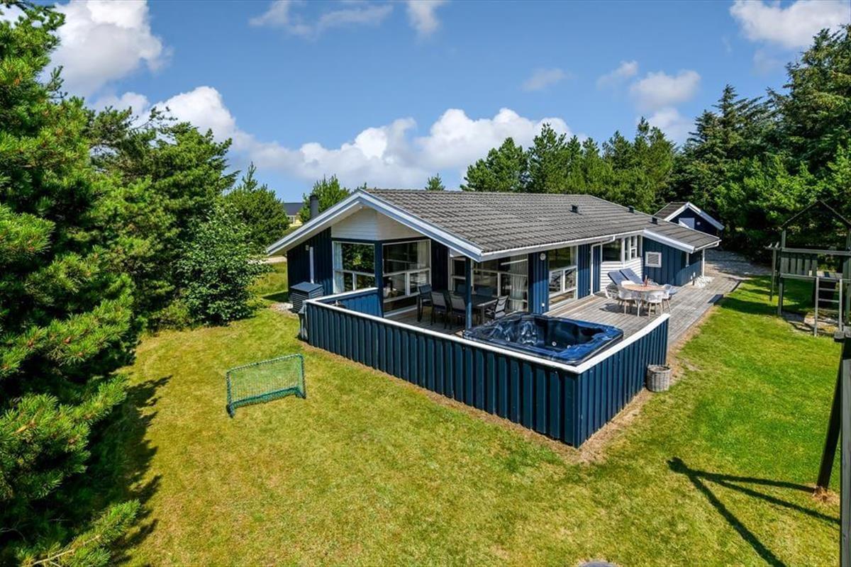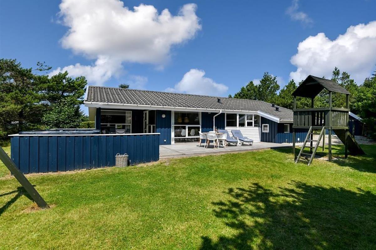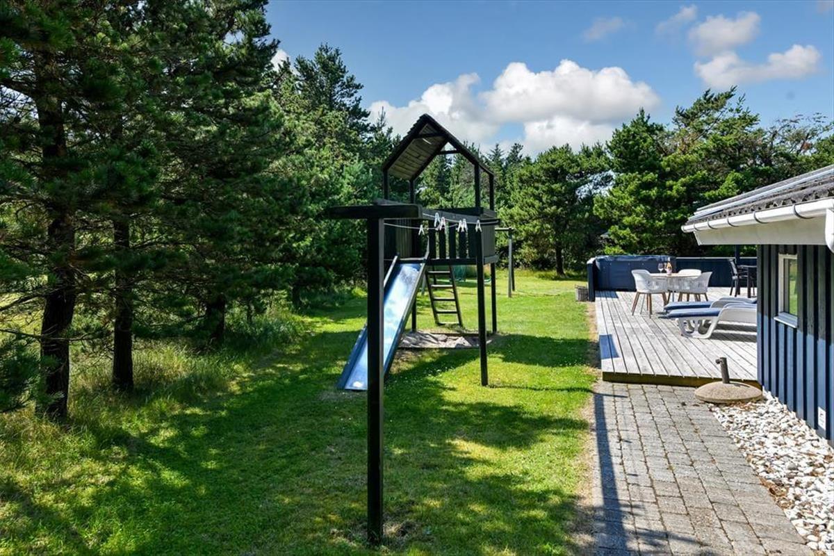 Das Leben als Genießer kann sich auch draußen auf der großen Holzterrasse des Ferienhauses abspielen. Hier können Sie sich sonnen oder unter dem Sonnenschirm eine Siesta machen, und am Abend können Sie sich mit einem Grill und guten Abendessen auf dem überdachten Teil der Terrasse verwöhnen – vielleicht während die Kinder vor dem Schlafengehen auf dem Naturgrundstück spielen, das mit einer Schaukel, einem Spielturm, einem Sandkasten und einem Fußballtor ausgestattet ist. Ein perfekter Abschluss des Tages ist ein Whirlpool im Freien, denn es gibt nichts Schöneres, als sich in einem warmen Bad mit freiem Blick zurückzulehnen.