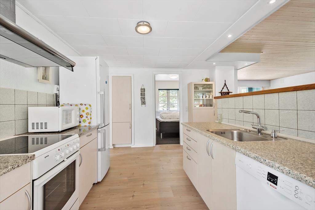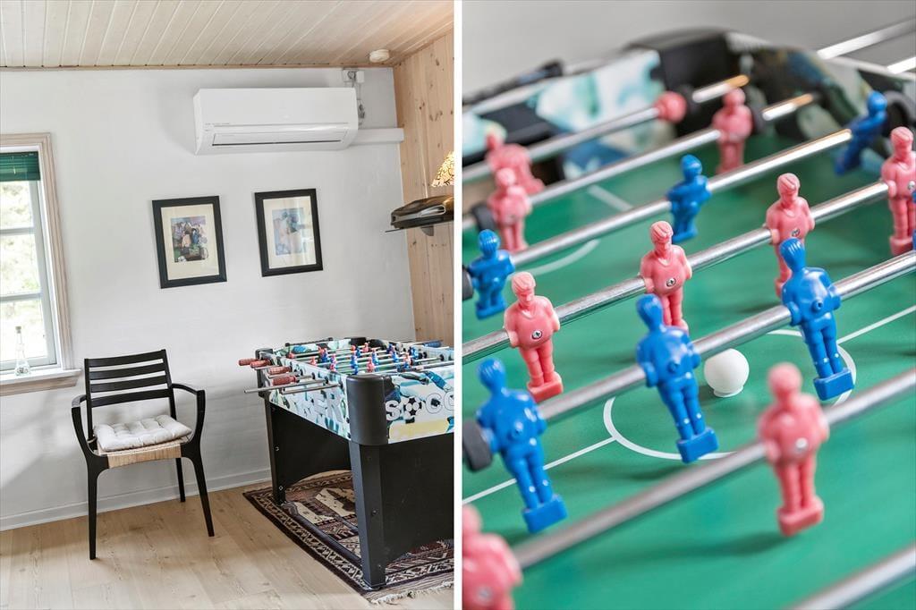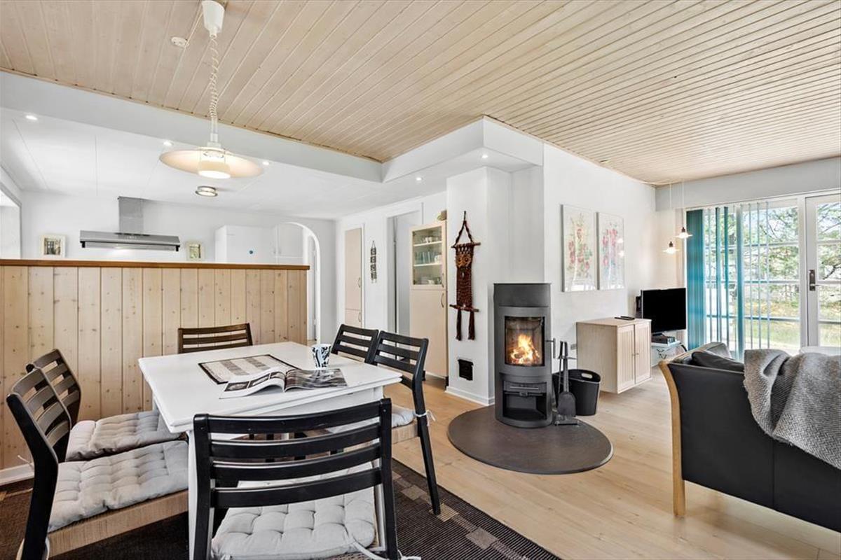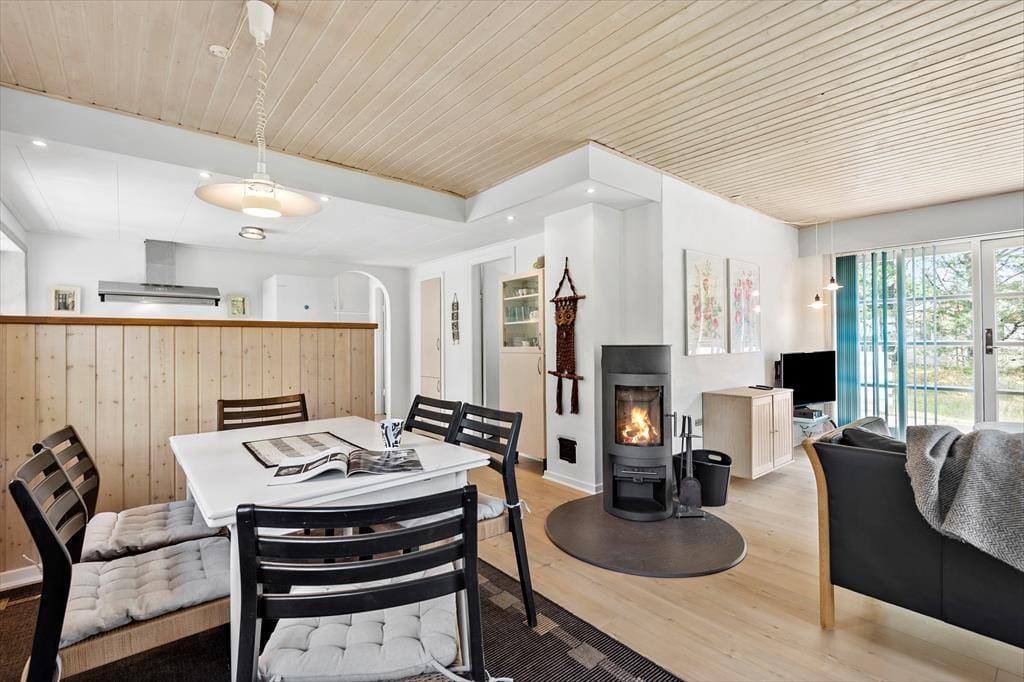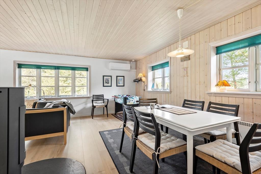 Wenn Sie nicht gerade Blåvand erkunden oder das Sommerwetter am Strand genießen, werden Sie es sich gern in diesem schönen Haus gemütlich machen. Sämtliche Räumlichkeiten präsentieren sich hell und ansprechend. Dank der offenen Kombination aus Küche und Wohnraum genießen Sie viel gemeinsame Zeit - selbst dann, wenn Sie in der Küche das Essen zubereiten und der Rest der Familie am Esstisch spielt. Spaß und Abwechslung verspricht der Tischkicker, der zu manch familieninternem Turnier einlädt. Mit einem Maximum an Stimmung und Gemütlichkeit verwöhnt der im Wohnraum platzierte Kaminofen. Die Schlafplätze verteilen sich auf zwei gute Schlafräume. Ein Badezimmer mit einer Dusche und einer Waschmaschine ist vorhanden. Der geräumige Eingangsbereich mit großen Glaspartien fungiert als schöner Wintergarten.