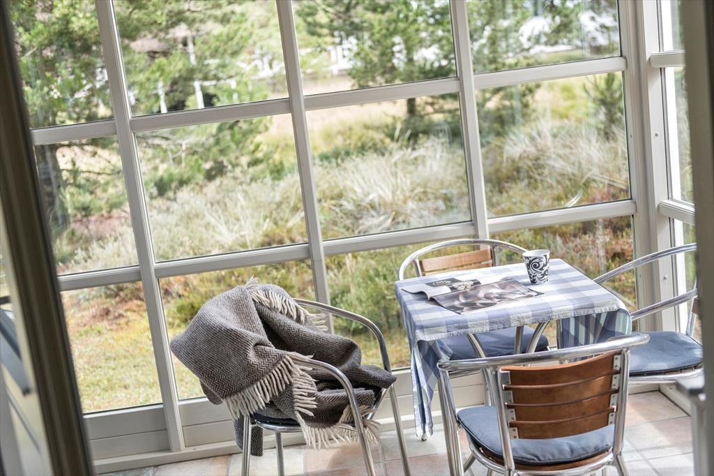 An kühlen, windigen Tagen werden Sie sich gern im Wintergarten aufhalten. Sobald die Sonne vom Himmel lacht, wird es Sie hinaus auf die Südterrasse ziehen. Die Terrasse ist direkt vom Wohnraum aus zugänglich, sodass das Servieren der Mahlzeiten im Freien zum Kinderspiel wird. Allabendlich lädt der hauseigene Grill zum stimmungsvollen Tagesausklang ein. Ans Ferienhaus schließt eine gute Grasfläche. Der Rest des großen Grundstücks ist naturbelassen.