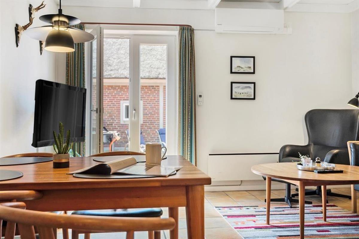 Die 62 m² große Erdgeschosswohnung befindet sich in einer reetgedeckten Wohnanlange. Jede Ferienwohnung verfügt über einen eigenen geschlossenen Sonnenhof. Im Inneren der Wohnung erwartet Sie eine schöne, einladende Atmosphäre. Die Raumaufteilung ist auf eine Belegung mit vier Personen zugeschnitten. Ihnen stehen zwei Schlafräume mit je einem Doppelbett und ein Badezimmer mit Dusche und Fußbodenheizung zur Verfügung. Die Küche beinhaltet neben einem Geschirrspüler alles, was Sie für die Zubereitung Ihrer Mahlzeiten benötigen. Dank der offenen Wohnlösung genießen Sie selbst während der Zubereitung der Mahlzeiten die Nähe Ihrer Lieben. Der gemütlich eingerichtete Wohnraum verfügt über einen Essplatz, eine Polstersitzgarnitur und einen Flachbild-TV.