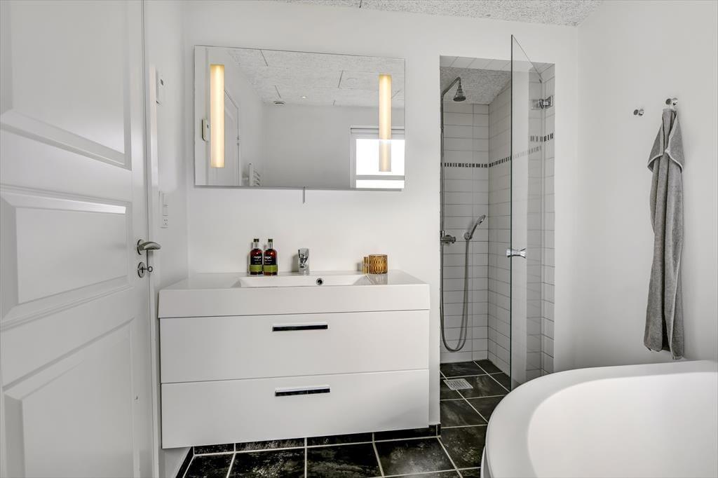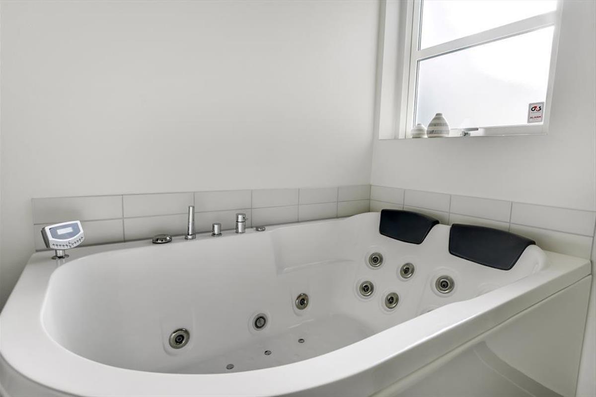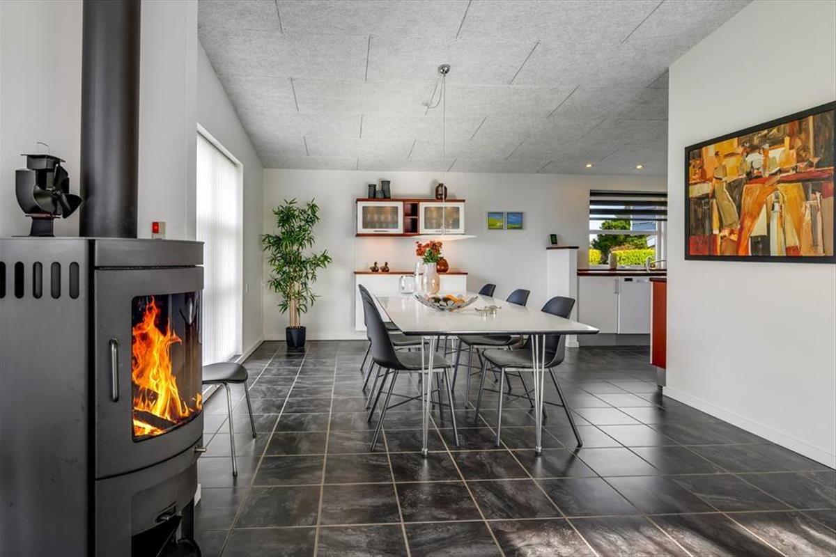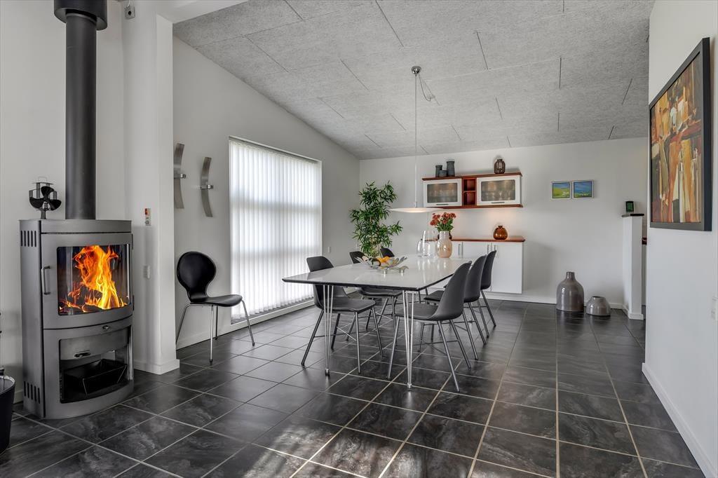 Im Inneren des Hauses ist die prägende Farbe Weiß. Die weißen Wände und das weiße Interieur bilden einen reizvollen Kontrast zum dunklen Fußboden. Vom Eingangsbereich gelangst du in die drei guten Schlafräume und in das ansprechende Badezimmer. Der Flur führt dich weiter in den guten Hauswirtschaftsbereich und in ein zweites Badezimmer. Letztgenanntes verwöhnt mit einem tollen Whirlpool, der zu entspannten Momenten voller Wellnessflair einlädt. Zum zentralen Sammelpunkt deiner Familie wird im Nu der Wohnraum avancieren. In diesem Raum bereitet ihr die Mahlzeiten in der offenen Küche zu und genießt diese im Anschluss am Esstisch. Für gemütliche Runden mit einem unterhaltsamen Gesellschaftsspiel und für entspannte Stunden auf dem Sofa vor dem knisternden Kaminofen ist er ebenfalls bestens geeignet.