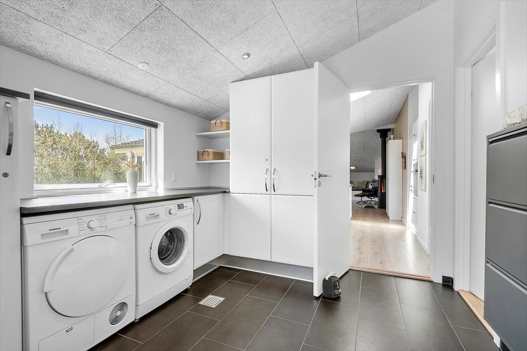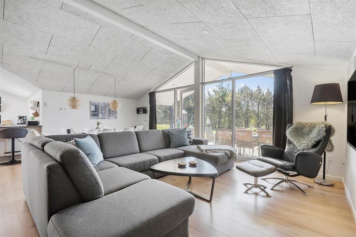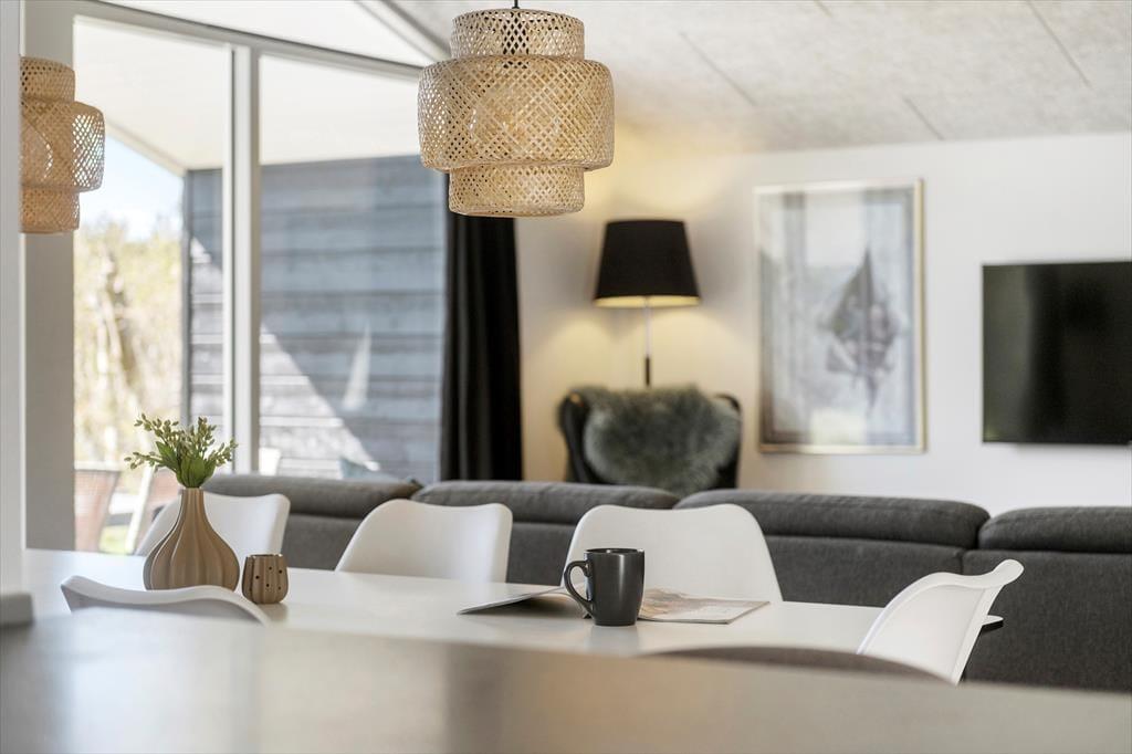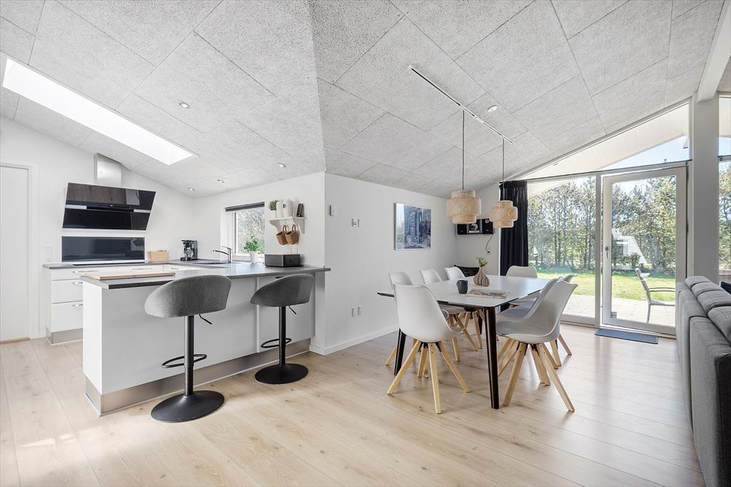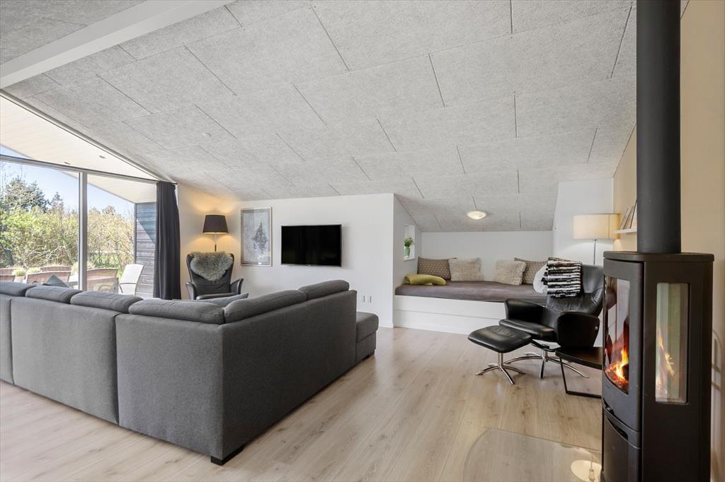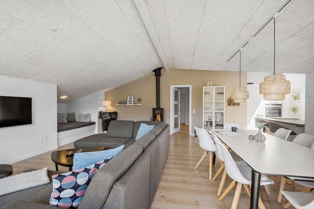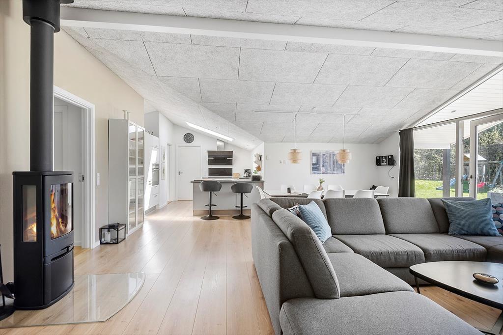 Bei einem modernen Qualitätshaus wie diesem darfst du dich auf einen geräumigen und komfortablen Rahmen für gemütliche Stunden im Familienkreis freuen. Sämtliche Räume überzeugen mit einer einladenden Einrichtung. Die Akustikdecken, der Kaminofen und der bezaubernde Tageslichteinfall tragen maßgeblich zur ansprechenden Wohnatmosphäre bei. Die Aufteilung der Wohnfläche ist wohldurchdacht. Da sich die vier Schlafräume und zwei Badezimmer auf zwei Schlafbereiche verteilen, eignet sich das Ferienhaus hervorragend für den gemeinsamen Urlaub zweier befreundeter Familien. Traumhaft entspannte Momenten voller Wellnessflair versprechen der Whirlpool und die Sauna im größeren der beiden Badezimmer. Die gemütliche Schlafnische im Wohnraum bietet sich wunderbar zum Lesen oder für ein kleines Nickerchen nach einer köstlichen Mahlzeit an. Die Mahlzeiten bereitest du in der schönen offenen Küche zu. Dank des Küchentresens und der Barhocker genießt du während der Essenszubereitung sicher häufig nette Gesellschaft.
