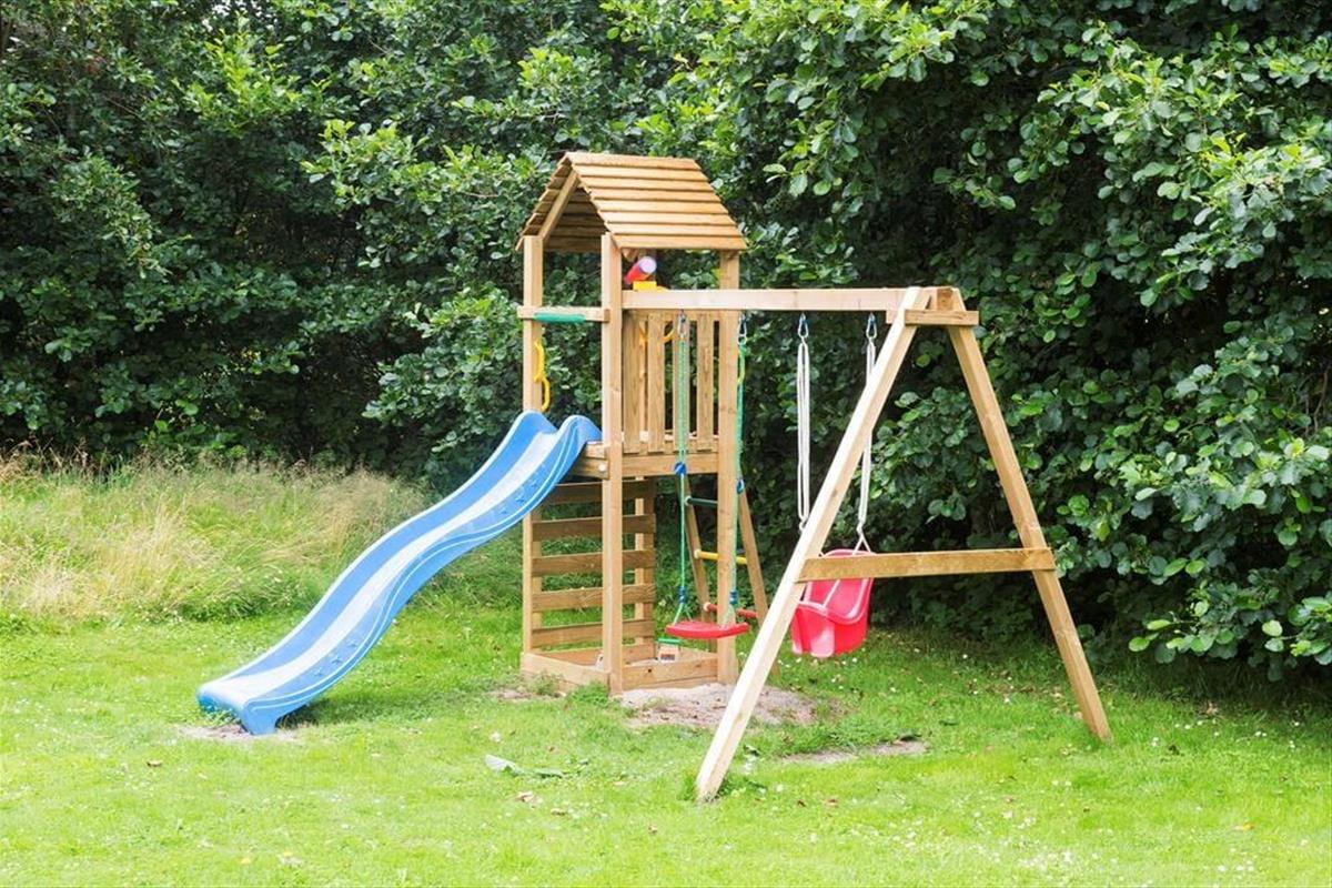 Die mit Schotter versehene Einfahrt des 1.943 m² großen Grundstücks bietet ausreichend Platz zum Abstellen mehrerer Pkw. Auf der ebenen, gepflegten Rasenfläche kannst du mit deinen Lieben Wikingerschach und andere vergnügte Outdoor-Spiele spielen. Deine Kinder dürfen sich außerdem auf ein Spielgerüst mit Schaukel und Rutsche freuen. Während die Kinder ausgelassen im Garten umhertollen, machst du es dir am besten auf einem Gartenstuhl auf der großen Südterrasse gemütlich. Auf dieser Terrasse wirst du mit einer Familie zahllose schöne Stunden verbringen. Der überdachte Terrassenbereich eignet sich hervorragend als Rückzugsort für die langen Sommerabende.