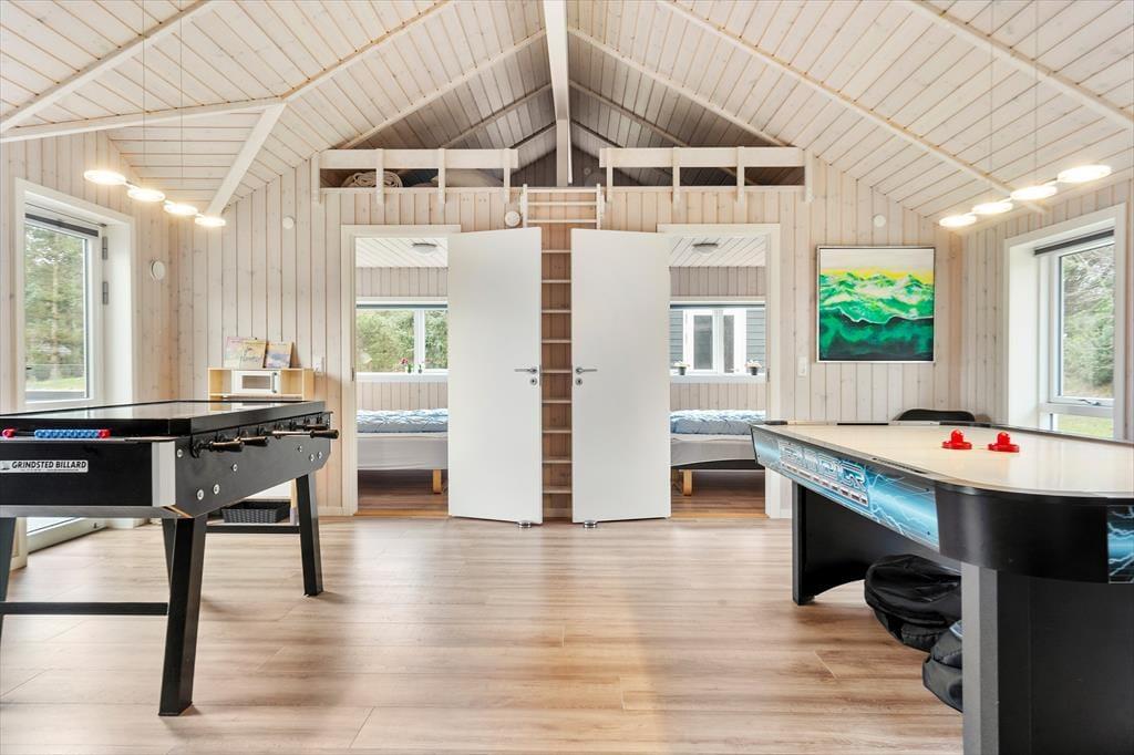 Eines der beiden Badezimmer dieses 160 m² großen Urlaubsdomizils verwöhnt mit einem Whirlpool und einer Sauna. Zu den gemütlichen Details, die den Wohnraum prägen, zählt ein Kaminofen. Die gut ausgestattete Küche ist offen mit dem Wohnraum verbunden, sodass du selbst während der Zubereitung der Mahlzeiten oder kleiner Snacks in stetigem Kontakt zu deinen Familienmitgliedern stehst. Im angrenzenden Aktivitätsraum werdet ihr viele gemeinsame, unterhaltsame Stunden genießen. Während die kleinsten Urlauber vergnügt die Spielküche nutzen, könnt ihr am Tischkicker und am Airhockeytisch die ein oder andere familieninterne Meisterschaft ausfechten. Am Spielautomaten kannst du den Rest dieser Familie bei über 500 Arcade-Spielen herausfordern. Langeweile kommt hier garantiert nie auf!