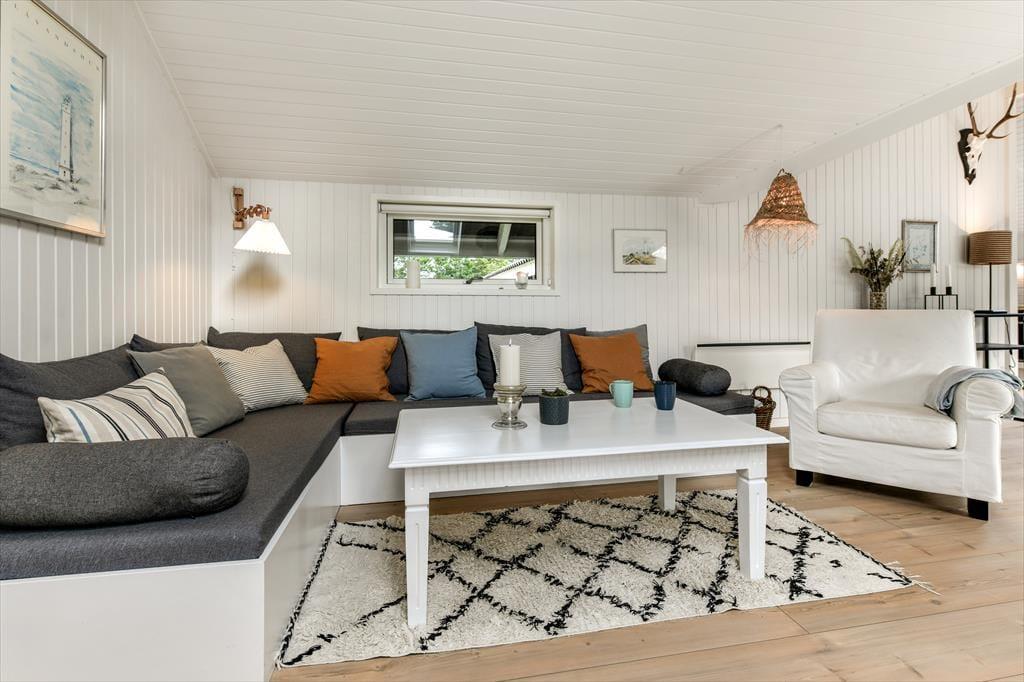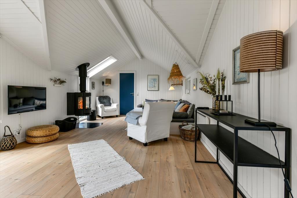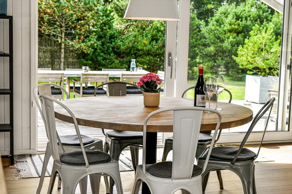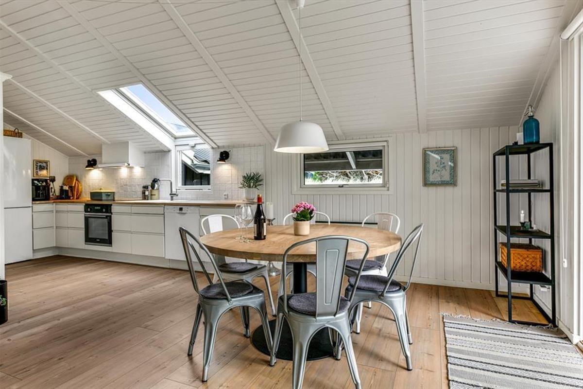 Die hellen Farbtöne und das moderne Interieur sorgen nicht nur für eine schöne Optik, sondern bieten zugleich viel Funktionalität und Komfort. Die offene Küche überzeugt mit guten Arbeitsbedingungen. Das fertige Essen genießt ihr in gemütlicher Runde am runden Esstisch. Außerhalb der Essenzeiten nutzt ihr den Esstisch unter anderem für unterhaltsame Brettspielrunden. Das Sofa des Wohnraums befindet sich nah am Kaminofen. Für Unterhaltung und Abwechslung sorgt ein an der Wand hängender Flachbild-TV. Einer der vier Schlafräume ist im Nebengebäude untergebracht. Das geräumige Badezimmer verwöhnt mit einem direkten Ausgang ins Freie, wo dich bereits der Outdoor-Wellnessbereich erwartet.