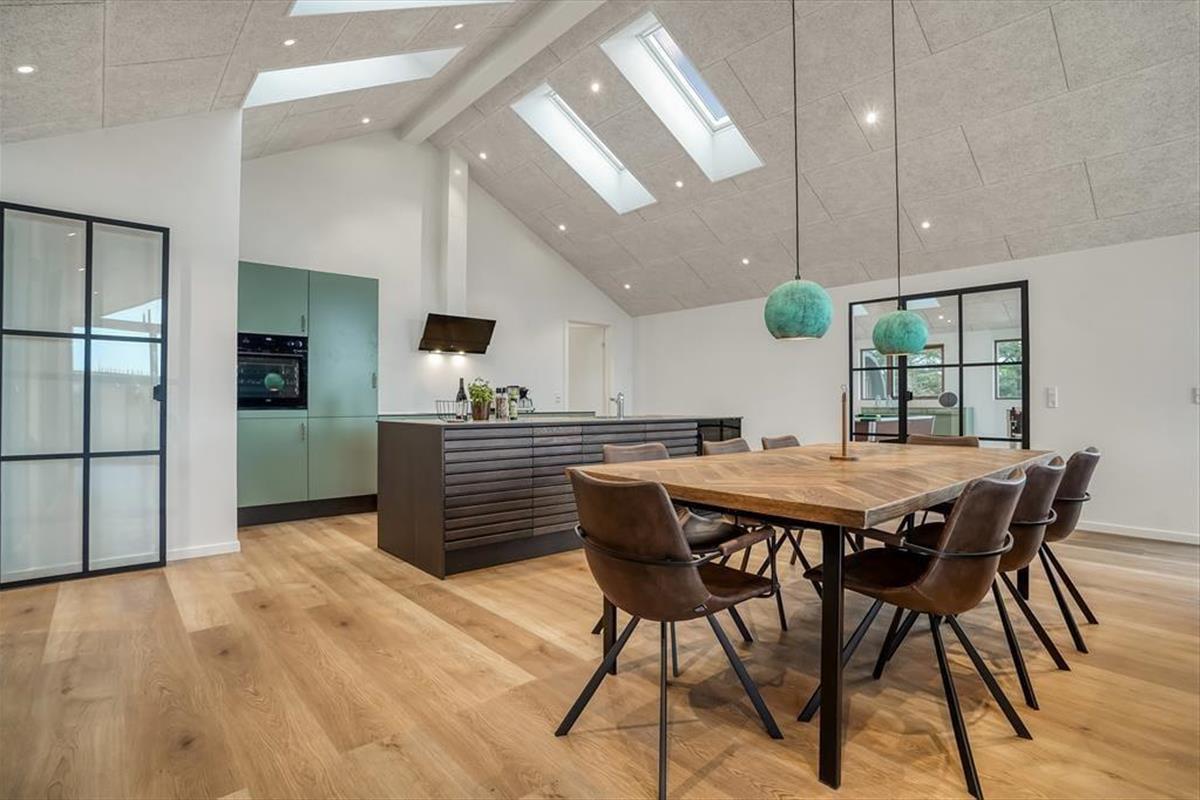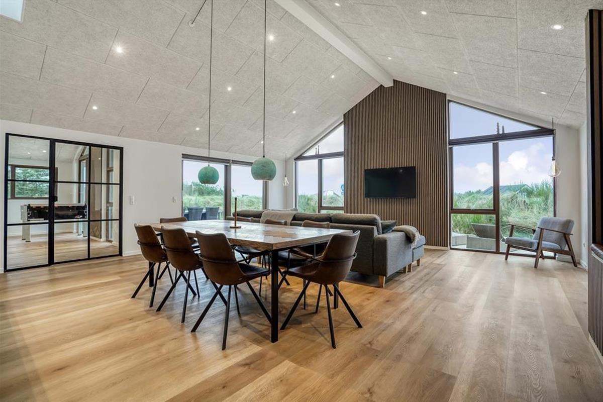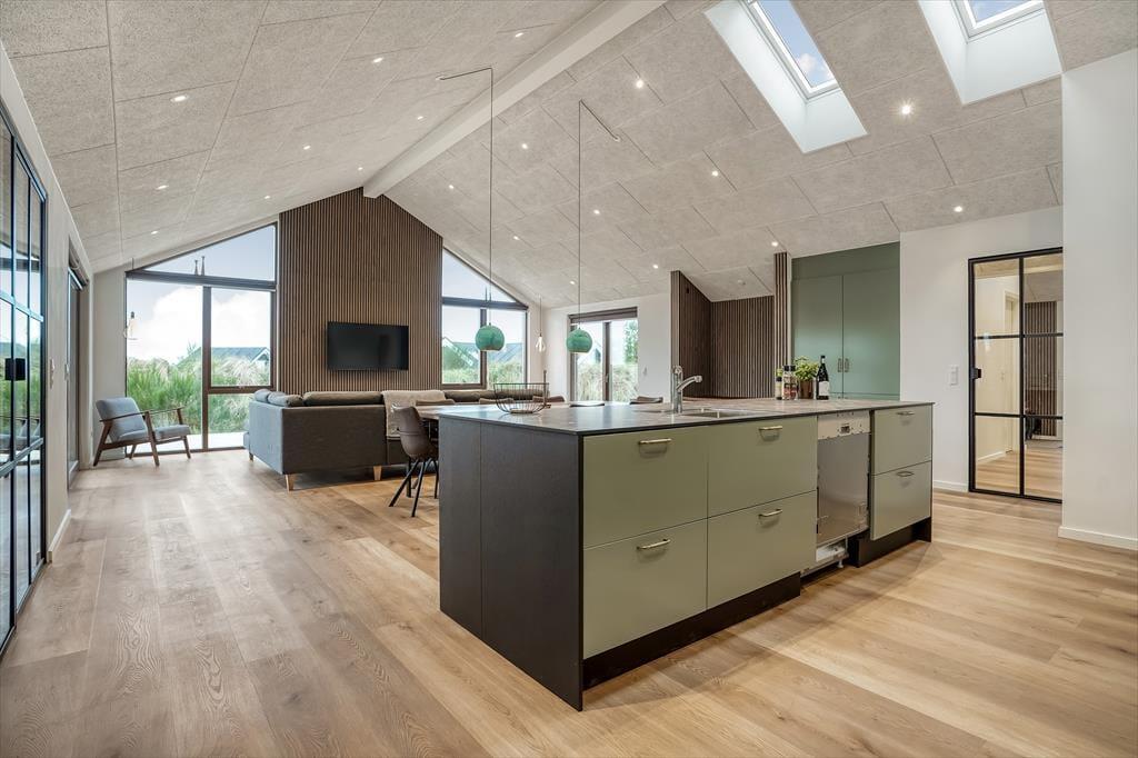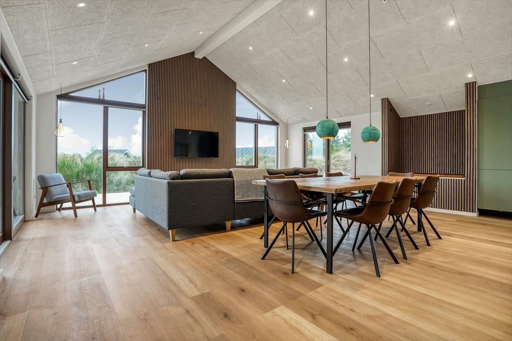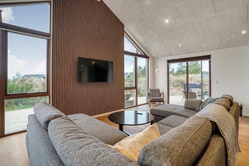 Tritt ein in ein helles und einladendes Ferienhaus, in dem sofort Urlaubsstimmung aufkommt. Das gemütliche Wohnzimmer ist der natürliche Treffpunkt des Hauses, mit seinen großen Fensterfronten, die viel Licht hereinlassen und eine angenehme Atmosphäre schaffen. Nach einem erlebnisreichen Tag kannst du dich auf dem Sofa mit einem guten Buch entspannen oder einen Filmabend mit der Familie genießen.