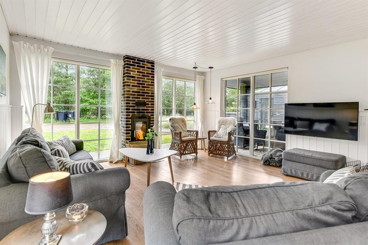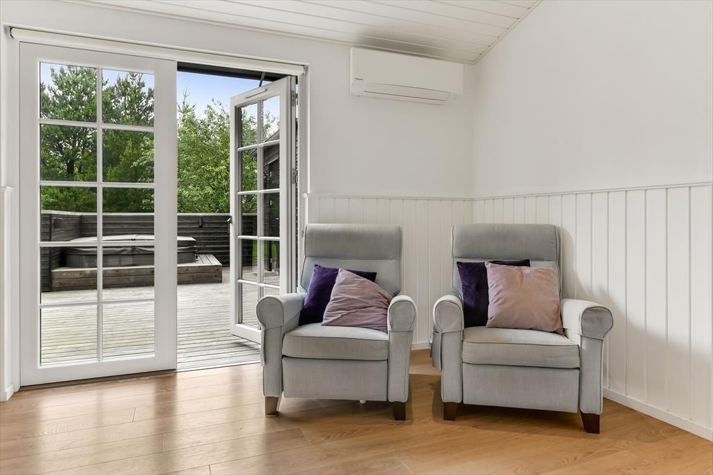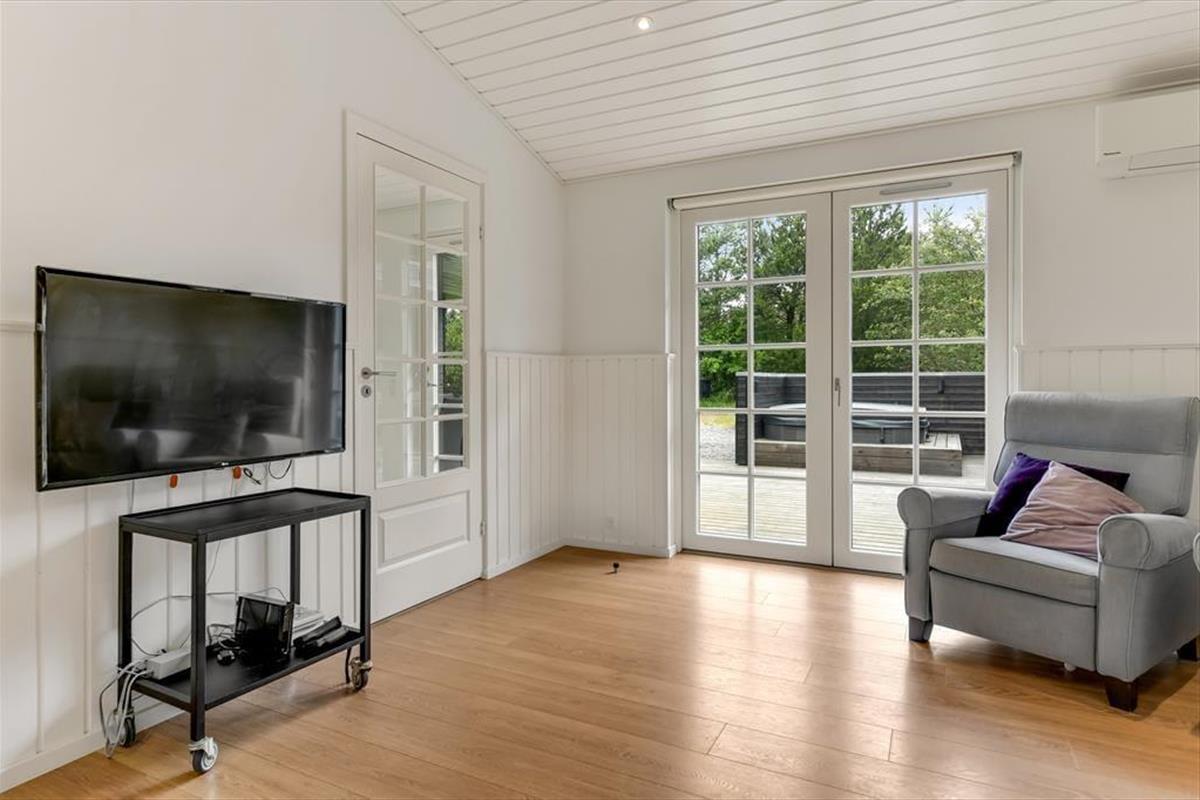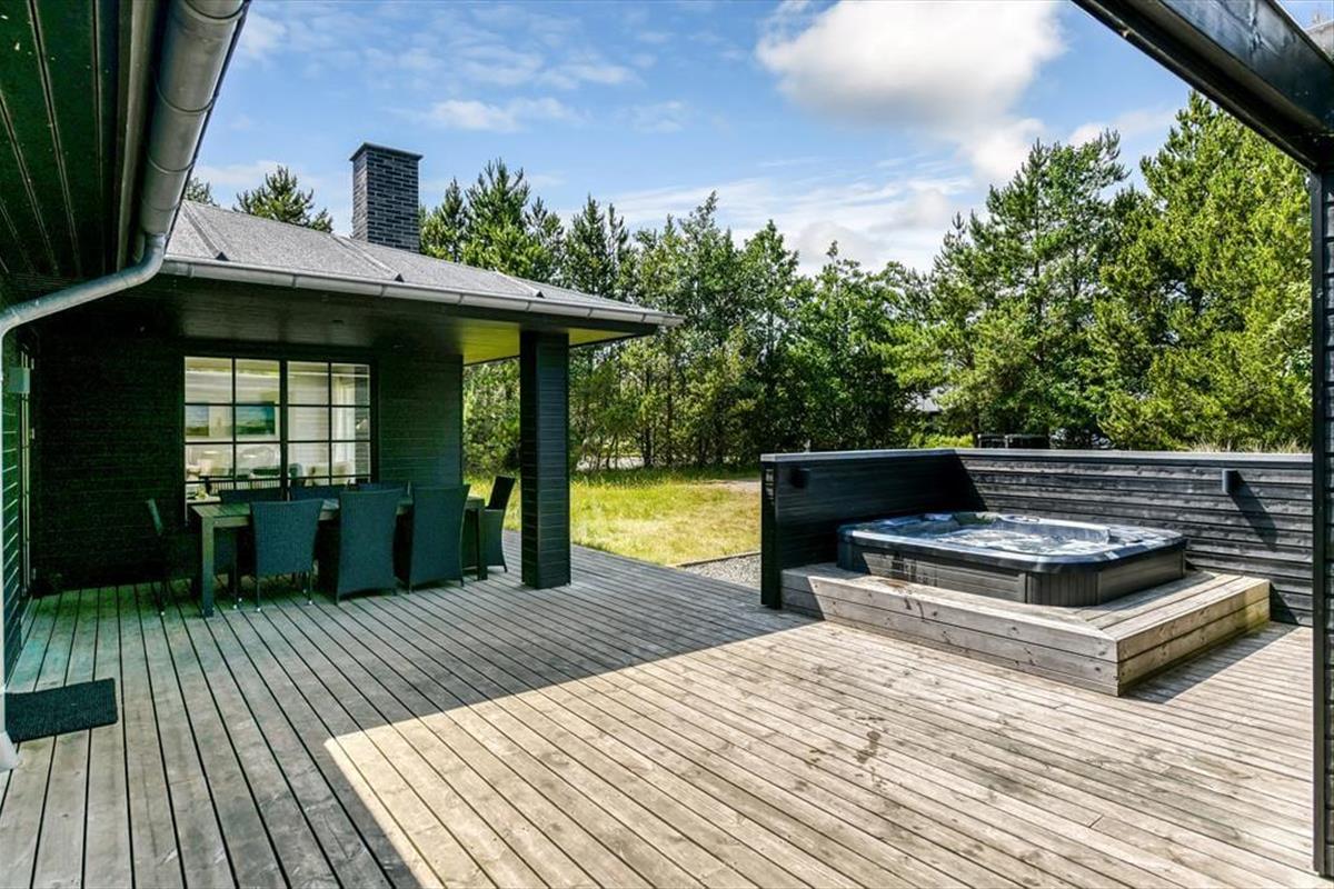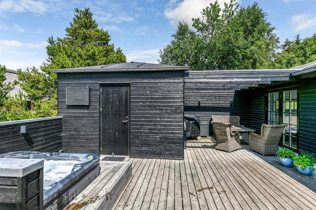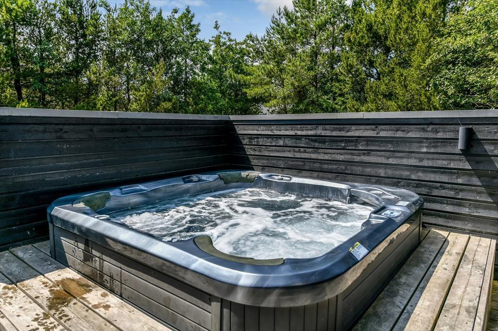 Draußen erwartet dich eine große und schöne Terrasse, die zu vielen Stunden unter freiem Himmel einlädt. Ein Teil der Terrasse ist überdacht, sodass du dich sowohl tagsüber als auch abends draußen aufhalten kannst, unabhängig vom Wetter. Hier kannst du den Grill anfeuern und eine Mahlzeit mit Blick auf die umliegende Natur genießen. Wenn es Zeit für Entspannung wird, kannst du in den großen Außen-Whirlpool eintauchen und die Blasen den Alltagsstress wegmassieren lassen, während du den Sonnenuntergang oder den Sternenhimmel genießt. Der Garten rund um das Ferienhaus ist reich an grünen Umgebungen, wo die Kinder spielen und erkunden können, während die Erwachsenen sich mit einem Buch oder einer Tasse Kaffee entspannen.