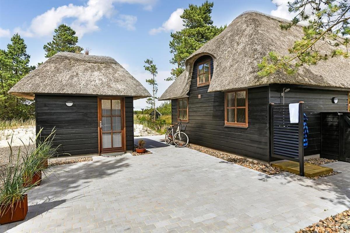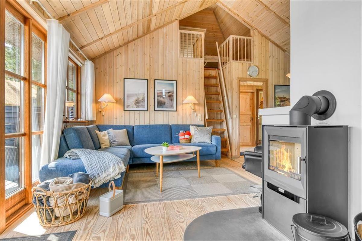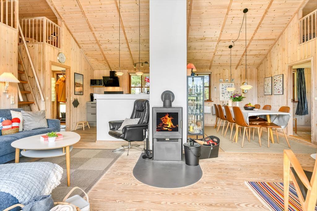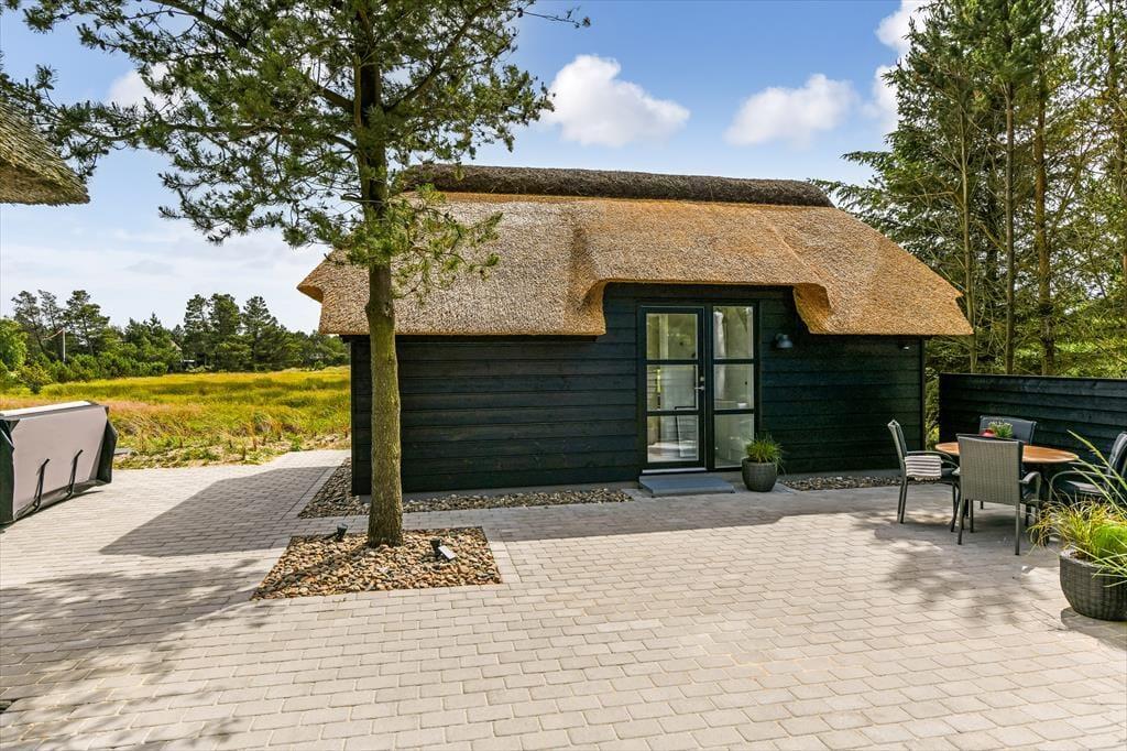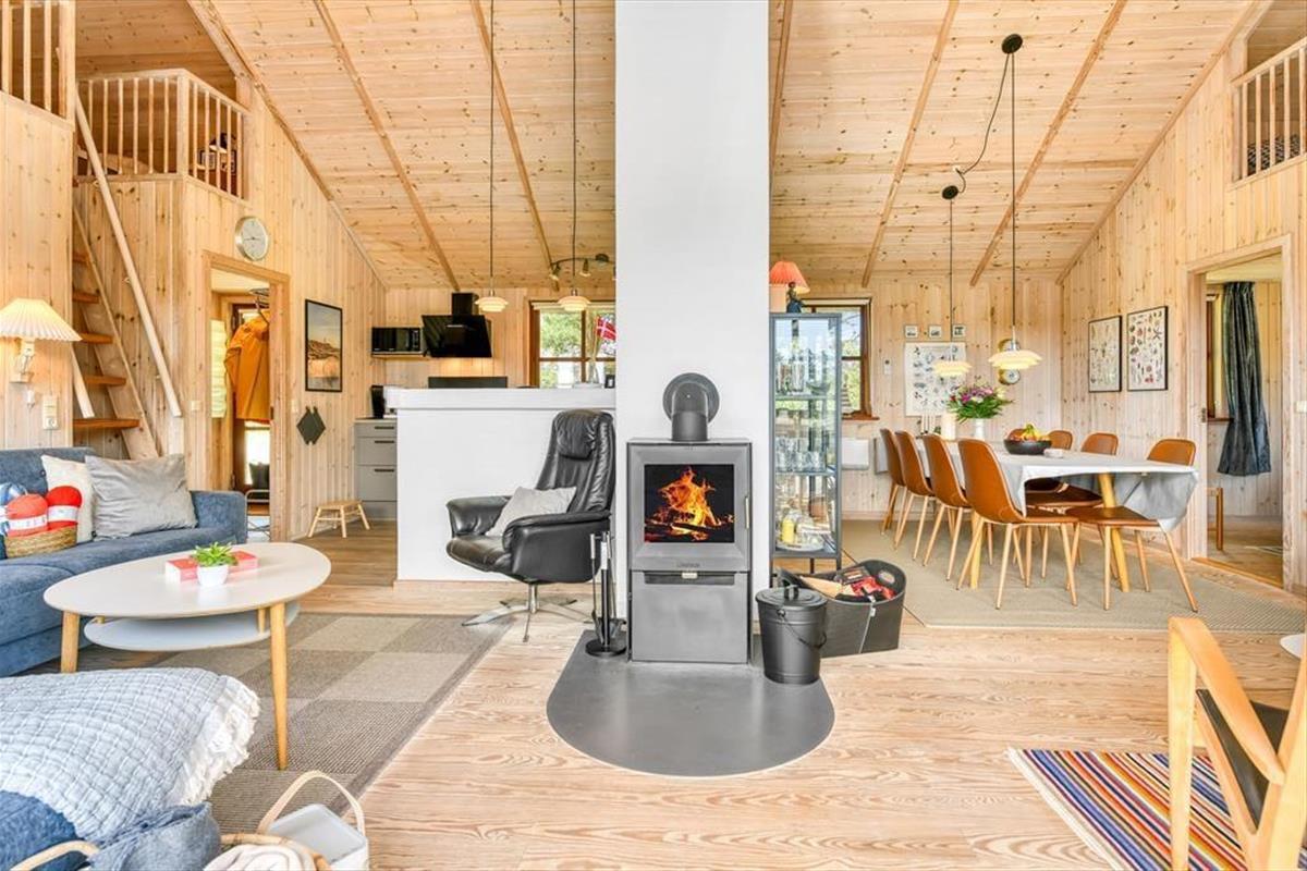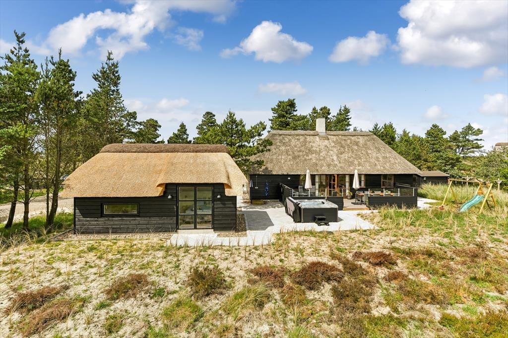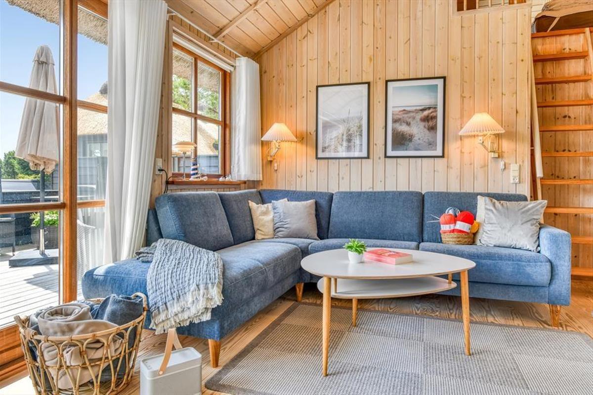 Das Ferienhaus ist der Inbegriff eines dänischen Sommerurlaubs in einem gemütlichen und traditionsreichen Holzhaus mit Reetdach. Es gibt helle Wände und Decken sowie schöne Holzböden. Alle Ecken im Haus sind vollständig genutzt. Das Haus hat im Gemeinschaftsraum eine hohe Decke, der ein gut eingerichtete und gut ausgestattete Küche mit Essbereich und ein Wohnzimmer mit Kamin und bequemen Sitzmöbeln bietet. Der Gemeinschaftsraum ist ein perfekter Treffpunkt für Freunde und Familie, mit reichlich Gelegenheit für Familiengemütlichkeit. Das Haus hat 2 große Dachböden mit voller Stehhöhe. Hier kann man sich zurückziehen und erholen, aber dennoch dem Geschehen folgen. Einer der Dachböden ist für Kinderaktivitäten eingerichtet, mit Smart-TV für Filme und Gaming, Sitzsack sowie Liege- und Spielbereich. Im Erdgeschoss gibt es 2 helle Schlafzimmer mit guten Betten. Das Haus verfügt auch über eine Sauna und einen Innenwhirlpool. Es gibt ein 25 m² großes Nebengebäude mit einem Schlafzimmer und einem Badezimmer. Vom Nebengebäude aus kannst du die Naturaussicht aus der Badewanne genießen. Draußen vor dem Nebengebäude gibt es eine große Terrasse zur Natur hin.