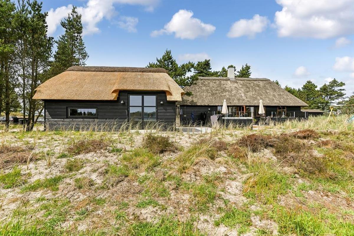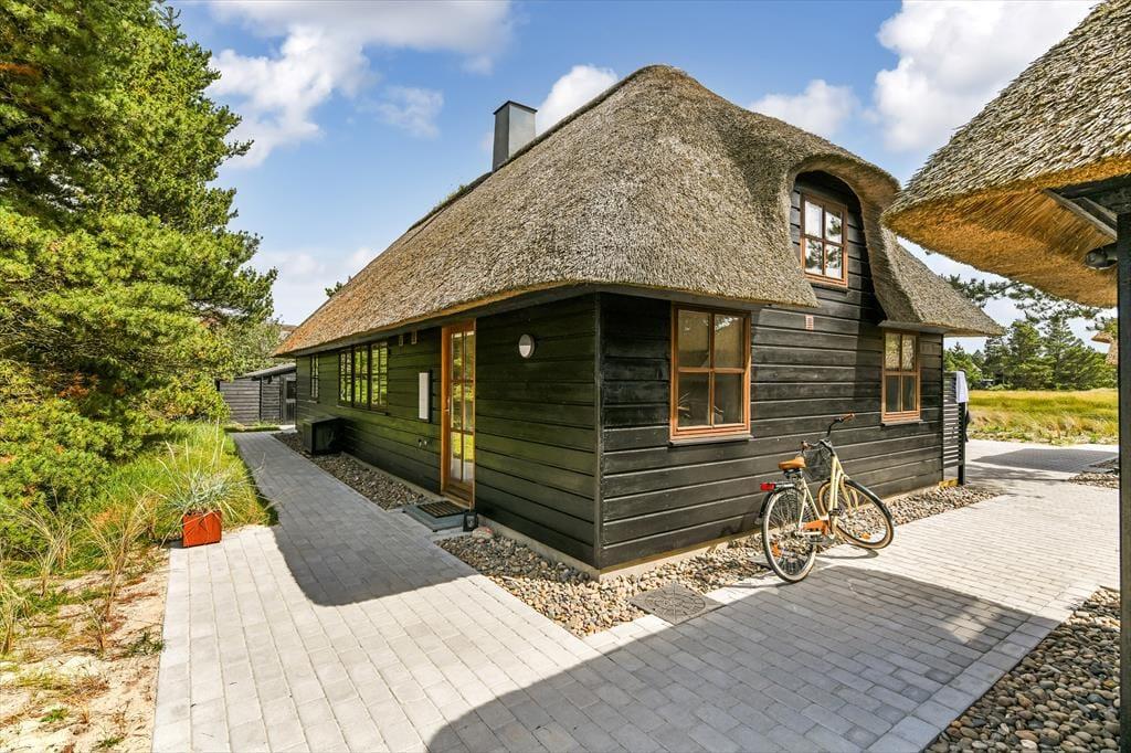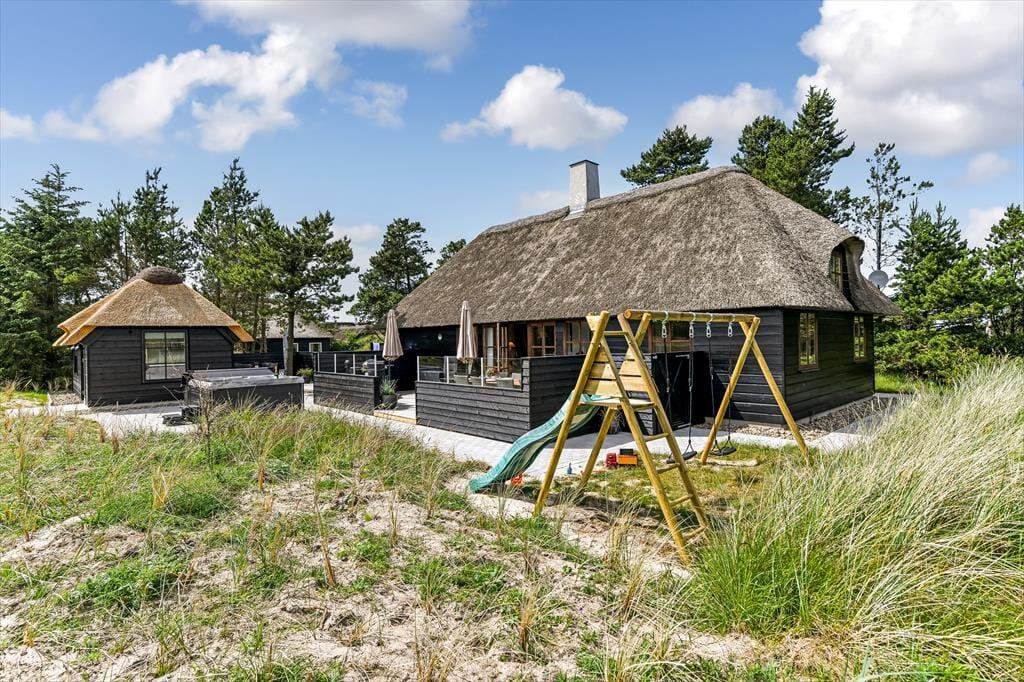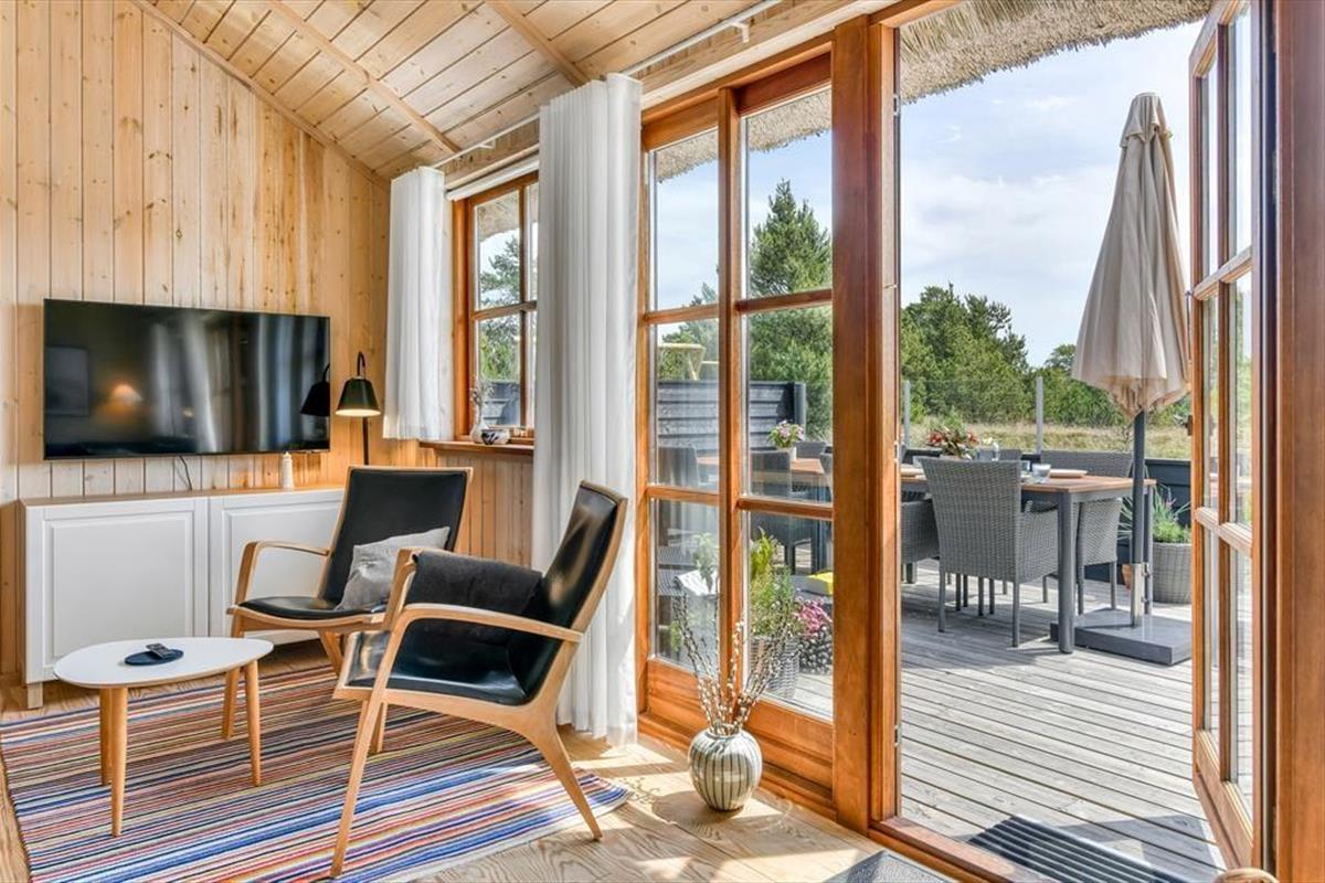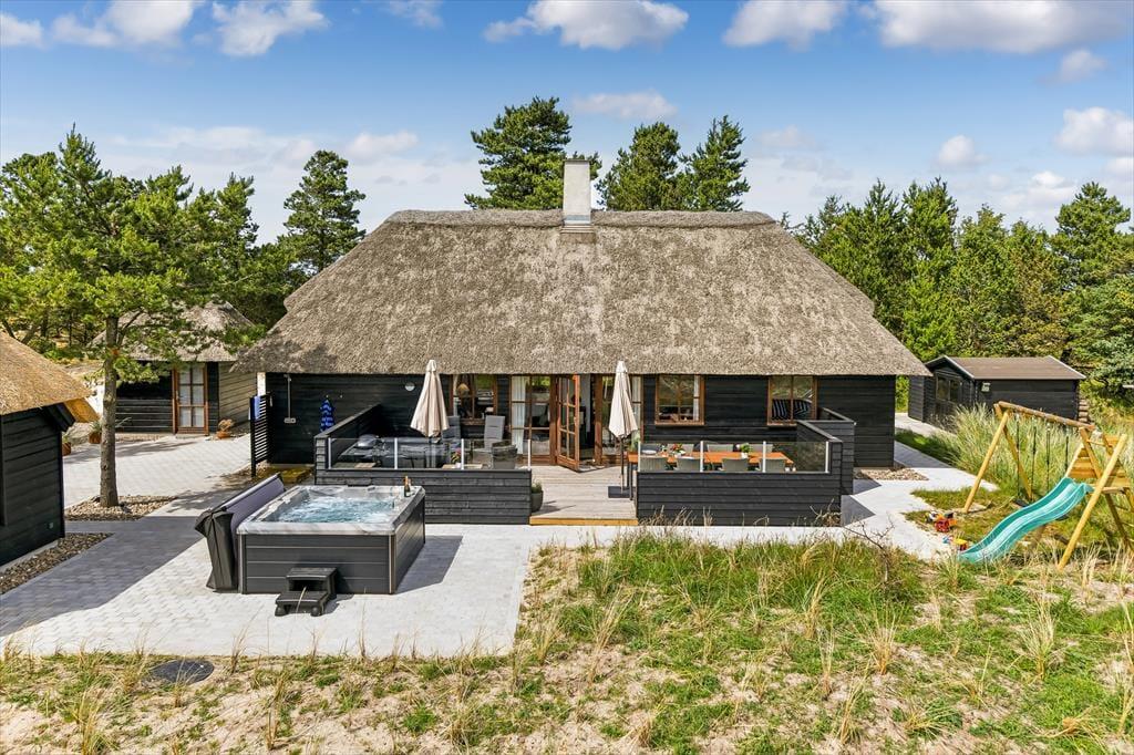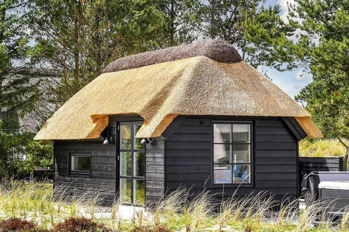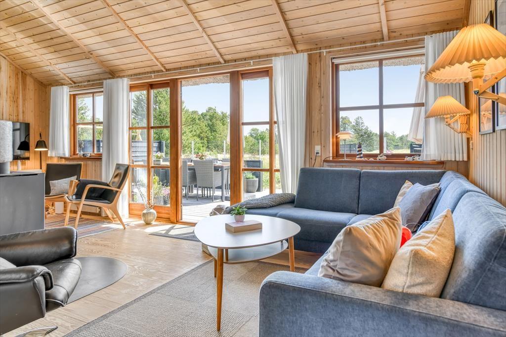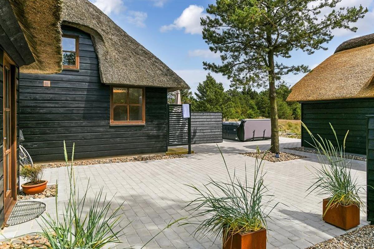 Das Ferienhaus ist der Inbegriff eines dänischen Sommerurlaubs in einem gemütlichen und traditionsreichen Holzhaus mit Reetdach. Es gibt helle Wände und Decken sowie schöne Holzböden. Alle Ecken im Haus sind vollständig genutzt. Das Haus hat im Gemeinschaftsraum eine hohe Decke, der ein gut eingerichtete und gut ausgestattete Küche mit Essbereich und ein Wohnzimmer mit Kamin und bequemen Sitzmöbeln bietet. Der Gemeinschaftsraum ist ein perfekter Treffpunkt für Freunde und Familie, mit reichlich Gelegenheit für Familiengemütlichkeit. Das Haus hat 2 große Dachböden mit voller Stehhöhe. Hier kann man sich zurückziehen und erholen, aber dennoch dem Geschehen folgen. Einer der Dachböden ist für Kinderaktivitäten eingerichtet, mit Smart-TV für Filme und Gaming, Sitzsack sowie Liege- und Spielbereich. Im Erdgeschoss gibt es 2 helle Schlafzimmer mit guten Betten. Das Haus verfügt auch über eine Sauna und einen Innenwhirlpool. Es gibt ein 25 m² großes Nebengebäude mit einem Schlafzimmer und einem Badezimmer. Vom Nebengebäude aus kannst du die Naturaussicht aus der Badewanne genießen. Draußen vor dem Nebengebäude gibt es eine große Terrasse zur Natur hin.