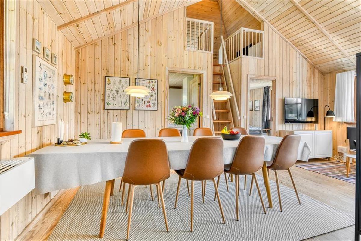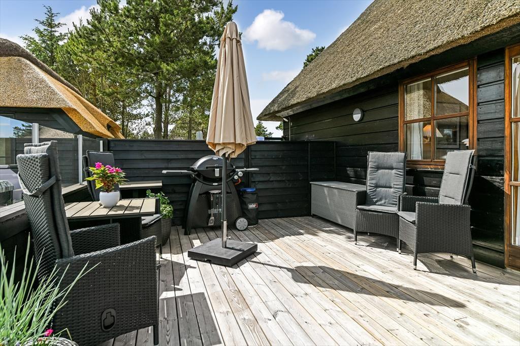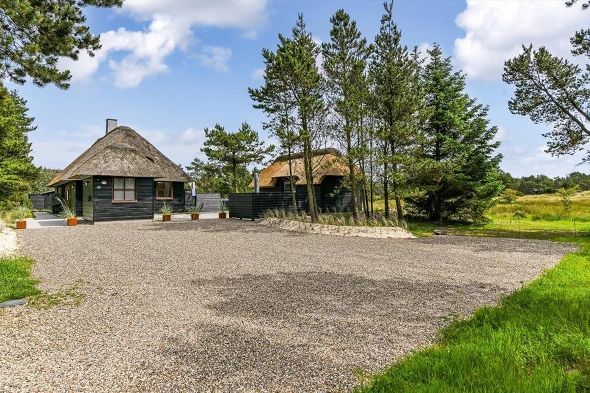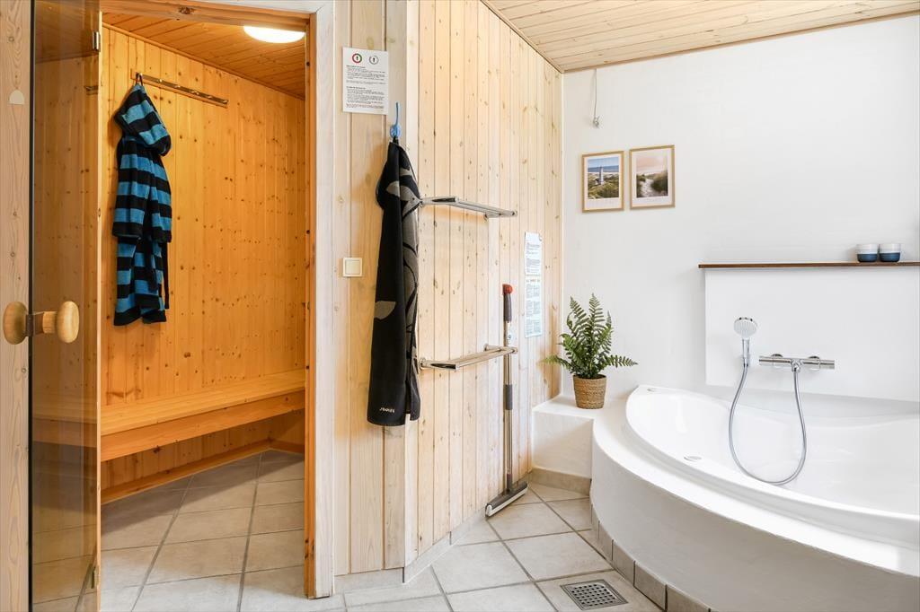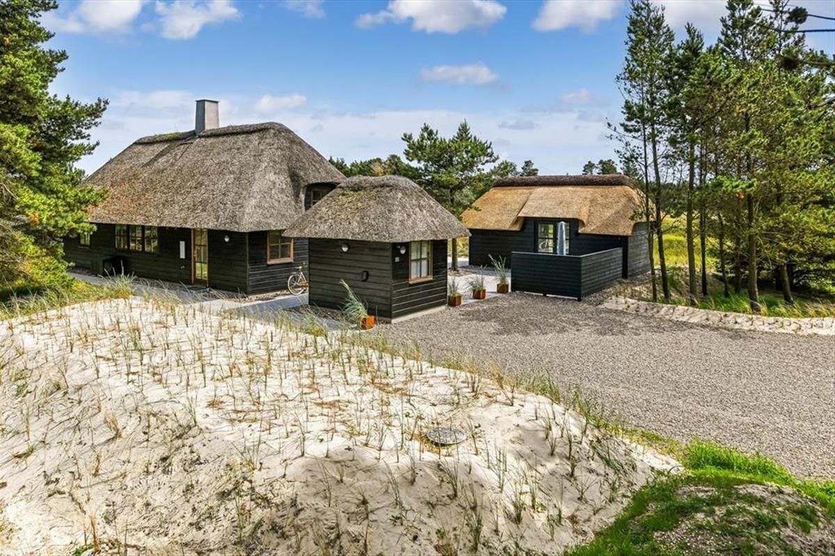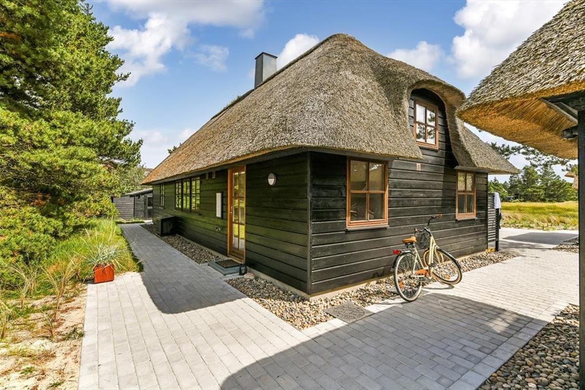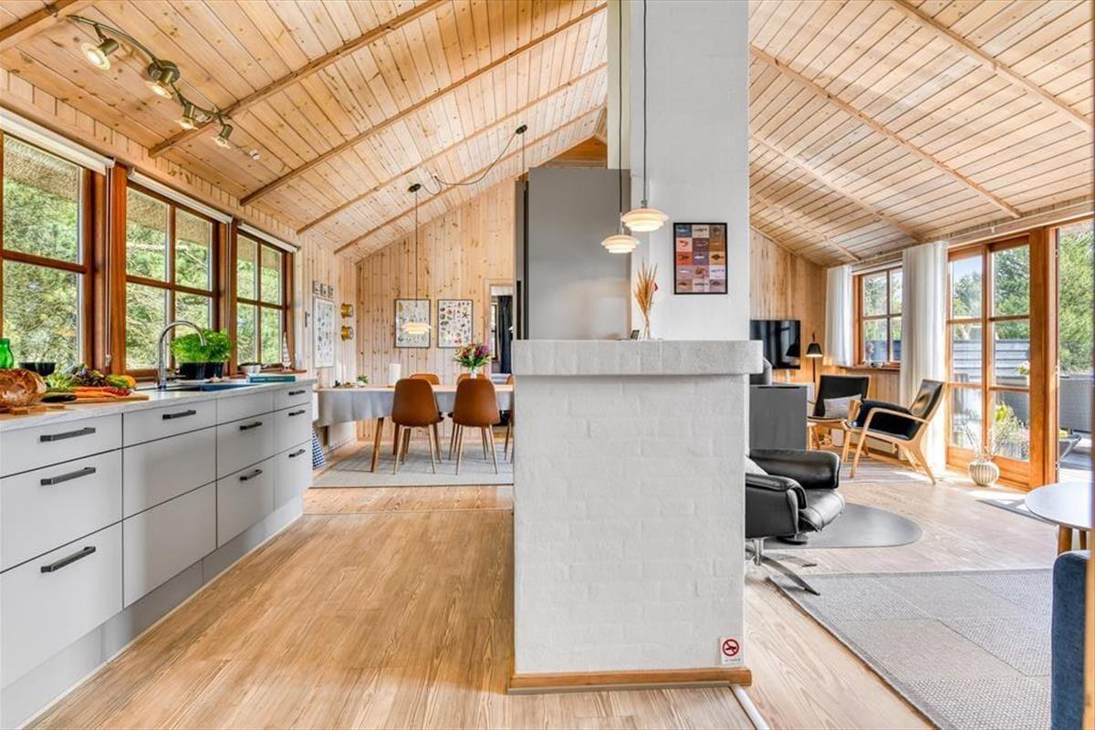 Das Ferienhaus ist der Inbegriff eines dänischen Sommerurlaubs in einem gemütlichen und traditionsreichen Holzhaus mit Reetdach. Es gibt helle Wände und Decken sowie schöne Holzböden. Alle Ecken im Haus sind vollständig genutzt. Das Haus hat im Gemeinschaftsraum eine hohe Decke, der ein gut eingerichtete und gut ausgestattete Küche mit Essbereich und ein Wohnzimmer mit Kamin und bequemen Sitzmöbeln bietet. Der Gemeinschaftsraum ist ein perfekter Treffpunkt für Freunde und Familie, mit reichlich Gelegenheit für Familiengemütlichkeit. Das Haus hat 2 große Dachböden mit voller Stehhöhe. Hier kann man sich zurückziehen und erholen, aber dennoch dem Geschehen folgen. Einer der Dachböden ist für Kinderaktivitäten eingerichtet, mit Smart-TV für Filme und Gaming, Sitzsack sowie Liege- und Spielbereich. Im Erdgeschoss gibt es 2 helle Schlafzimmer mit guten Betten. Das Haus verfügt auch über eine Sauna und einen Innenwhirlpool. Es gibt ein 25 m² großes Nebengebäude mit einem Schlafzimmer und einem Badezimmer. Vom Nebengebäude aus kannst du die Naturaussicht aus der Badewanne genießen. Draußen vor dem Nebengebäude gibt es eine große Terrasse zur Natur hin.