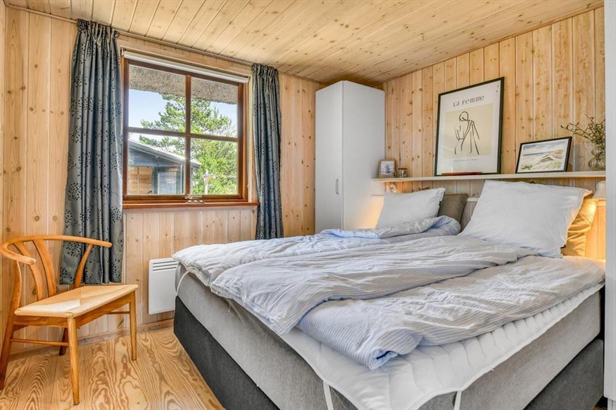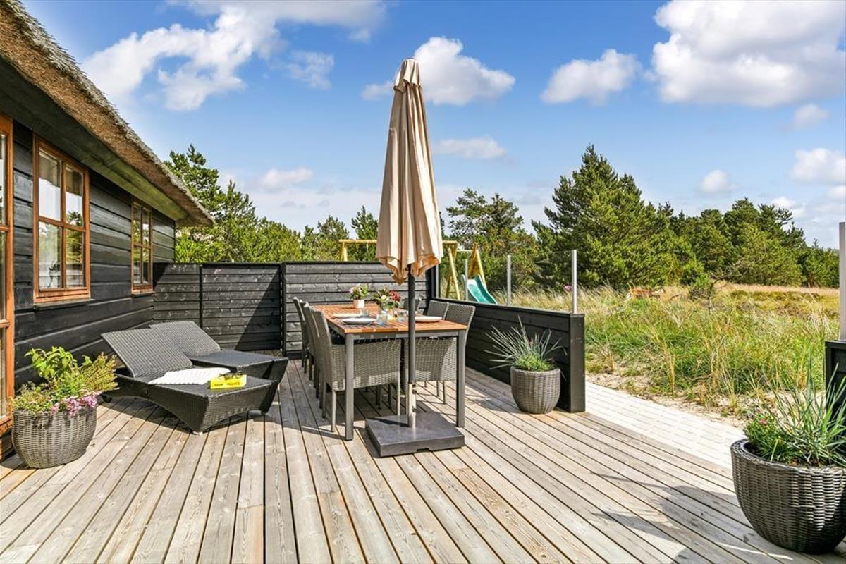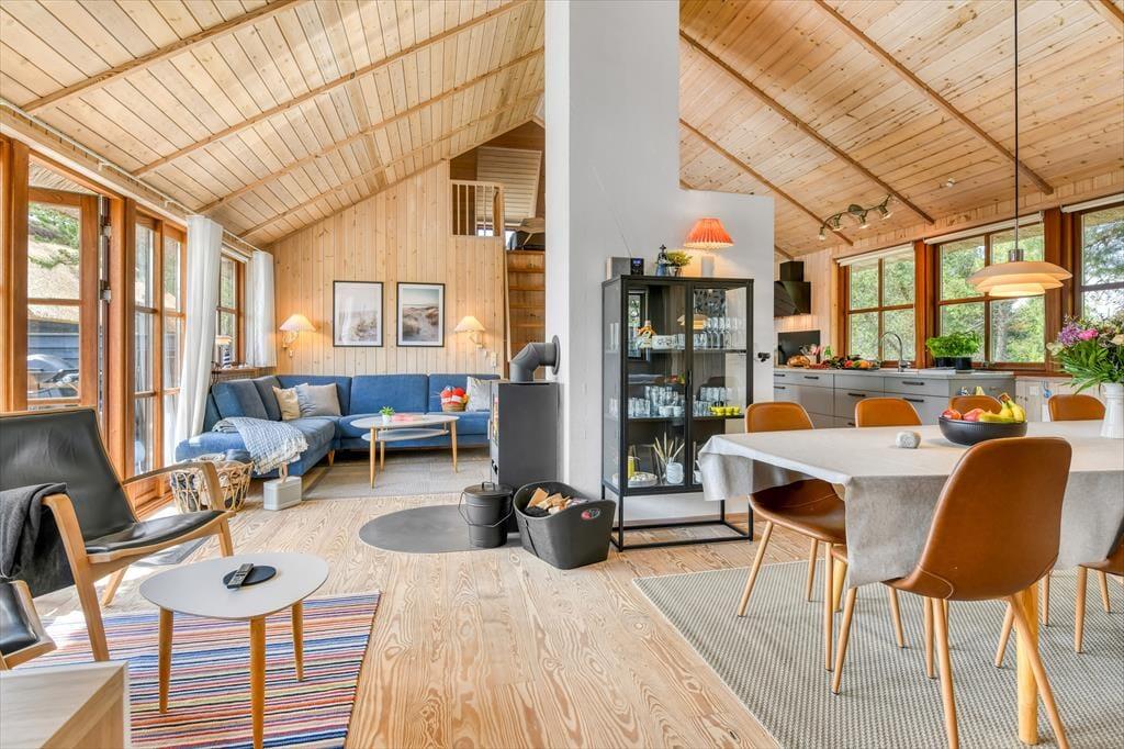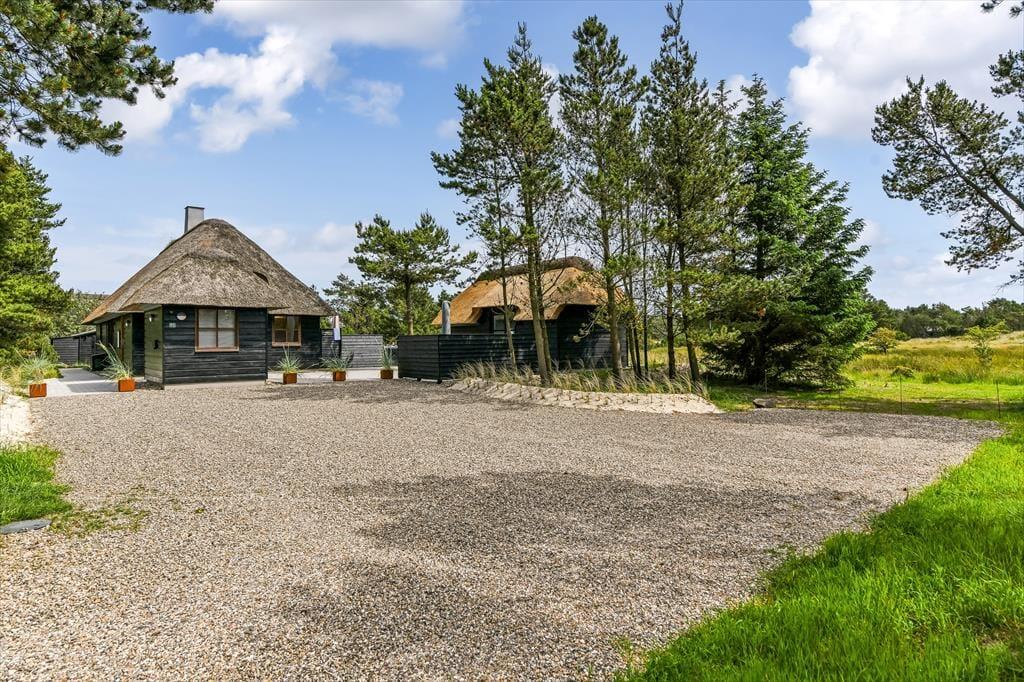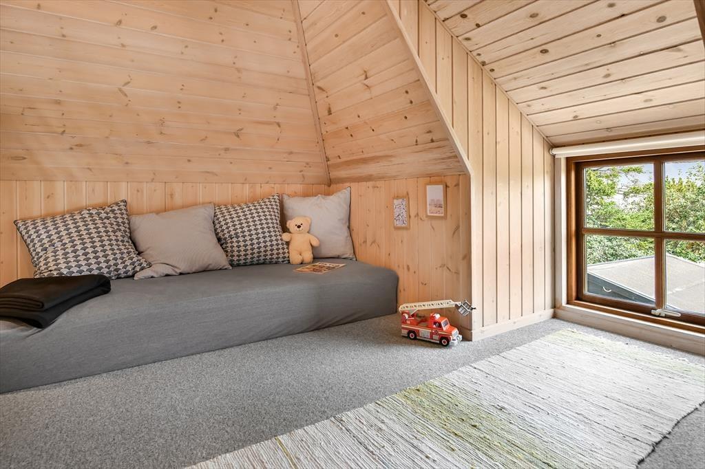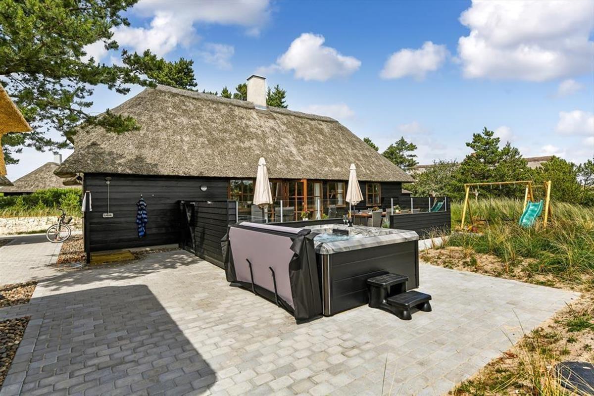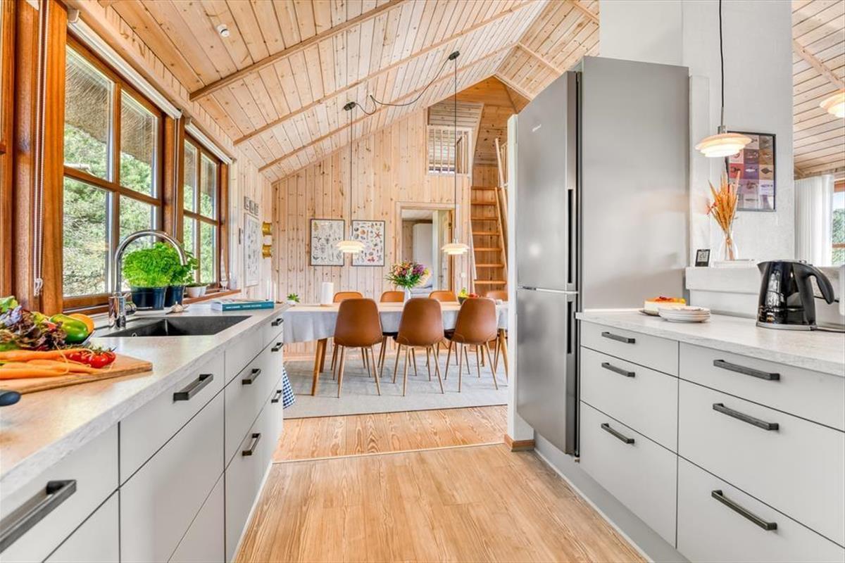 Das Ferienhaus ist der Inbegriff eines dänischen Sommerurlaubs in einem gemütlichen und traditionsreichen Holzhaus mit Reetdach. Es gibt helle Wände und Decken sowie schöne Holzböden. Alle Ecken im Haus sind vollständig genutzt. Das Haus hat im Gemeinschaftsraum eine hohe Decke, der ein gut eingerichtete und gut ausgestattete Küche mit Essbereich und ein Wohnzimmer mit Kamin und bequemen Sitzmöbeln bietet. Der Gemeinschaftsraum ist ein perfekter Treffpunkt für Freunde und Familie, mit reichlich Gelegenheit für Familiengemütlichkeit. Das Haus hat 2 große Dachböden mit voller Stehhöhe. Hier kann man sich zurückziehen und erholen, aber dennoch dem Geschehen folgen. Einer der Dachböden ist für Kinderaktivitäten eingerichtet, mit Smart-TV für Filme und Gaming, Sitzsack sowie Liege- und Spielbereich. Im Erdgeschoss gibt es 2 helle Schlafzimmer mit guten Betten. Das Haus verfügt auch über eine Sauna und einen Innenwhirlpool. Es gibt ein 25 m² großes Nebengebäude mit einem Schlafzimmer und einem Badezimmer. Vom Nebengebäude aus kannst du die Naturaussicht aus der Badewanne genießen. Draußen vor dem Nebengebäude gibt es eine große Terrasse zur Natur hin.