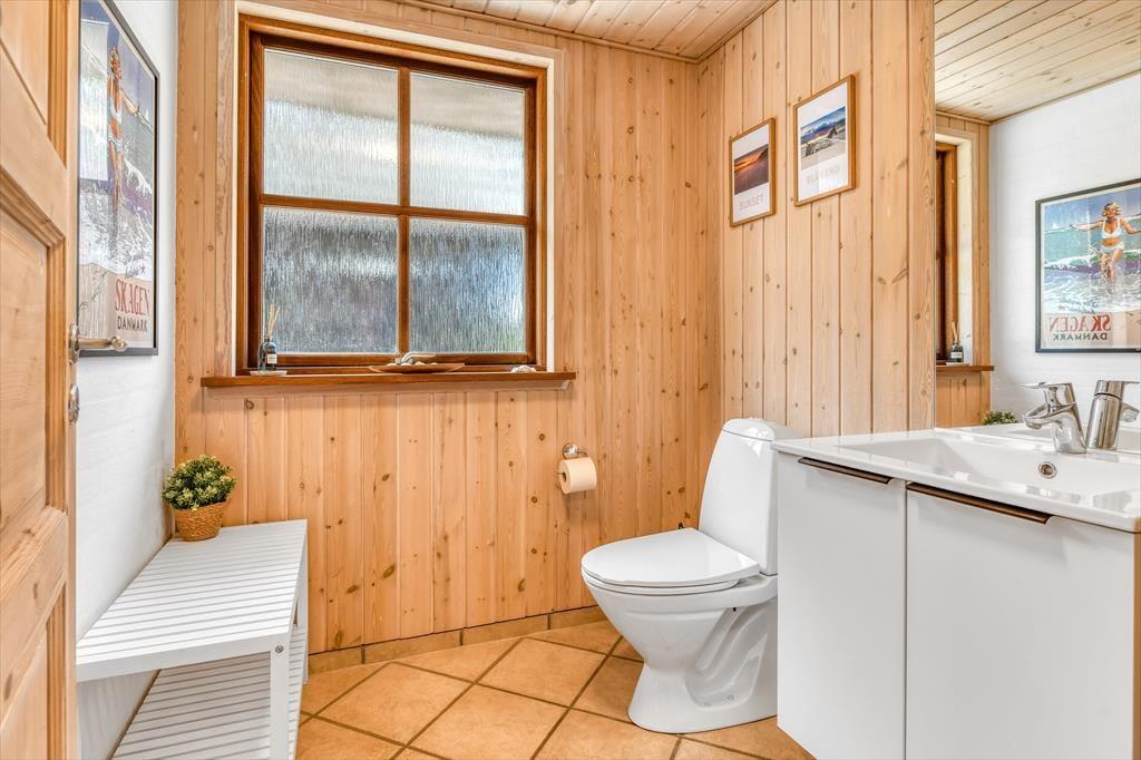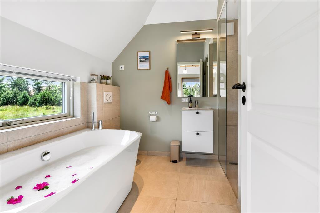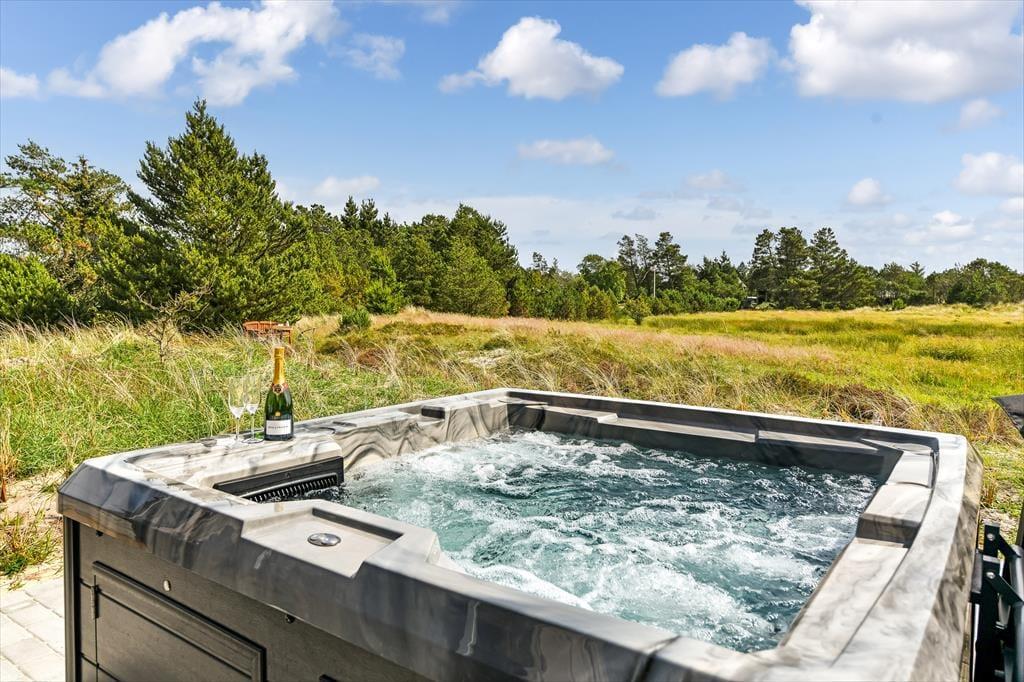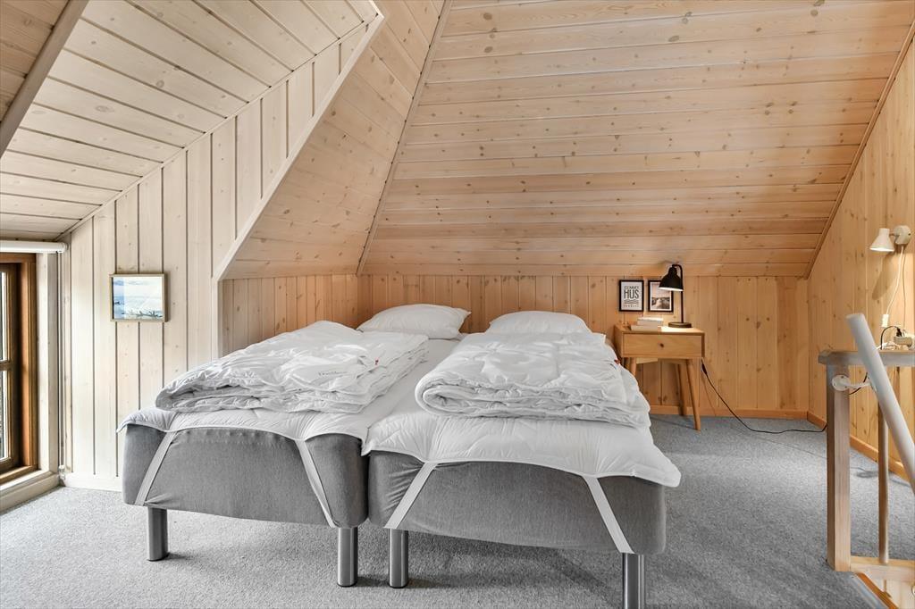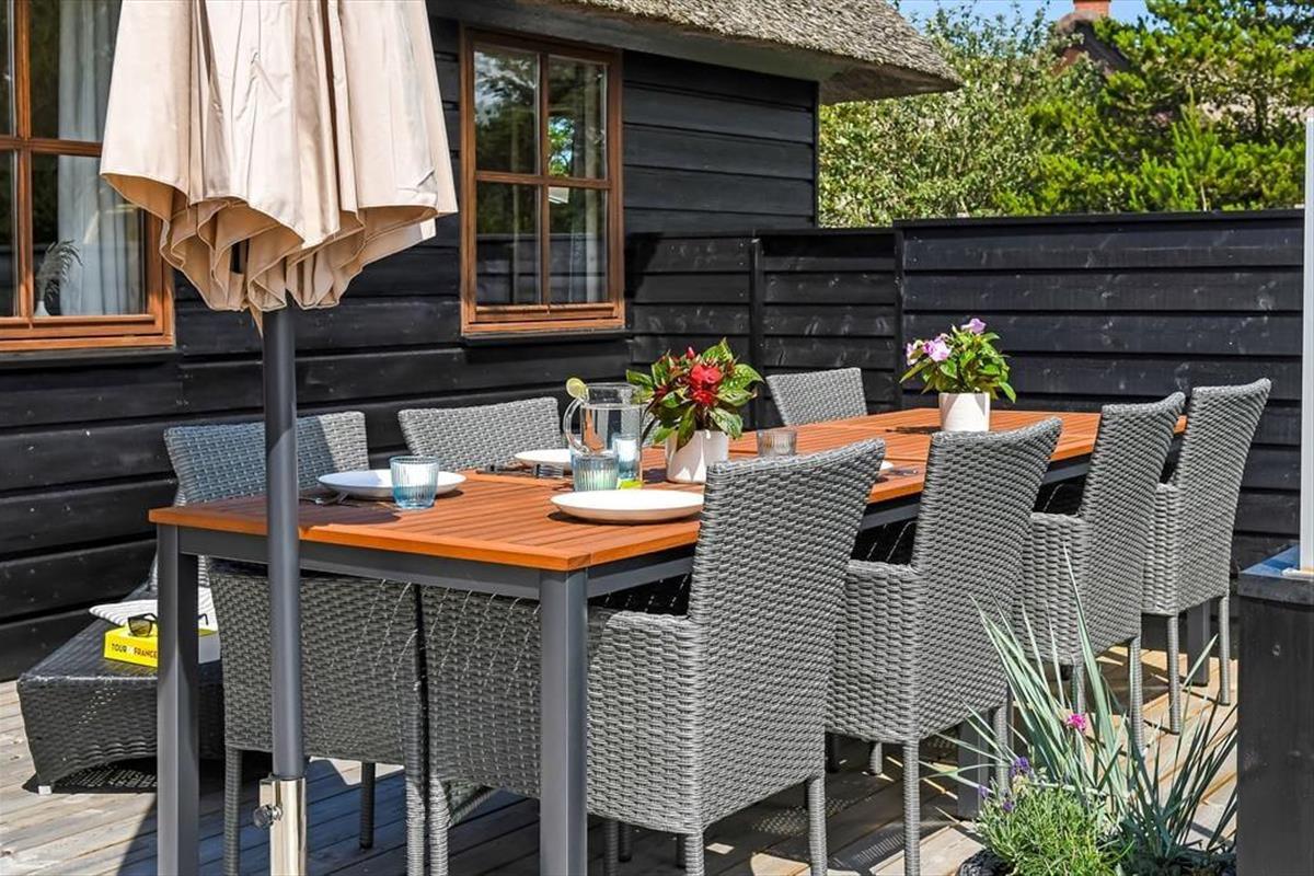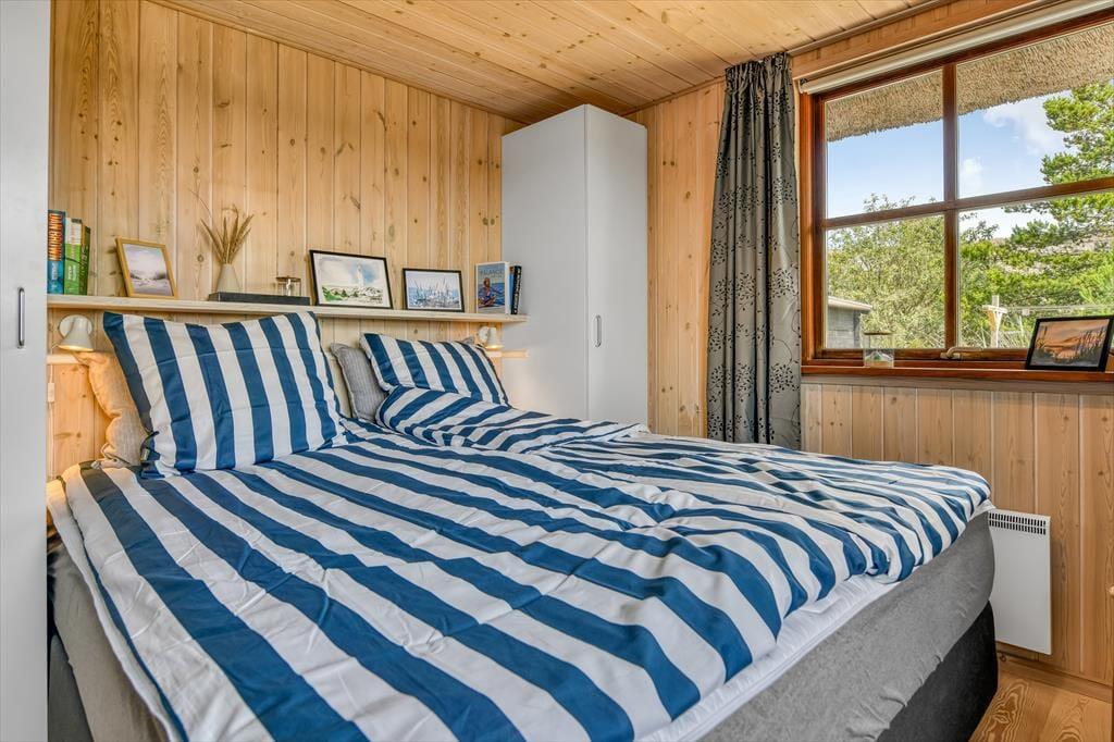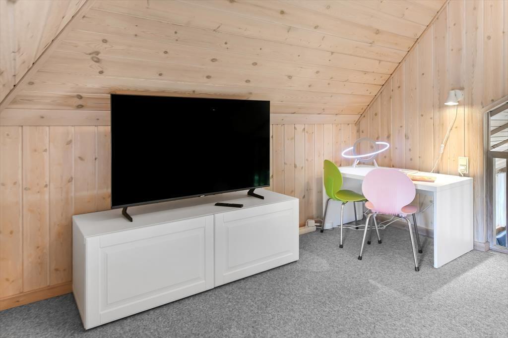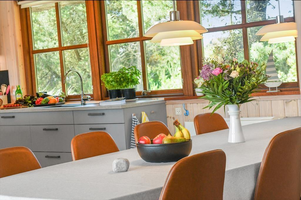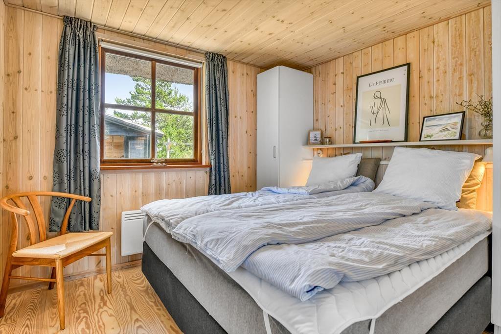 Das Ferienhaus ist der Inbegriff eines dänischen Sommerurlaubs in einem gemütlichen und traditionsreichen Holzhaus mit Reetdach. Es gibt helle Wände und Decken sowie schöne Holzböden. Alle Ecken im Haus sind vollständig genutzt. Das Haus hat im Gemeinschaftsraum eine hohe Decke, der ein gut eingerichtete und gut ausgestattete Küche mit Essbereich und ein Wohnzimmer mit Kamin und bequemen Sitzmöbeln bietet. Der Gemeinschaftsraum ist ein perfekter Treffpunkt für Freunde und Familie, mit reichlich Gelegenheit für Familiengemütlichkeit. Das Haus hat 2 große Dachböden mit voller Stehhöhe. Hier kann man sich zurückziehen und erholen, aber dennoch dem Geschehen folgen. Einer der Dachböden ist für Kinderaktivitäten eingerichtet, mit Smart-TV für Filme und Gaming, Sitzsack sowie Liege- und Spielbereich. Im Erdgeschoss gibt es 2 helle Schlafzimmer mit guten Betten. Das Haus verfügt auch über eine Sauna und einen Innenwhirlpool. Es gibt ein 25 m² großes Nebengebäude mit einem Schlafzimmer und einem Badezimmer. Vom Nebengebäude aus kannst du die Naturaussicht aus der Badewanne genießen. Draußen vor dem Nebengebäude gibt es eine große Terrasse zur Natur hin.