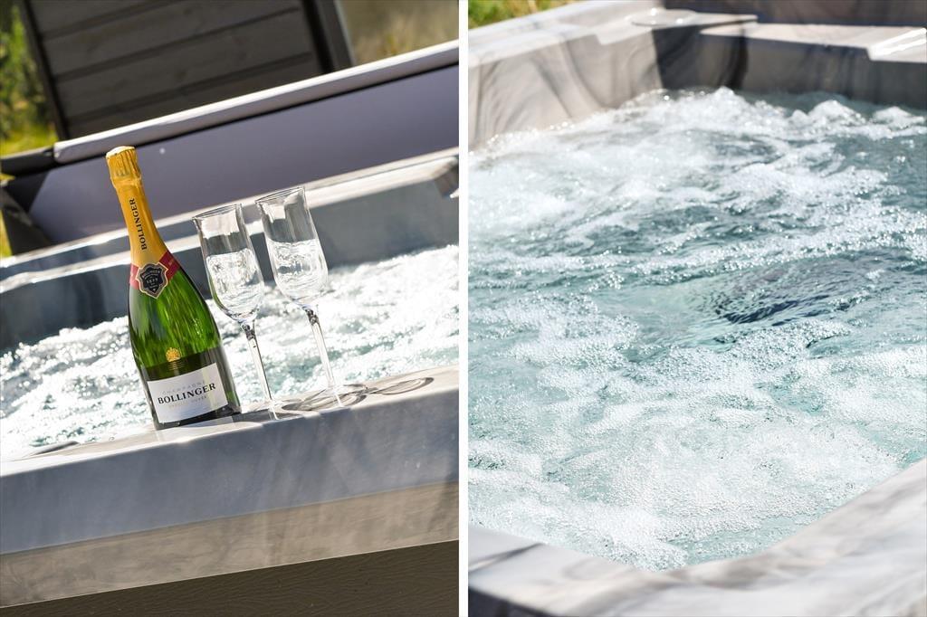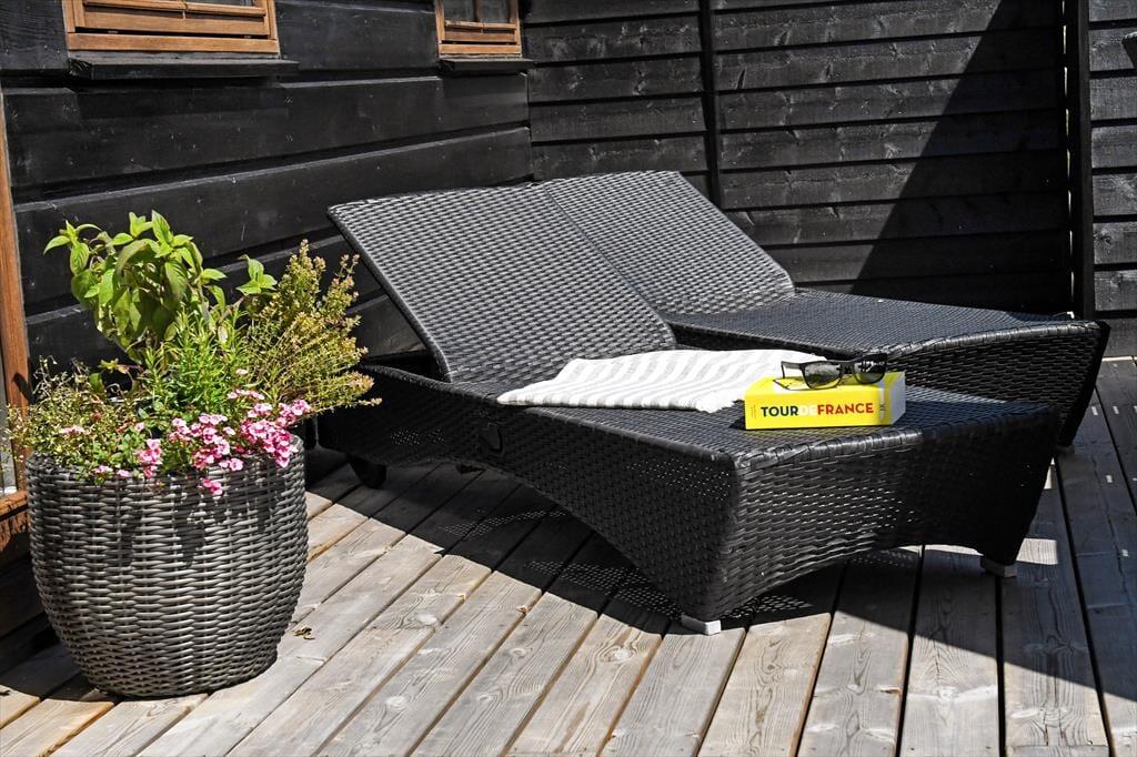 Auf der südlich ausgerichteten Holzterrasse kannst du die Sonne von Sonnenaufgang im Osten bis Sonnenuntergang im Westen genießen. Wird es zu warm, kannst du in den Schatten beim Nebengebäude oder einem der vielen anderen windgeschützten Bereiche rund um das Haus wechseln. Es gibt große mobile Sonnenschirme, die dort Schatten spenden, wo ihr ihn braucht. Die Terrassen sind mit guten Gartenmöbeln und Sonnenliegen ausgestattet. Auf der Terrasse steht ein Gasgrill bereit, um eure Mahlzeiten zuzubereiten. In der gegenüberliegenden Ecke können die Kinder auf der Schaukel mit Rutsche spielen. Die Holzterrassen des Hauses sind teilweise windgeschützt und bieten dennoch eine transparente Abschirmung zur Aussicht hin. Am Giebel des Hauses gibt es auch eine Boulebahn. Nach einem langen Tag in der Natur oder beim Spielen im Garten kannst du eine warme Dusche unter der Außendusche genießen und ein entspannendes Bad im Außenwhirlpool nehmen, von dem aus du die Aussicht mit deinen Lieben genießen kannst, eventuell mit einem erfrischenden Getränk in der Hand.