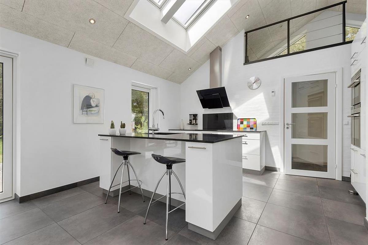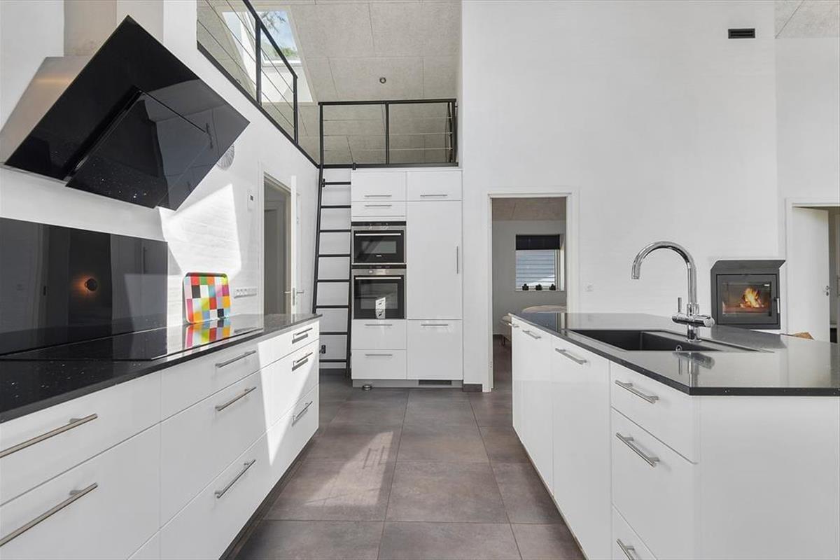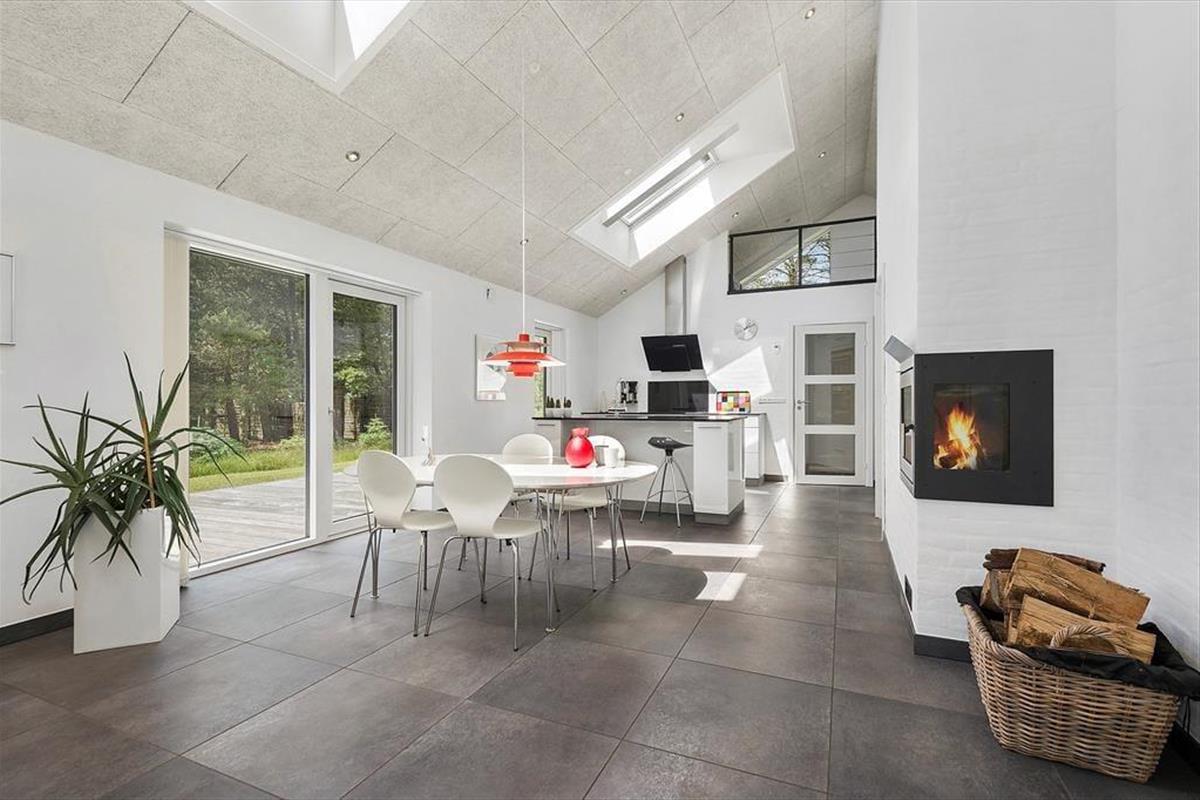 Die gewundenen Kiefern auf dem Naturgrundstück bilden einen schönen Kontrast zu den hellen Farbtönen und klaren Linien, die das Haus im Inneren schmücken. Nicht nur der Blick ins Grüne, sondern auch das Sonnenlicht wird durch die großen Fenster hereingelassen - auch durch die Oberlichter, die an einem wolkenlosen Abend sogar den Sternenhimmel sichtbar machen. Die Aufteilung des Hauses ist für sechs Personen gut geeignet, denn es stehen drei gute Schlafzimmer und zwei schöne Bäder zur Verfügung. Vom Wohnzimmer aus hat man Zugang zu einem Schlafboden, den die Kinder schnell als ihren Lieblingsspielplatz identifizieren werden. Die Erwachsenen können unten im Wohnzimmer bleiben, um zum Beispiel einen Kaffee mit Blick auf den Kamin zu trinken oder in der gut ausgestatteten offenen Küche zu kochen. Die Küche verfügt u.a. über einen Quooker, wovon man kochendes Wasser giessen kann.