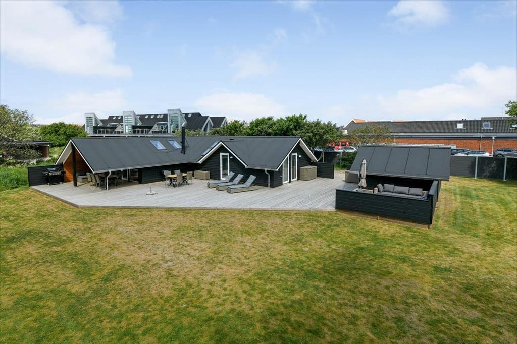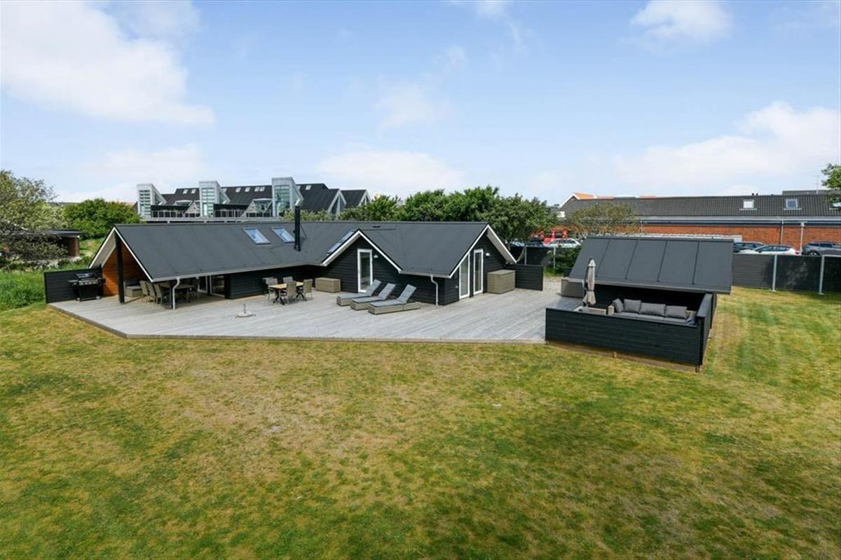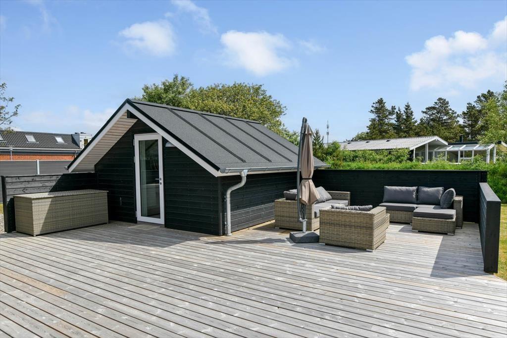 Draußen erwartet dich eine große und schöne überdachte Terrasse, die in den warmen Monaten fast wie ein zusätzliches Wohnzimmer fungiert. Hier kannst du geschützt vor Wind und Wetter ein gutes Essen oder eine Tasse Kaffee an der frischen Luft genießen. Die Terrasse ist mit modernen Gartenmöbeln ausgestattet, sodass du die Möglichkeit hast, dich zu entspannen und den Urlaub in vollen Zügen zu genießen. Der Garten rund um das Ferienhaus ist eine schöne Oase mit Platz zum Spielen und Entspannen. Hier können die Kinder sich austoben, während du dich zurücklehnst und die friedliche Atmosphäre genießt.