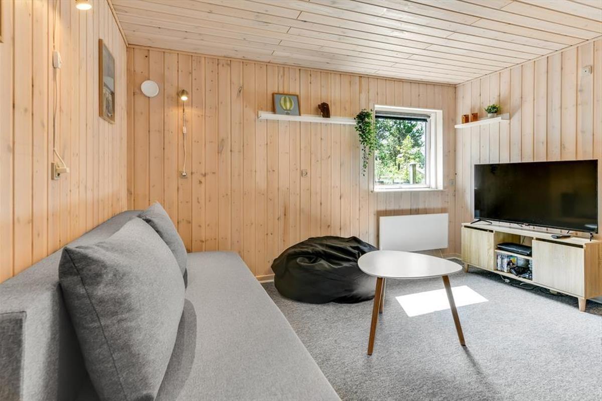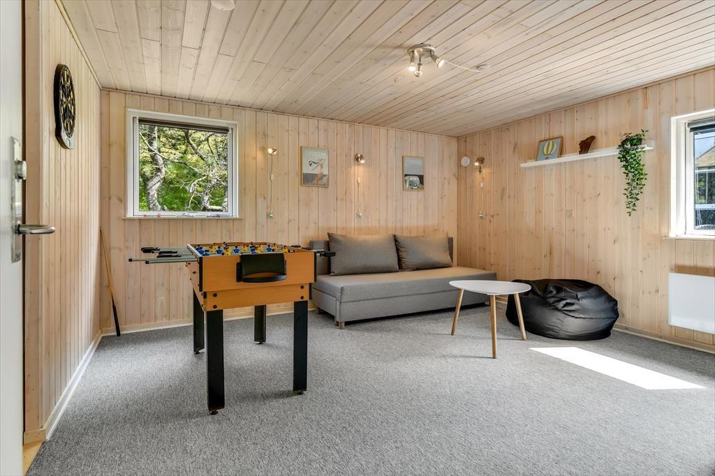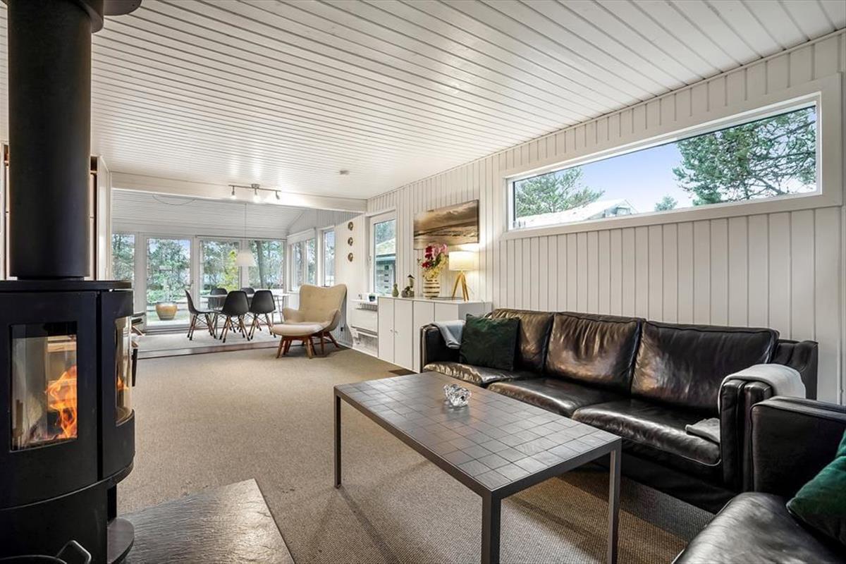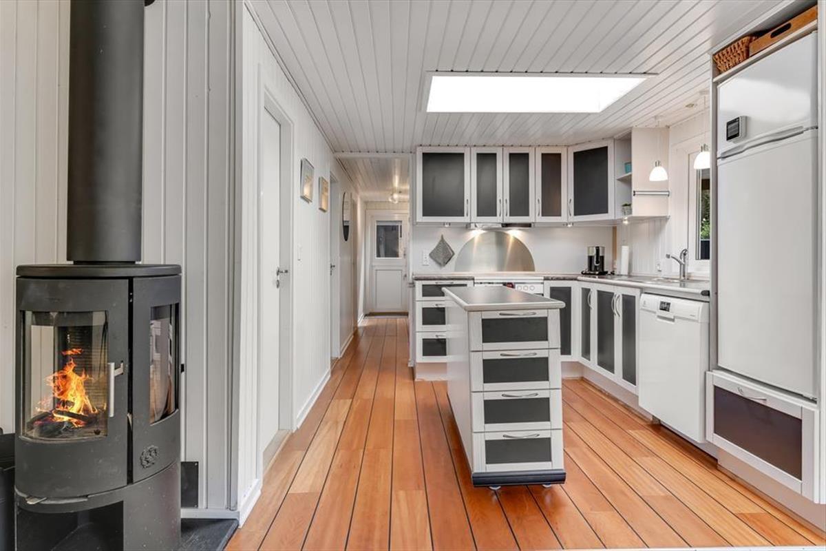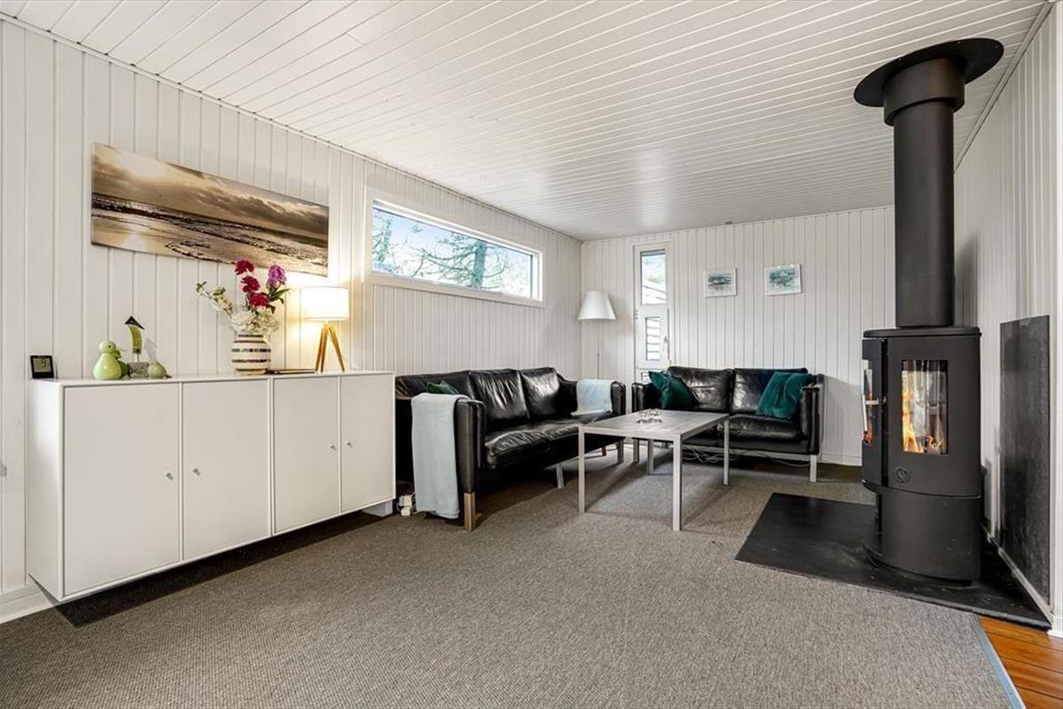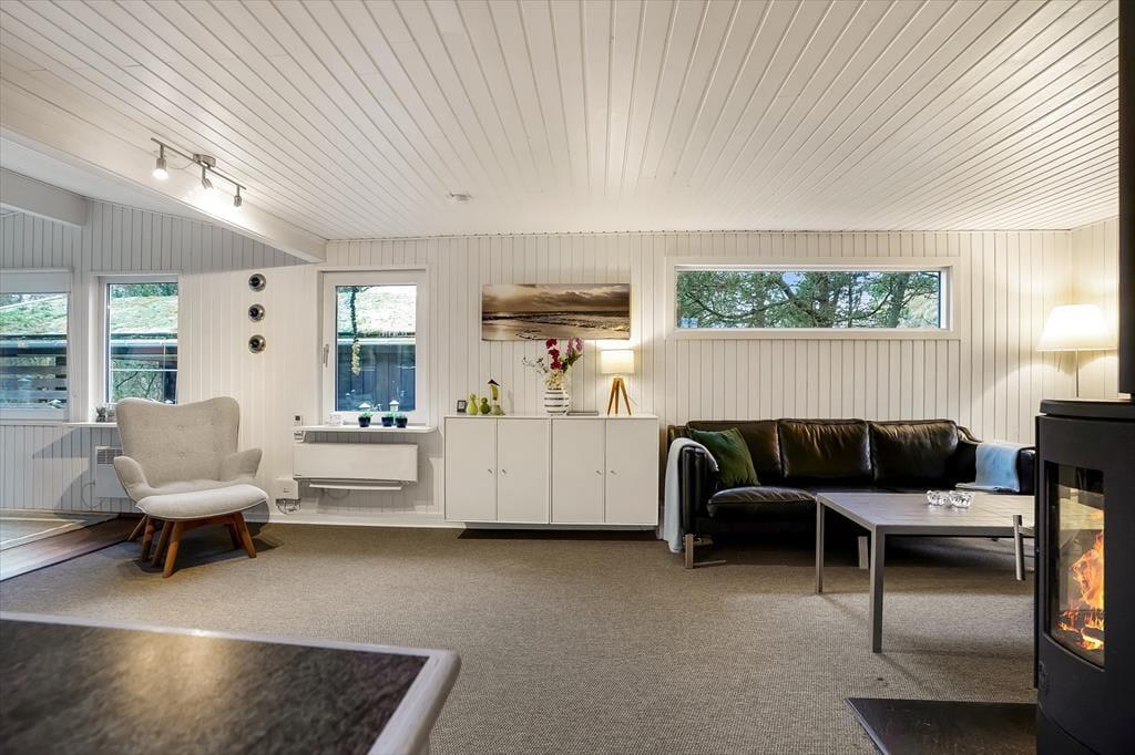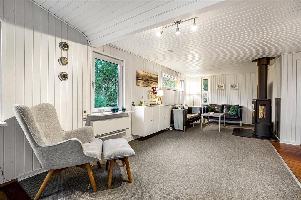Du wirst von der gemütlichen und angenehmen Atmosphäre des Hauses empfangen, sobald du eintrittst. Die drei Schlafzimmer und das geräumige Badezimmer tragen zum guten Gesamteindruck bei, aber die wachen Stunden des Tages wirst du wahrscheinlich hauptsächlich im Aufenthaltsraum verbringen, wo Wohnzimmer und Küche in offener Verbindung stehen. Wenn du gerne kochst, kannst du dich darauf freuen, viel Zeit in der gut ausgestatteten Küche zu verbringen – und wenn du es lieber entspannt magst, kannst du den Kaminofen anfeuern und es dir im Sofaeck gemütlich machen. Der Esstisch steht an einem Ende des Wohnzimmers, wo die Fenster nach drei Himmelsrichtungen ausgerichtet sind, sodass es sich fast wie in einem Wintergarten anfühlt, wenn du das Licht genießt und auf das grüne Grundstück blickst. Im Anbau findest du einen Aktivitätsraum mit unter anderem Tischfußball und Darts, die für viele Stunden Spaß und Unterhaltung sorgen.