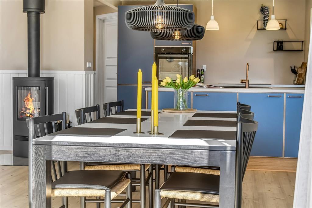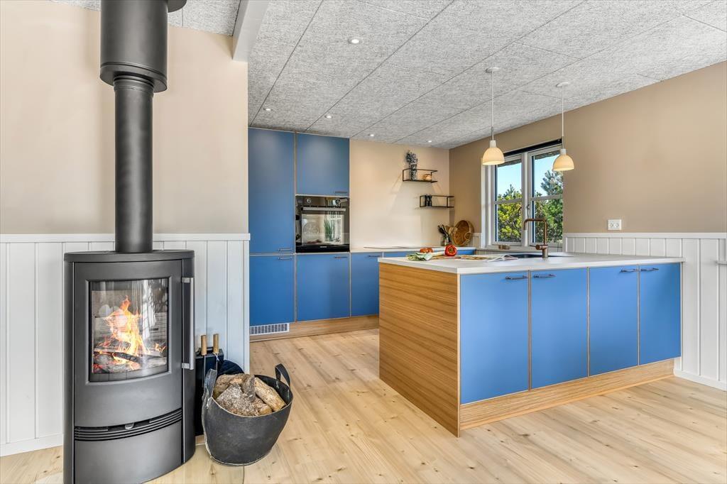 Innen empfängt dich ein helles und stimmungsvolles Ferienhaus, in dem Wohnbereich und Küche in einem offenen, luftigen Raum vereint sind. Durch die großen Fenster strömt das Tageslicht herein, und mit dem Kamin als gemütlichem Mittelpunkt ist alles für entspannte Stunden auf dem Sofa vorbereitet – mit dem Knistern des Feuers im Hintergrund. Die Küche ist praktisch eingerichtet und lädt zum Kochen ein, während man sich weiterhin ungezwungen über die Kochinsel hinweg unterhalten kann. Im ersten Stock erwartet dich ein weiteres Herzstück: ein gemütlicher Aufenthaltsraum – perfekt für einen ruhigen Abend mit Spielen, einem guten Buch oder einfach purer Entspannung. Von hier aus hast du sogar einen Blick auf die majestätische Nordsee, die du genießen kannst, ganz gleich, ob sie in der Sonne glitzert oder sich von ihrer dramatischen Seite zeigt. Der ideale Ort, um völlig abzuschalten und die Zeit stillstehen zu lassen.