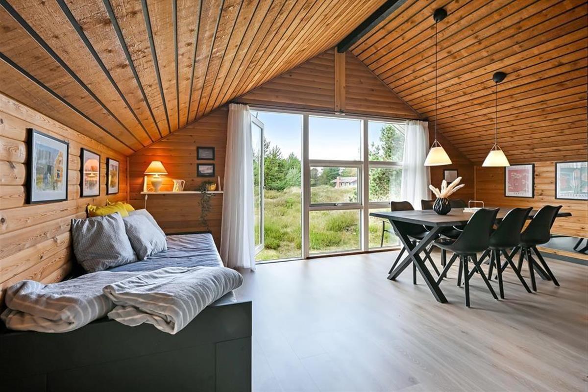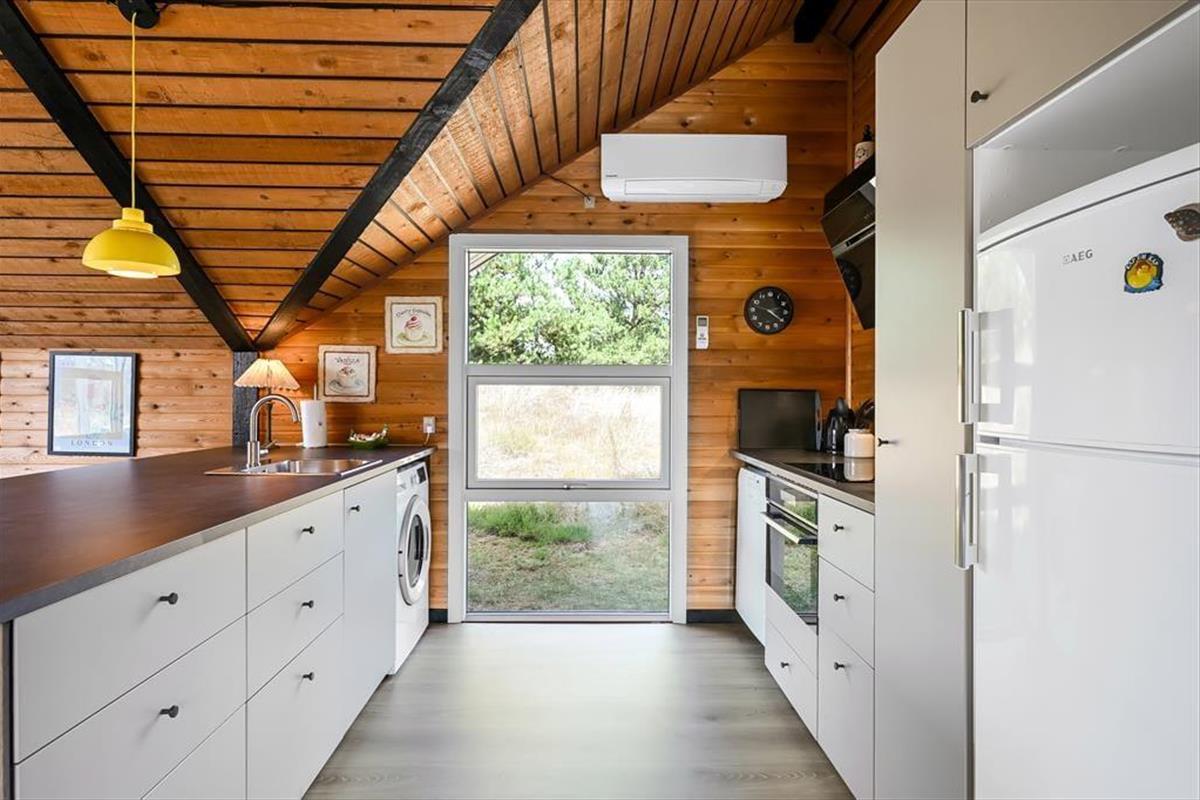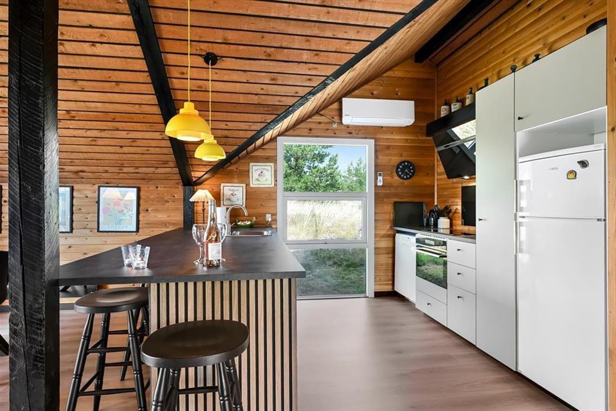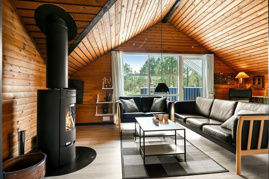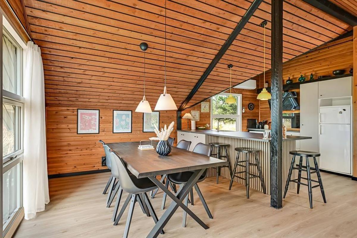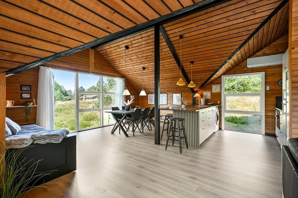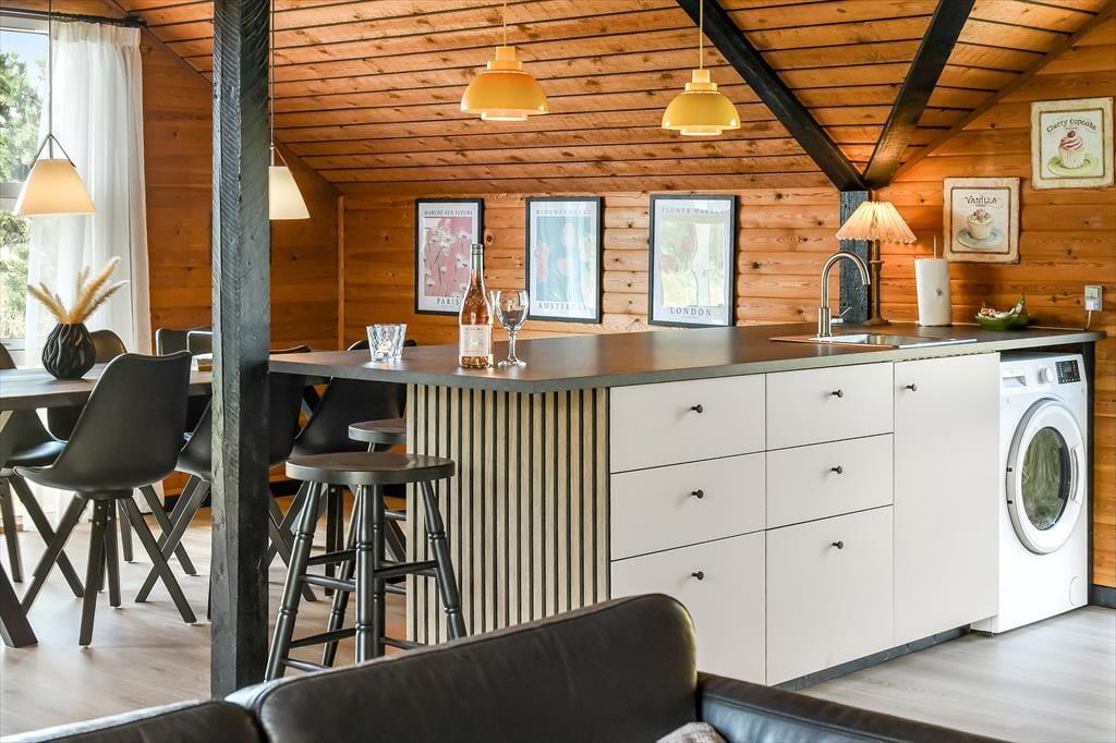 Das Ferienhaus ist älteren Datums, wurde aber modernisiert und vereint Nostalgie und zeitgemäßen Komfort auf schönste Weise. Drinnen erwartet dich eine warme und einladende Atmosphäre: Mit holzverkleideten Wänden und Decken strahlt es den klassischen Charme eines dänischen Sommerhauses aus, während die Modernisierung für Helligkeit und angenehme Aufenthaltsqualität sorgt. Das Wohnzimmer ist der natürliche Treffpunkt des Hauses – hier kannst du es dir mit einem guten Buch auf dem Sofa gemütlich machen, während das Feuer im Kaminofen knistert und die Fenster das Licht und die Farben der Natur ins Haus holen. Die Mahlzeiten werden mühelos in der offenen Küche zubereitet – hier hast du viel Platz und kannst während des Kochens mit deinen Liebsten plaudern. Wenn der Tag sich dem Ende neigt, findest du Ruhe in den Schlafzimmern, die zu Entspannung und langen, ungestörten Nächten einladen. Hier findest du Raum für genau den Urlaubsmodus, den du suchst – ob Gemütlichkeit, Zusammensein oder Ruhe und Rückzug.