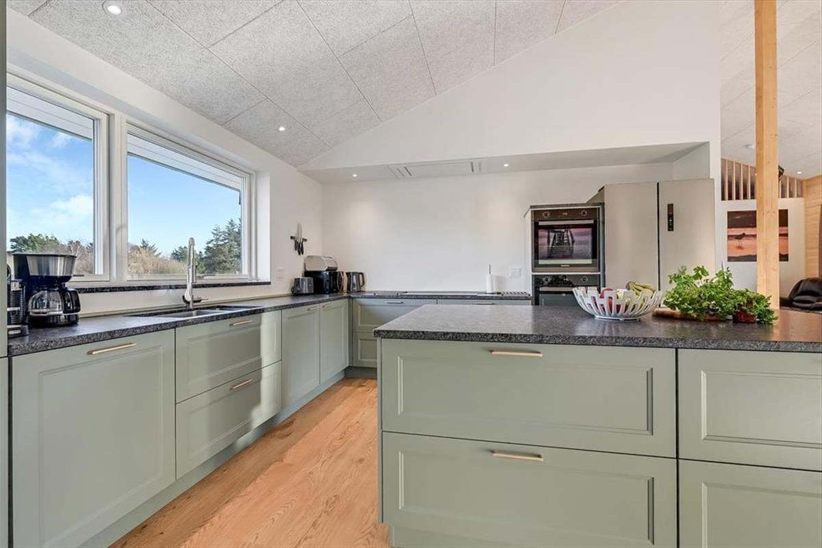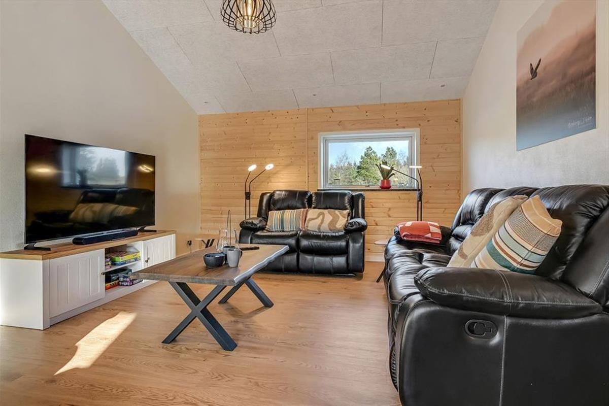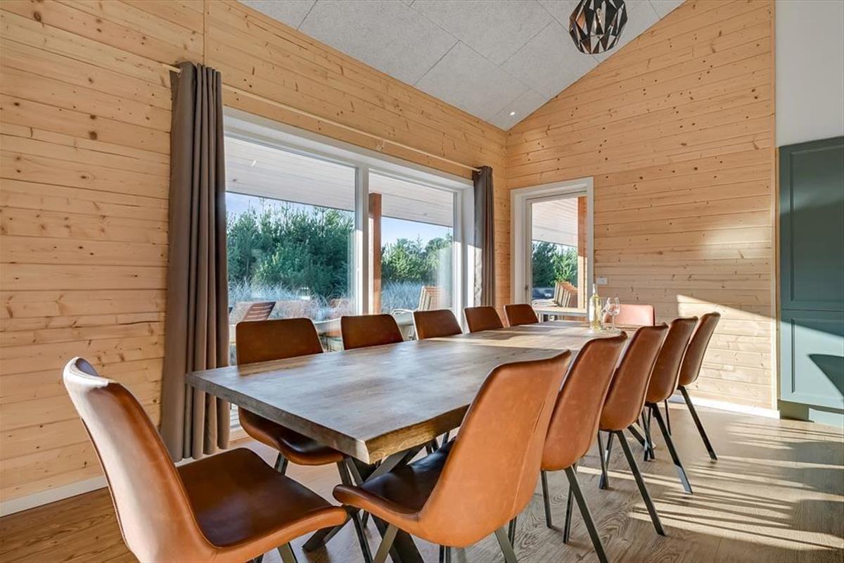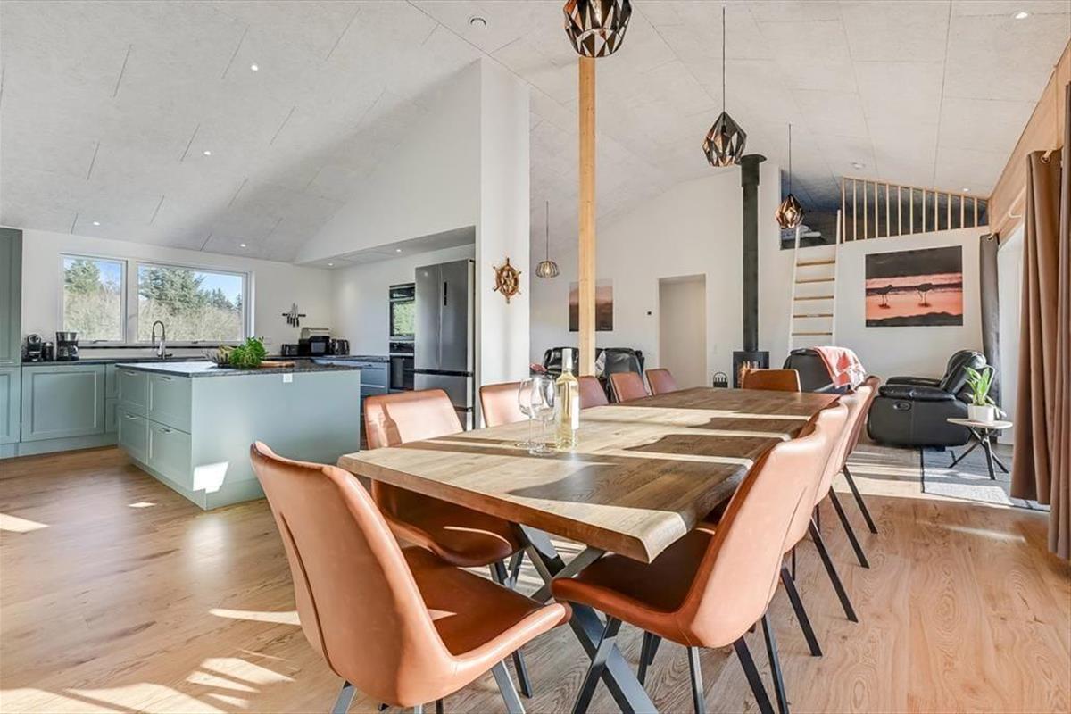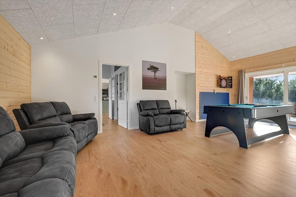 Im Inneren empfängt dich ein stilvolles und einladendes Ferienhaus, in dem Großzügigkeit und Qualität Hand in Hand gehen. Die große Wohnküche ist der natürliche Treffpunkt des Hauses und bietet viel Platz für die ganze Familie – ganz gleich, ob gemeinsam gekocht, der Tisch für gesellige Mahlzeiten gedeckt oder bei Spielen und Gesprächen am Esstisch entspannt wird. Große Fensterfronten lassen viel Tageslicht herein und schaffen eine angenehme Atmosphäre, die das Gefühl von Weite und Ruhe unterstreicht. Das Ferienhaus verfügt über vier große Schlafzimmer mit Doppelbetten sowie zusätzlich über zwei Schlafböden mit Doppelbett, die für zusätzliche Flexibilität sorgen und das Haus ideal für mehrere Generationen oder größere Familien machen. Der Wellnessbereich ist etwas ganz Besonderes: Hier kannst du die wohltuende Wärme der Sauna genießen und die Entspannung mit direktem Zugang zum Außen-Whirlpool fortsetzen – perfekt nach einem Tag an der frischen westjütischen Luft. Und wenn der Wettbewerbsgeist erwacht, steht der Aktivitätsraum bereit für viele Stunden Spaß und freundschaftliche Wettkämpfe.
