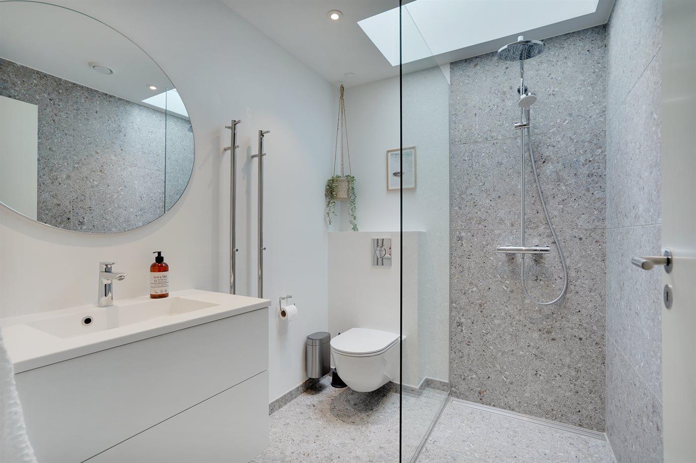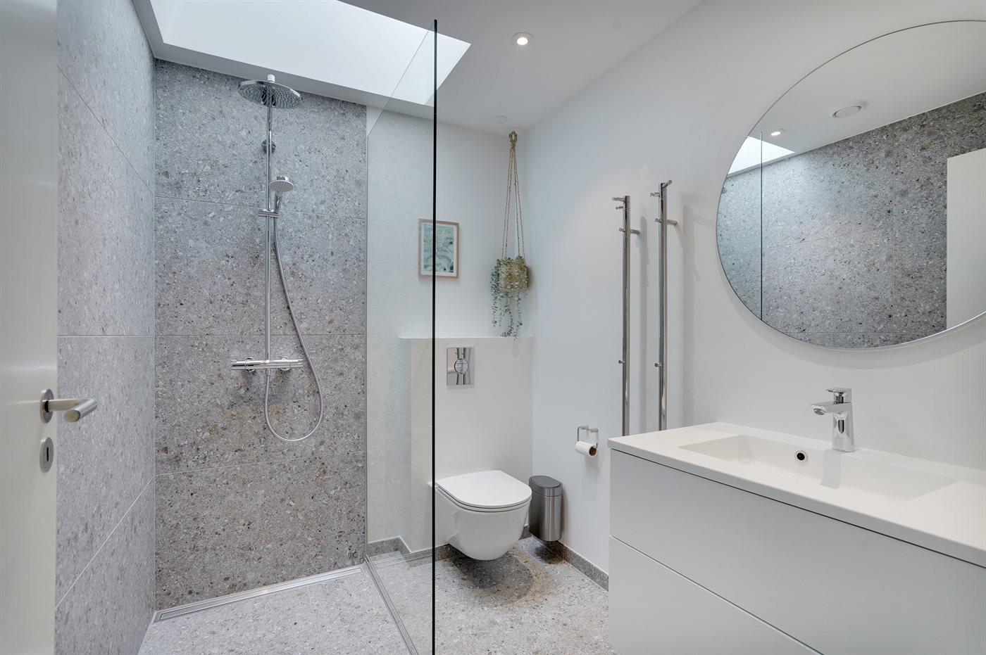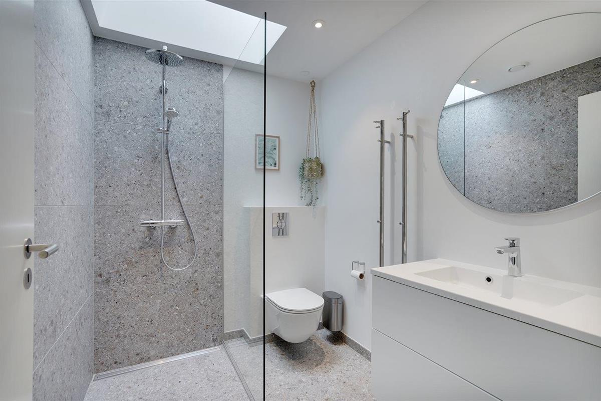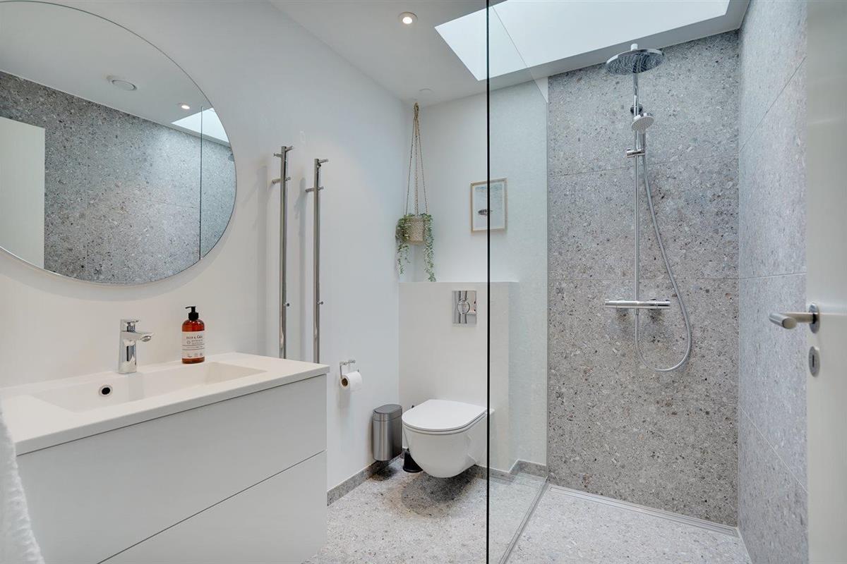 Er is 2 badkamers met douchehok en 3 toiletten, waarvan 1 gastentoilet. Er is vloerverwarming in 2 van de badkamers.
