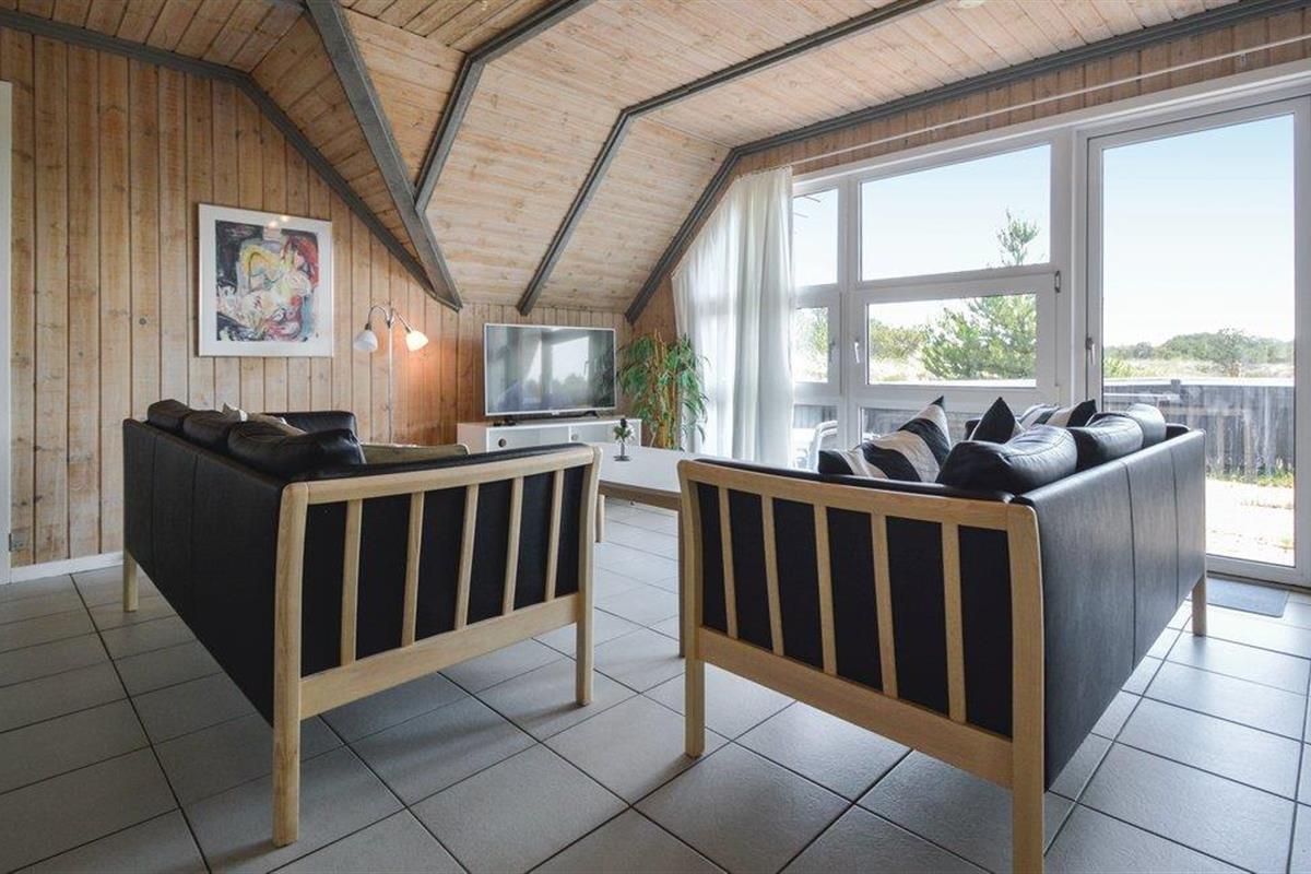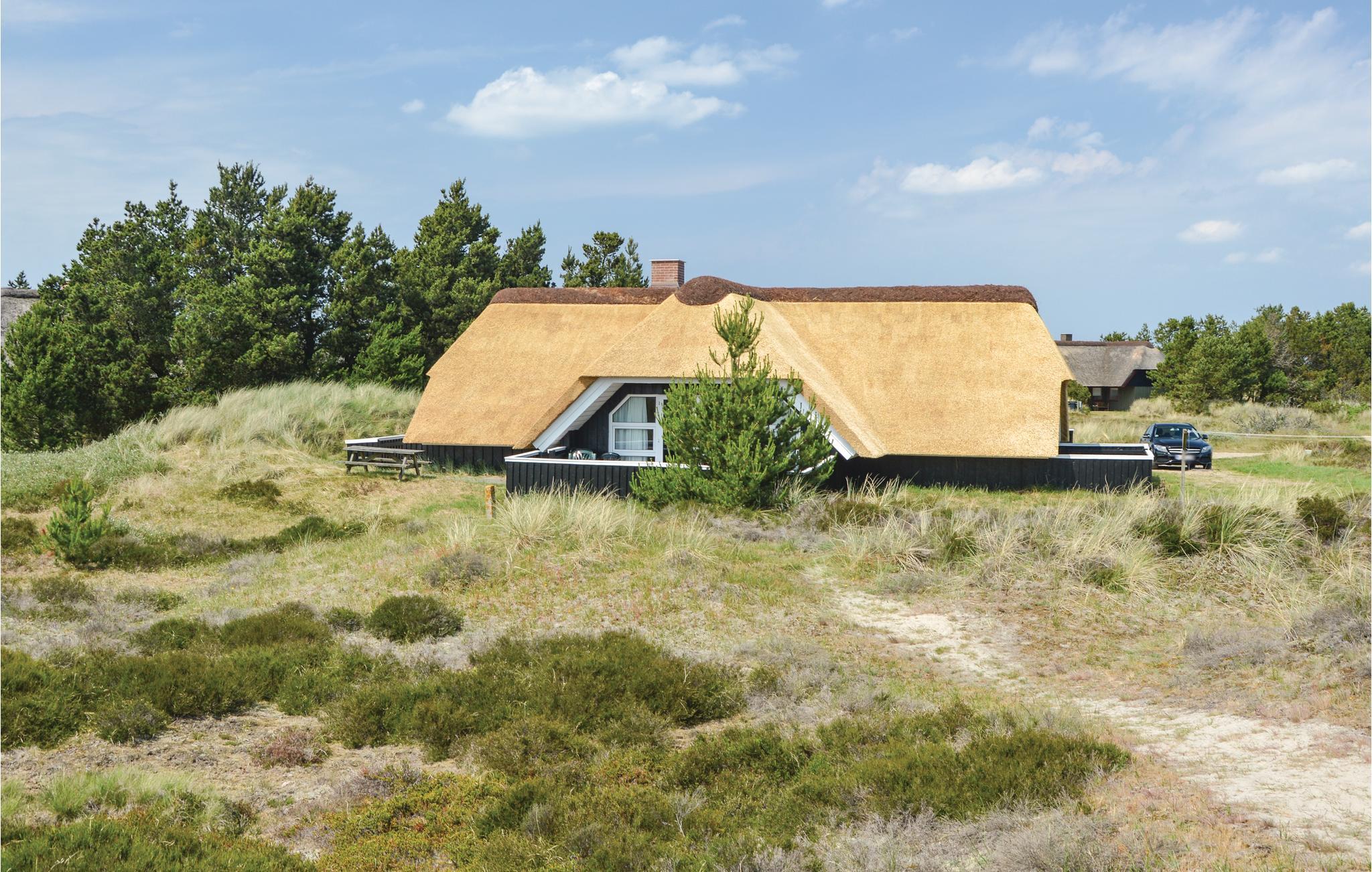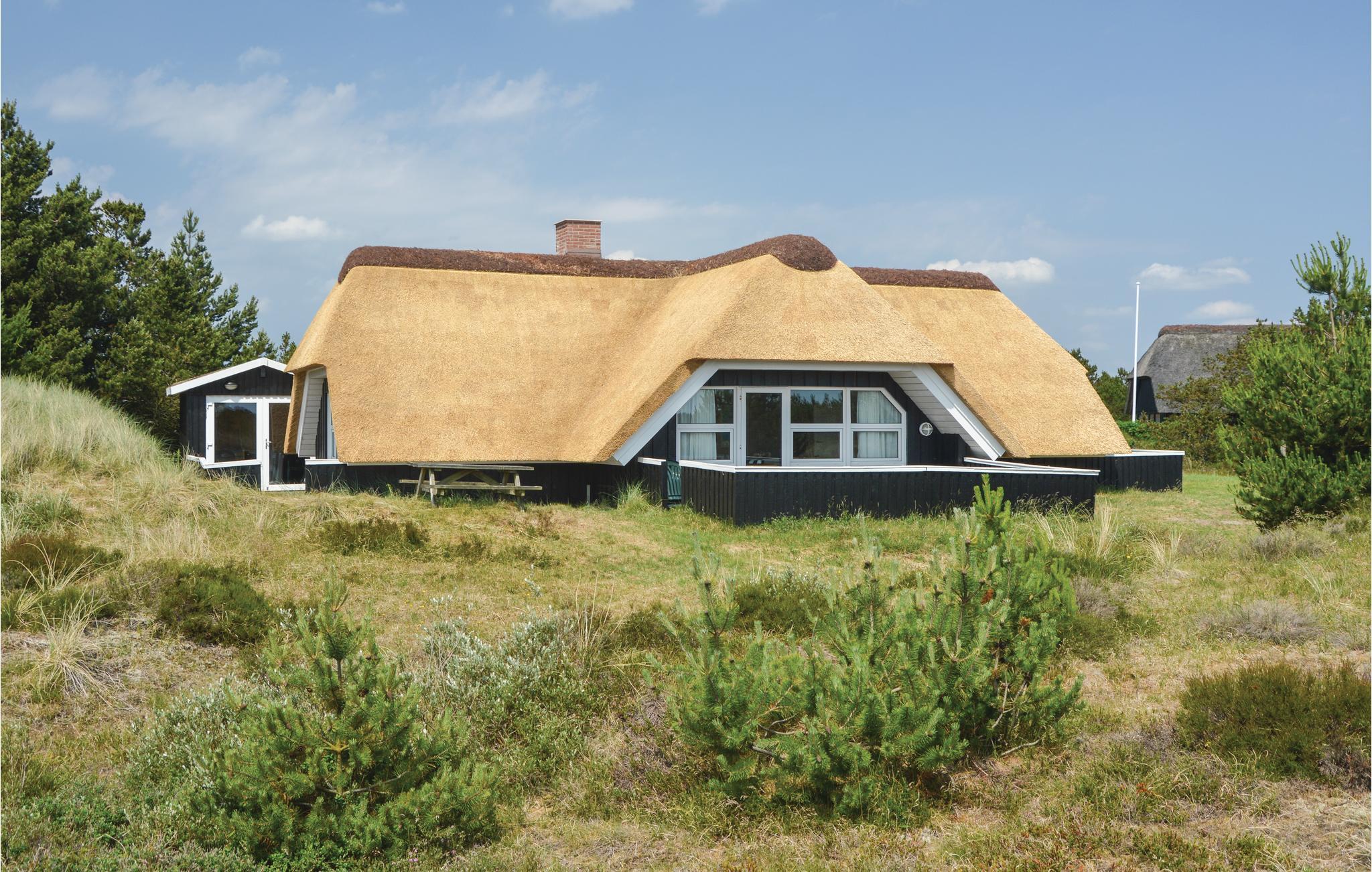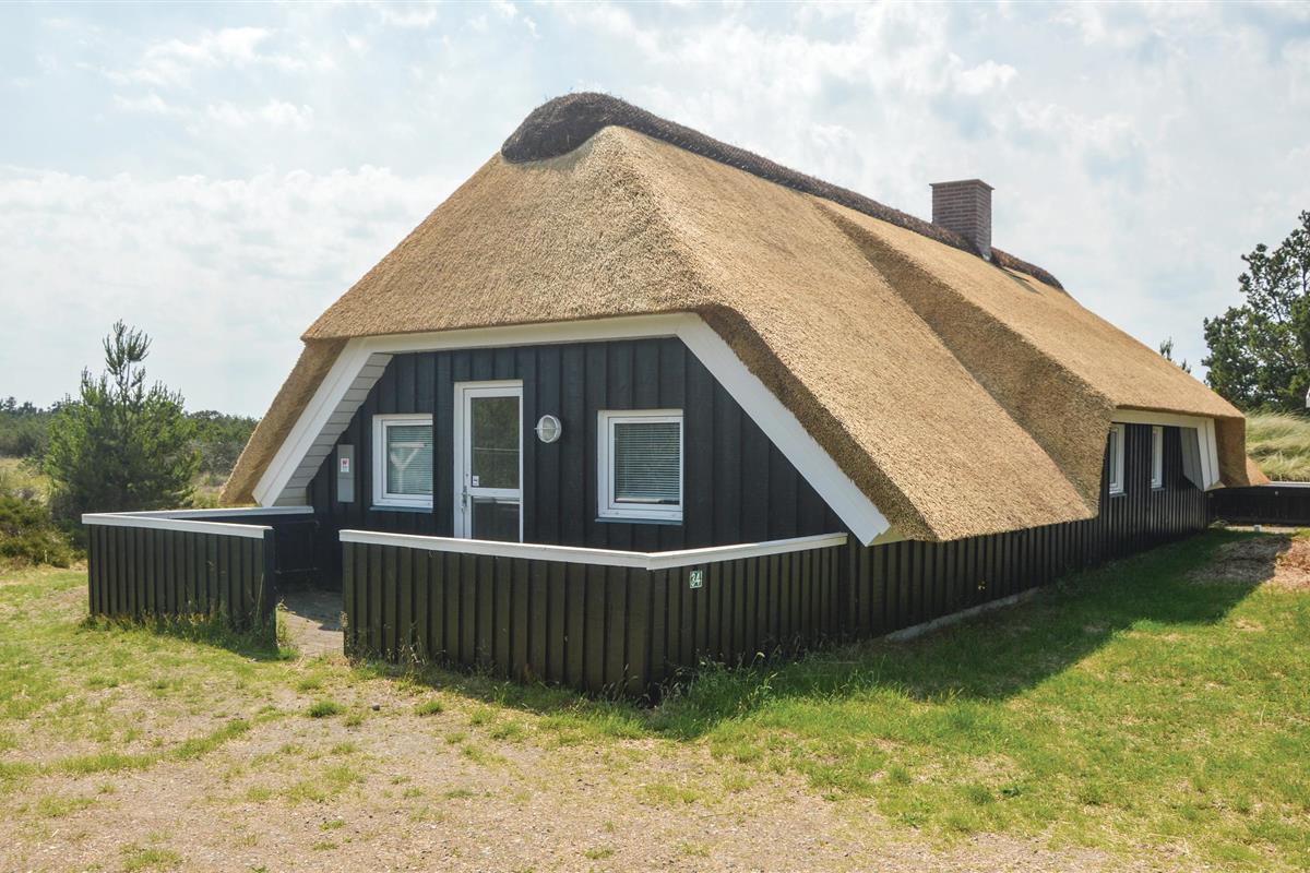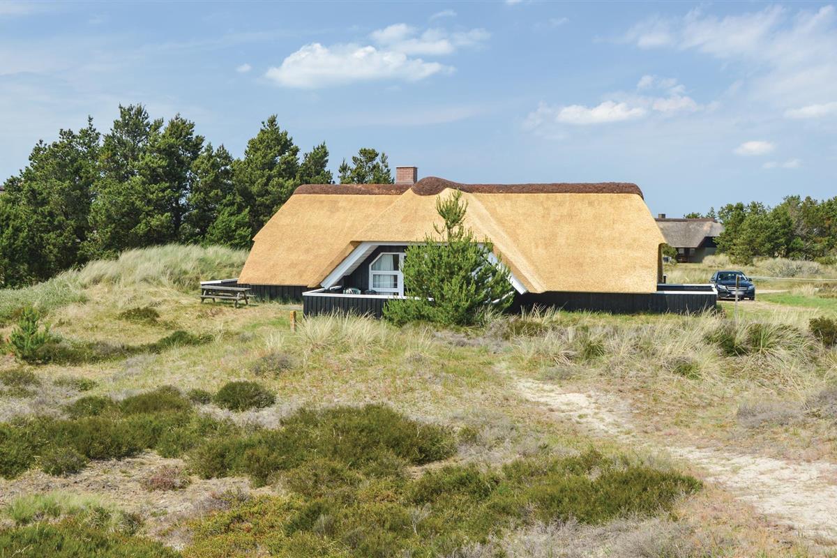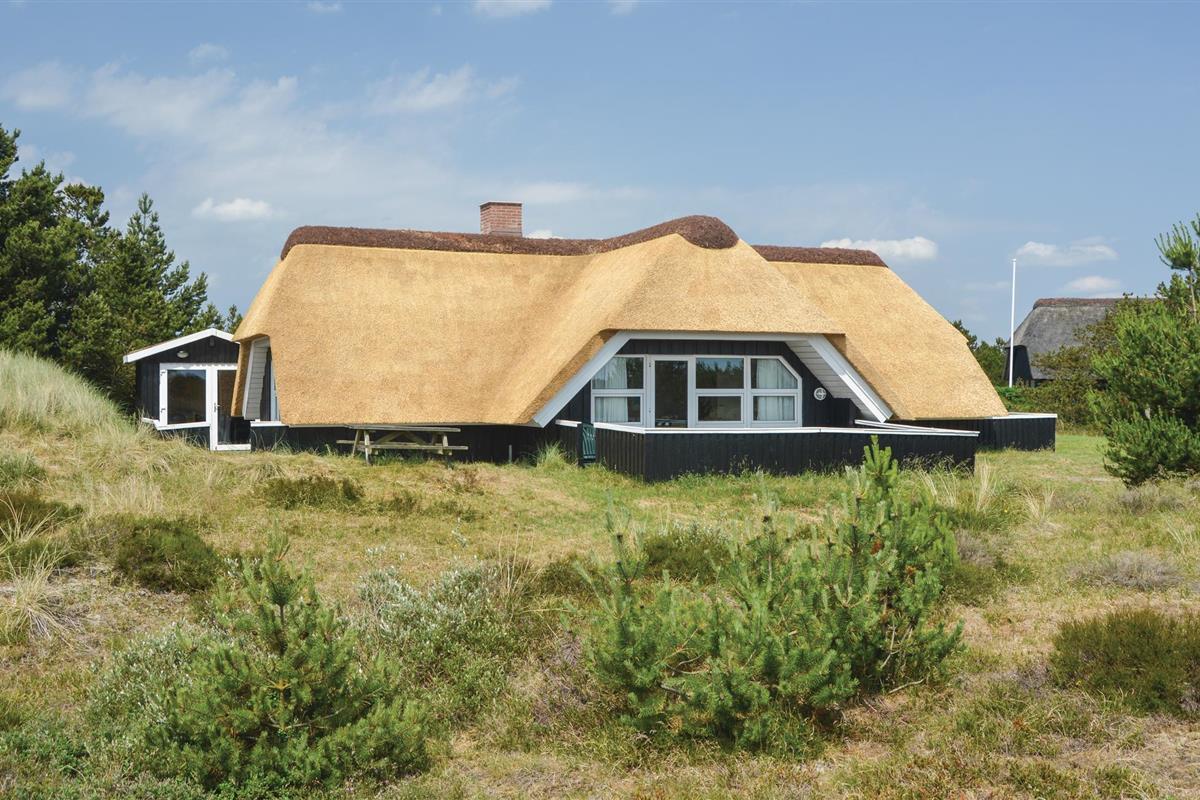 In het noorden van Blåvand, op een groot natuurgrondstuk met veel speelruimte, staat dit chique, rietgedekte houten vakantiehuis.