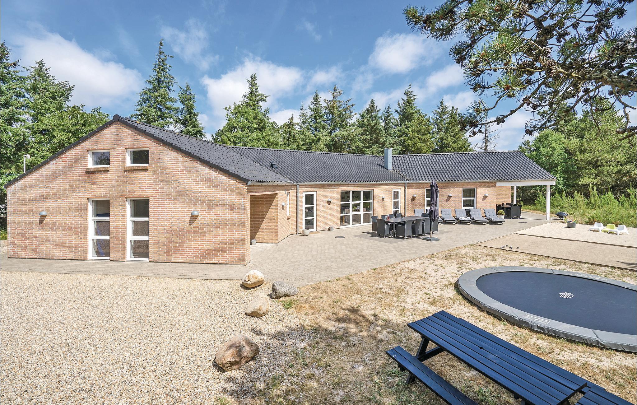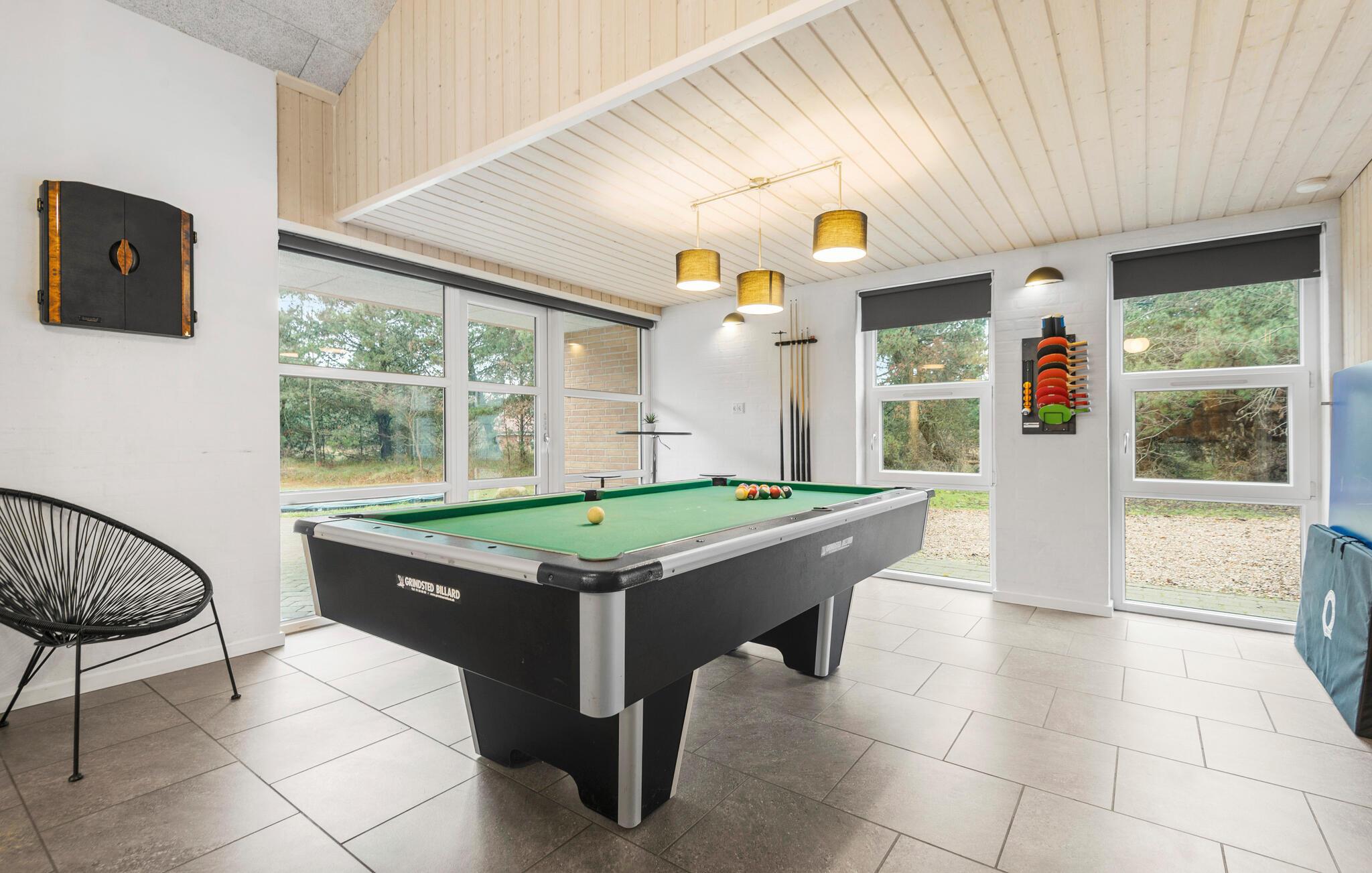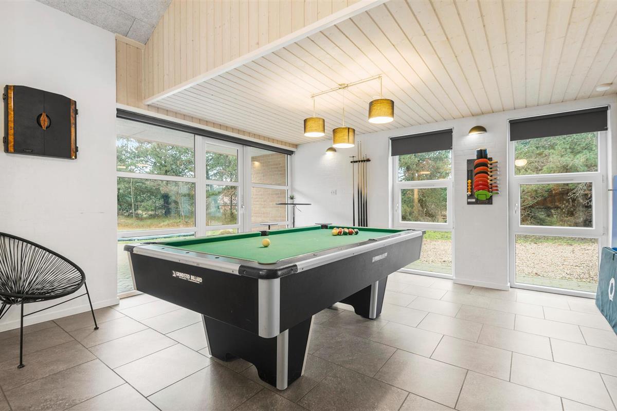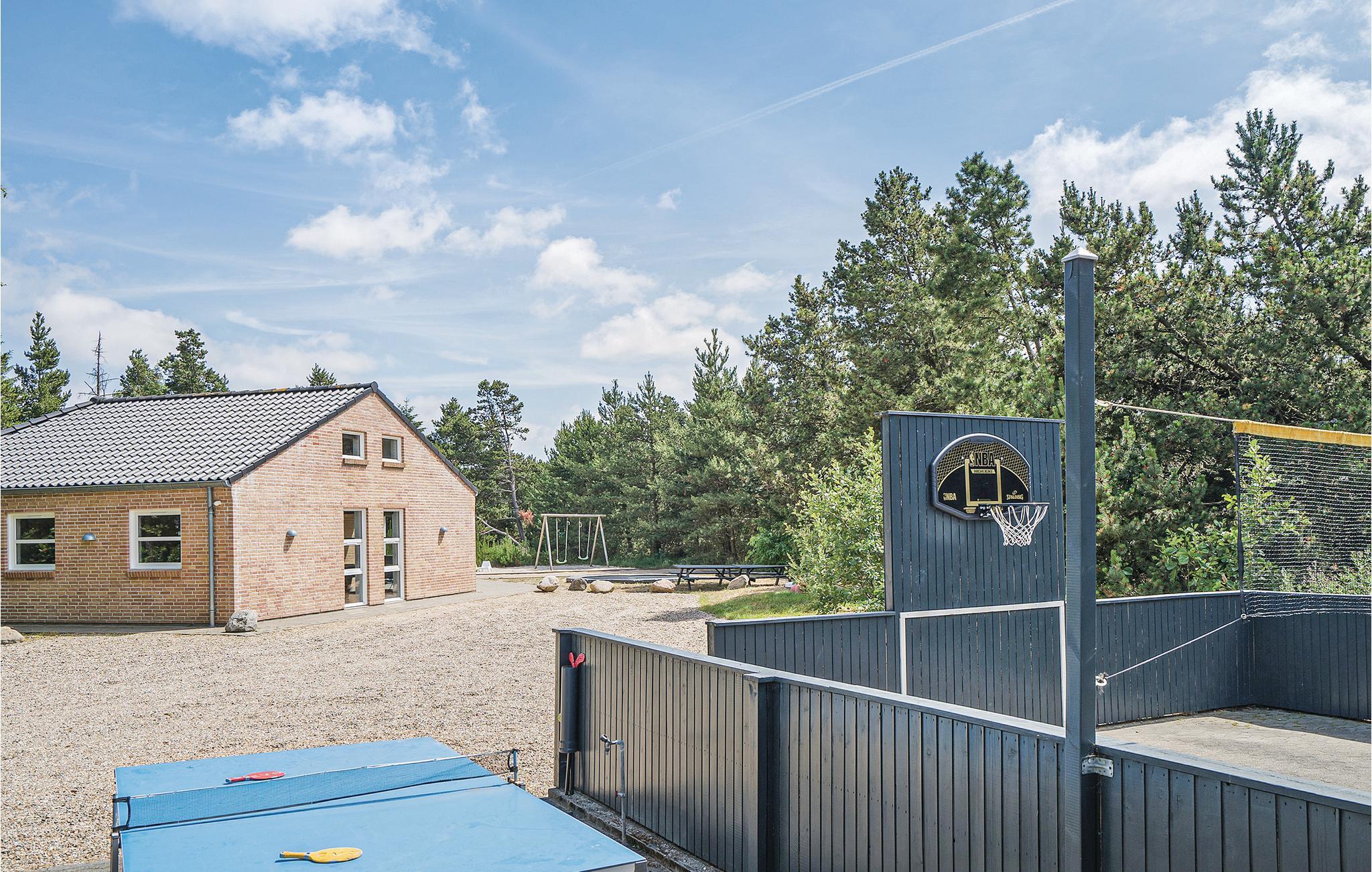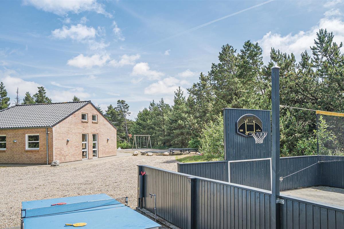 Prachtig huis met doordachte architectuur. Het wacht op u op een ongestoord natuurterrein dat plezier en ontspanning biedt voor alle leeftijden. U kunt er onder andere voetballen of basketballen. De keuken is het hart van het huis, het is een heerlijke plek om samen te komen, vanuit de keuken en het woongedeelte kijkt u in de zwembadruimte. Entertainment wordt ook verzorgd door de activiteitenruimte. In de zwembadruimte zijn er extra douches naast de whirlpool en de sauna. Rondom het huis zijn er grote terrassen om te ontspannen. Het huis is zeer goed geïsoleerd en wordt uitsluitend verwarmd met aardwarmte. Hoewel het huis groot is, hoeft u geen hogere stookkosten te verwachten. Een Boxer Max TV abonnement biedt vele Deense TV zenders.
