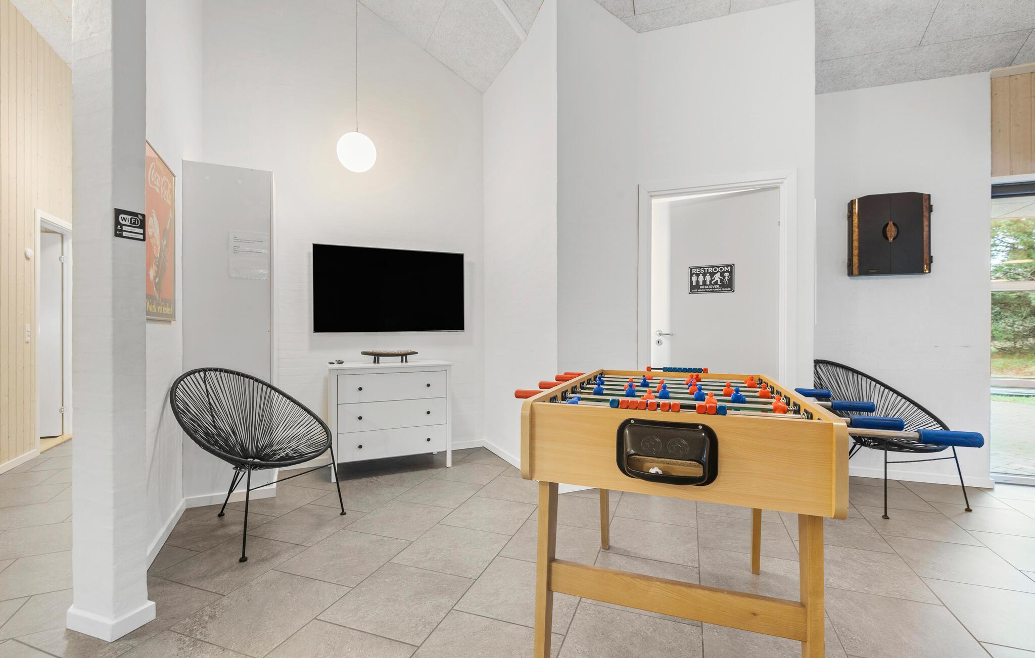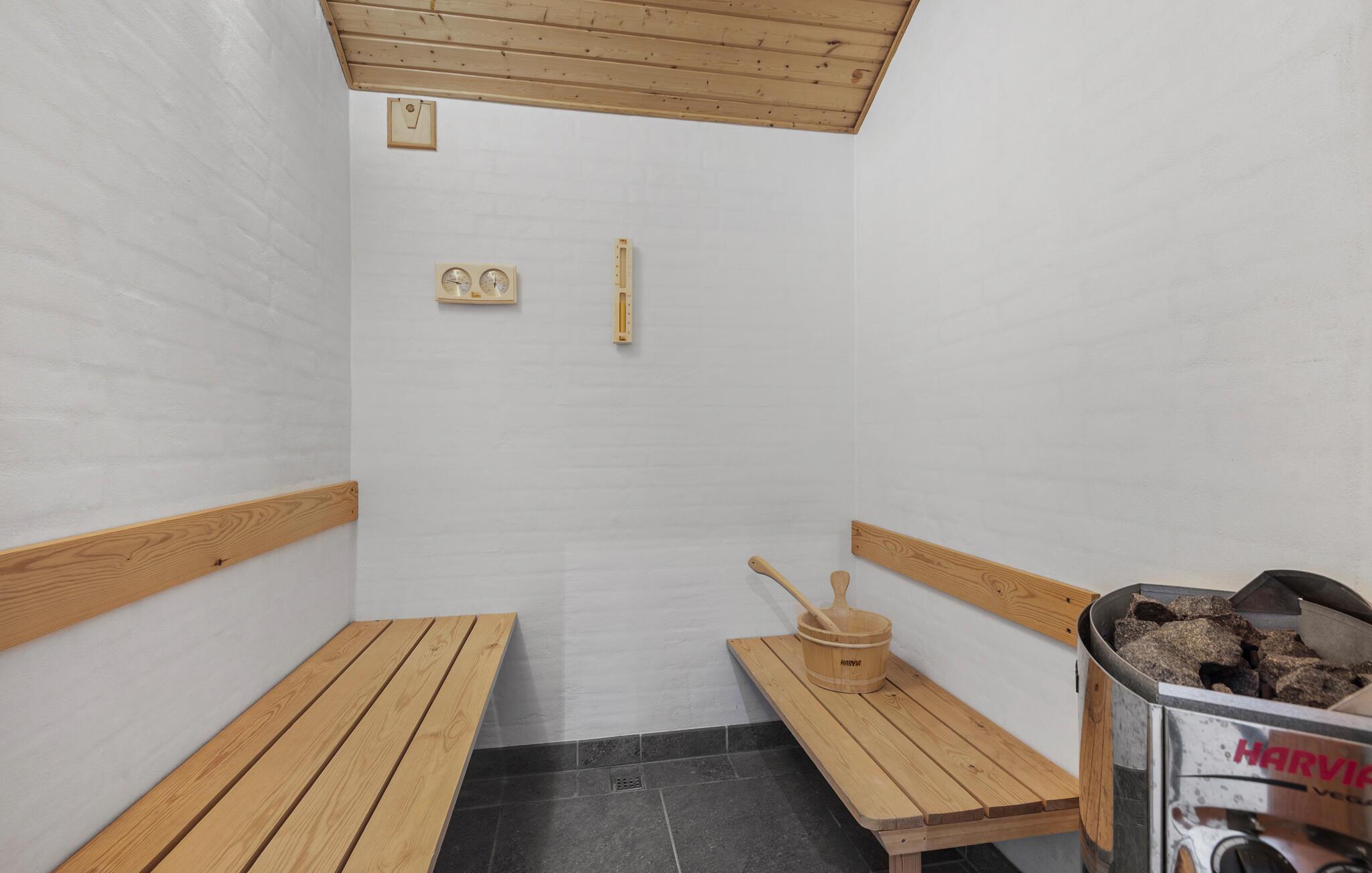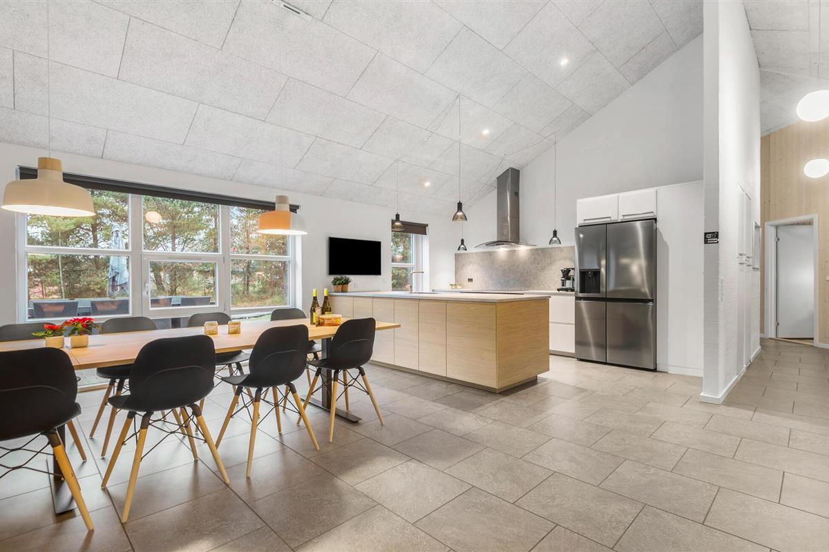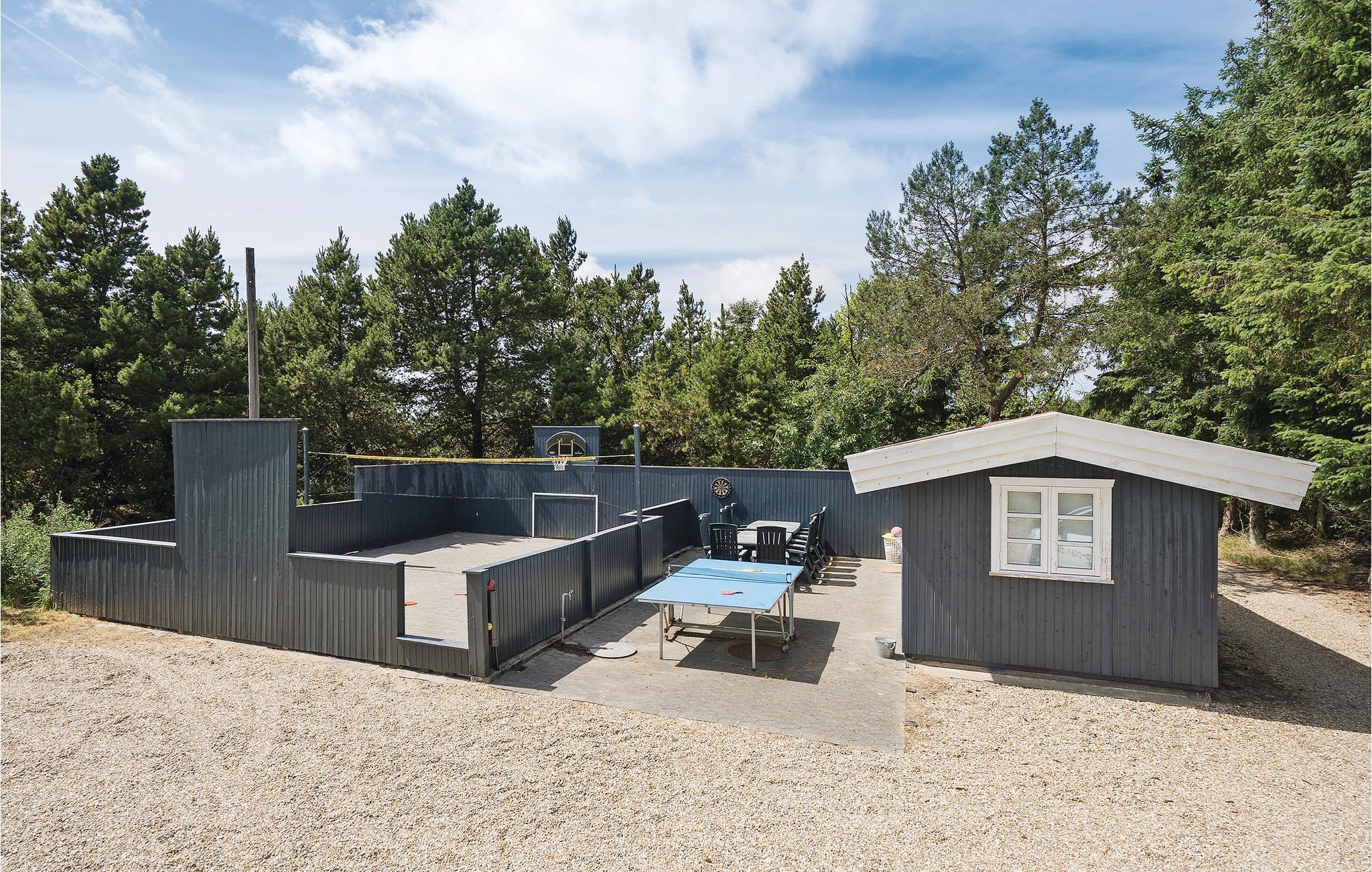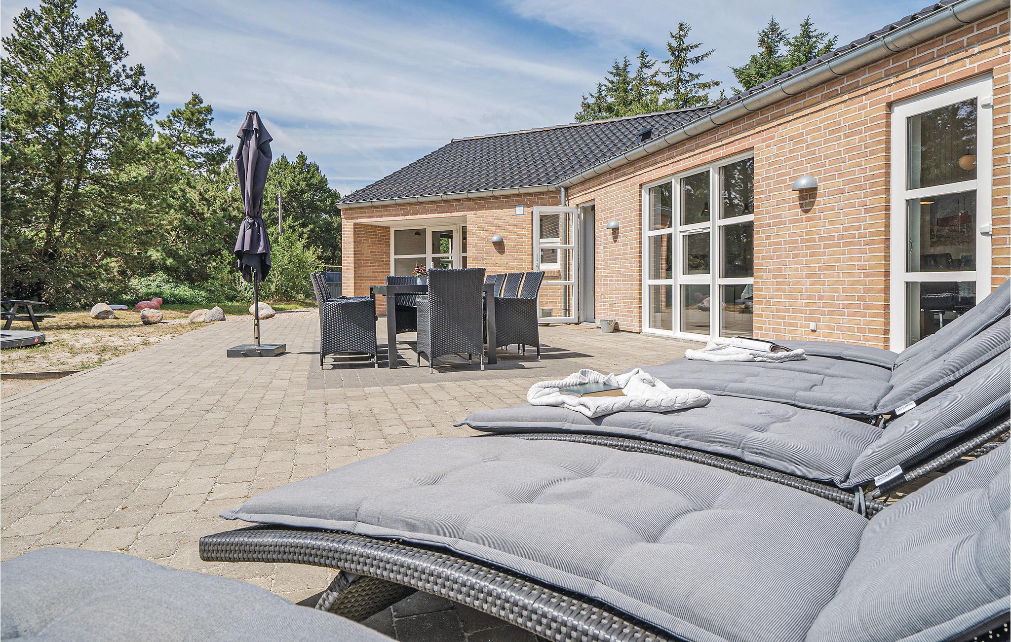Prachtig huis met doordachte architectuur. Het wacht op u op een ongestoord natuurterrein dat plezier en ontspanning biedt voor alle leeftijden. U kunt er onder andere voetballen of basketballen. De keuken is het hart van het huis, het is een heerlijke plek om samen te komen, vanuit de keuken en het woongedeelte kijkt u in de zwembadruimte. Entertainment wordt ook verzorgd door de activiteitenruimte. In de zwembadruimte zijn er extra douches naast de whirlpool en de sauna. Rondom het huis zijn er grote terrassen om te ontspannen. Het huis is zeer goed geïsoleerd en wordt uitsluitend verwarmd met aardwarmte. Hoewel het huis groot is, hoeft u geen hogere stookkosten te verwachten. Een Boxer Max TV abonnement biedt vele Deense TV zenders.