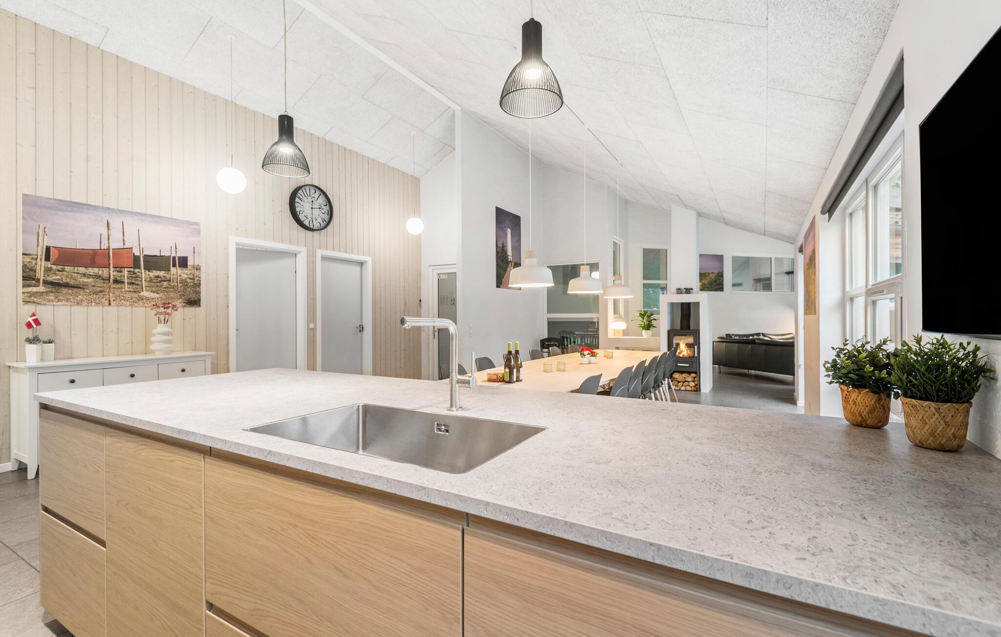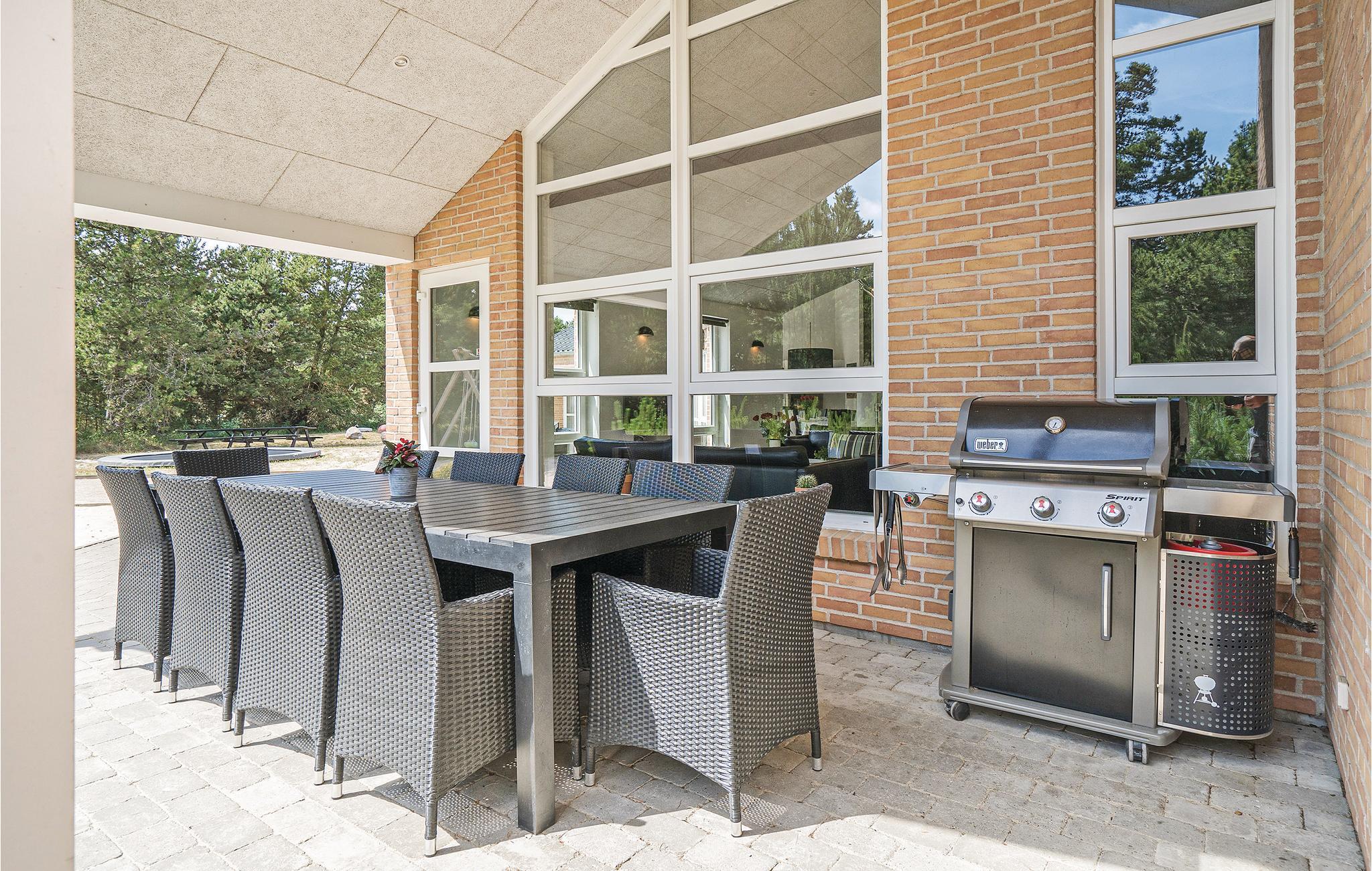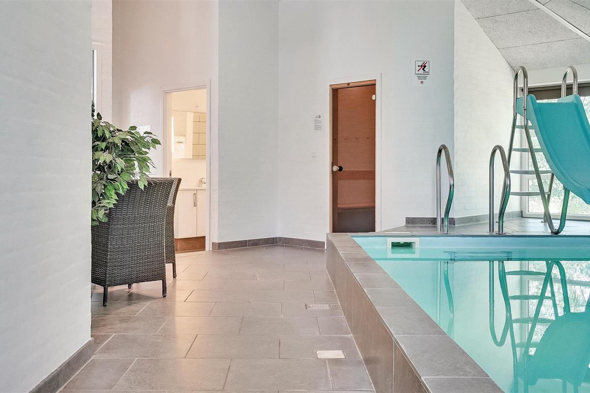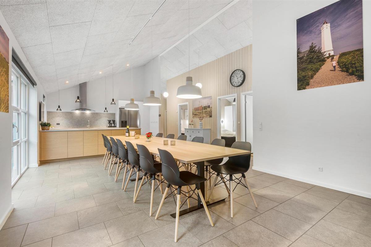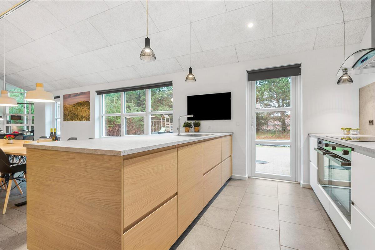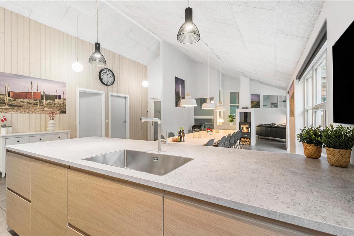Prachtig huis met doordachte architectuur. Het wacht op u op een ongestoord natuurterrein dat plezier en ontspanning biedt voor alle leeftijden. U kunt er onder andere voetballen of basketballen. De keuken is het hart van het huis, het is een heerlijke plek om samen te komen, vanuit de keuken en het woongedeelte kijkt u in de zwembadruimte. Entertainment wordt ook verzorgd door de activiteitenruimte. In de zwembadruimte zijn er extra douches naast de whirlpool en de sauna. Rondom het huis zijn er grote terrassen om te ontspannen. Het huis is zeer goed geïsoleerd en wordt uitsluitend verwarmd met aardwarmte. Hoewel het huis groot is, hoeft u geen hogere stookkosten te verwachten. Een Boxer Max TV abonnement biedt vele Deense TV zenders.