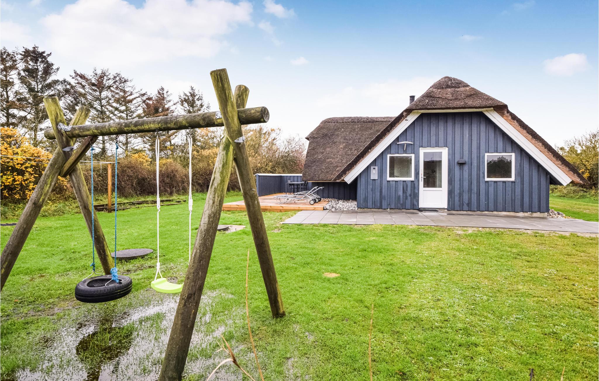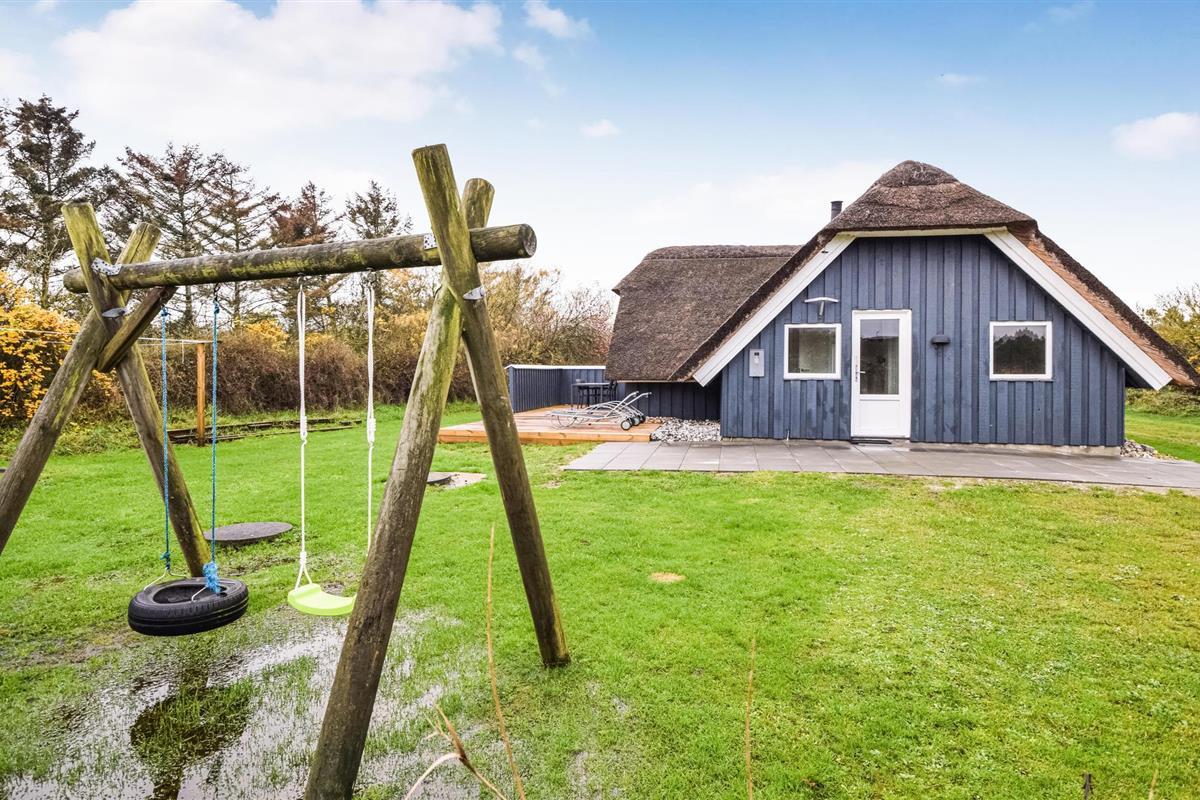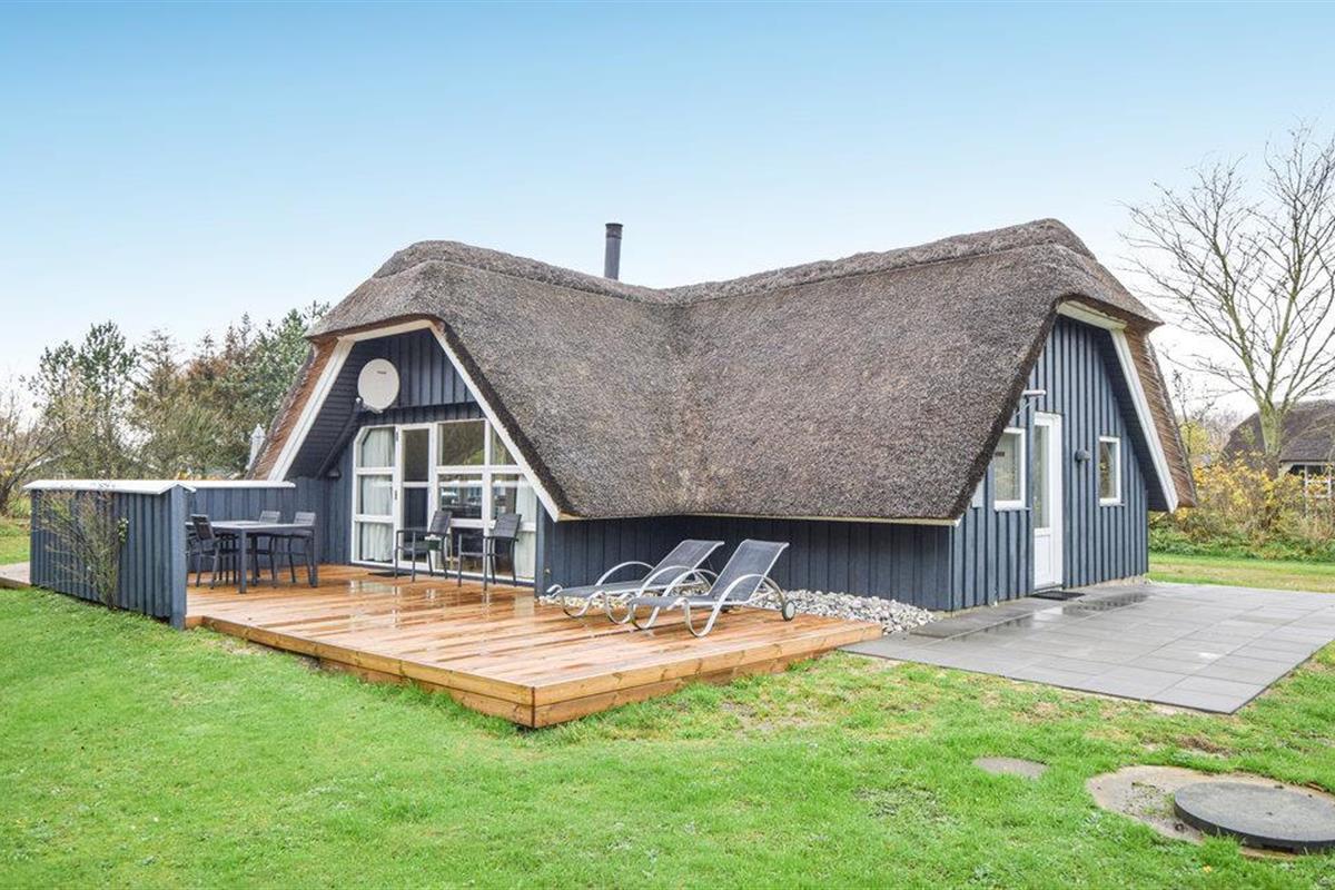 Geniet van dit charmante houten vakantiehuis met rieten dak, jacuzzi en open haard, slechts 400 m van het strand in Blåvand, Denemarken.