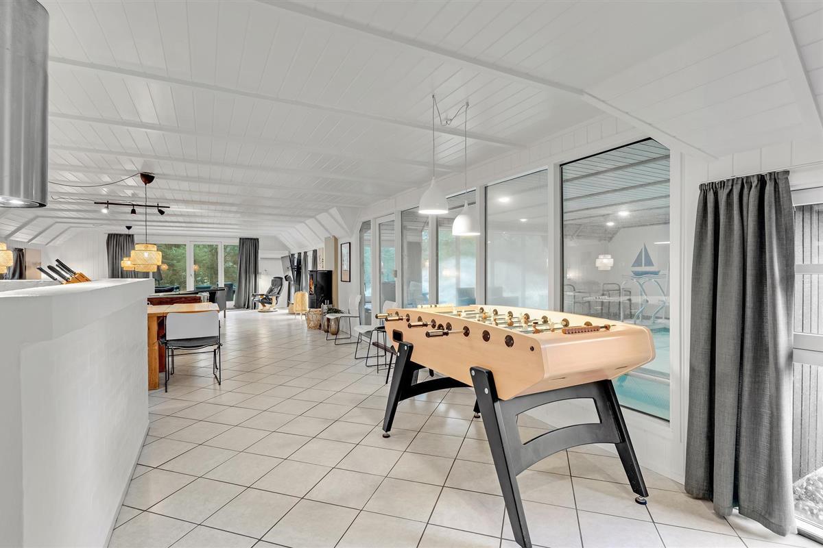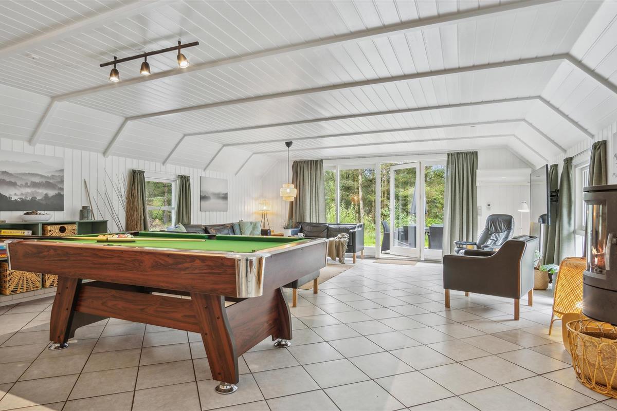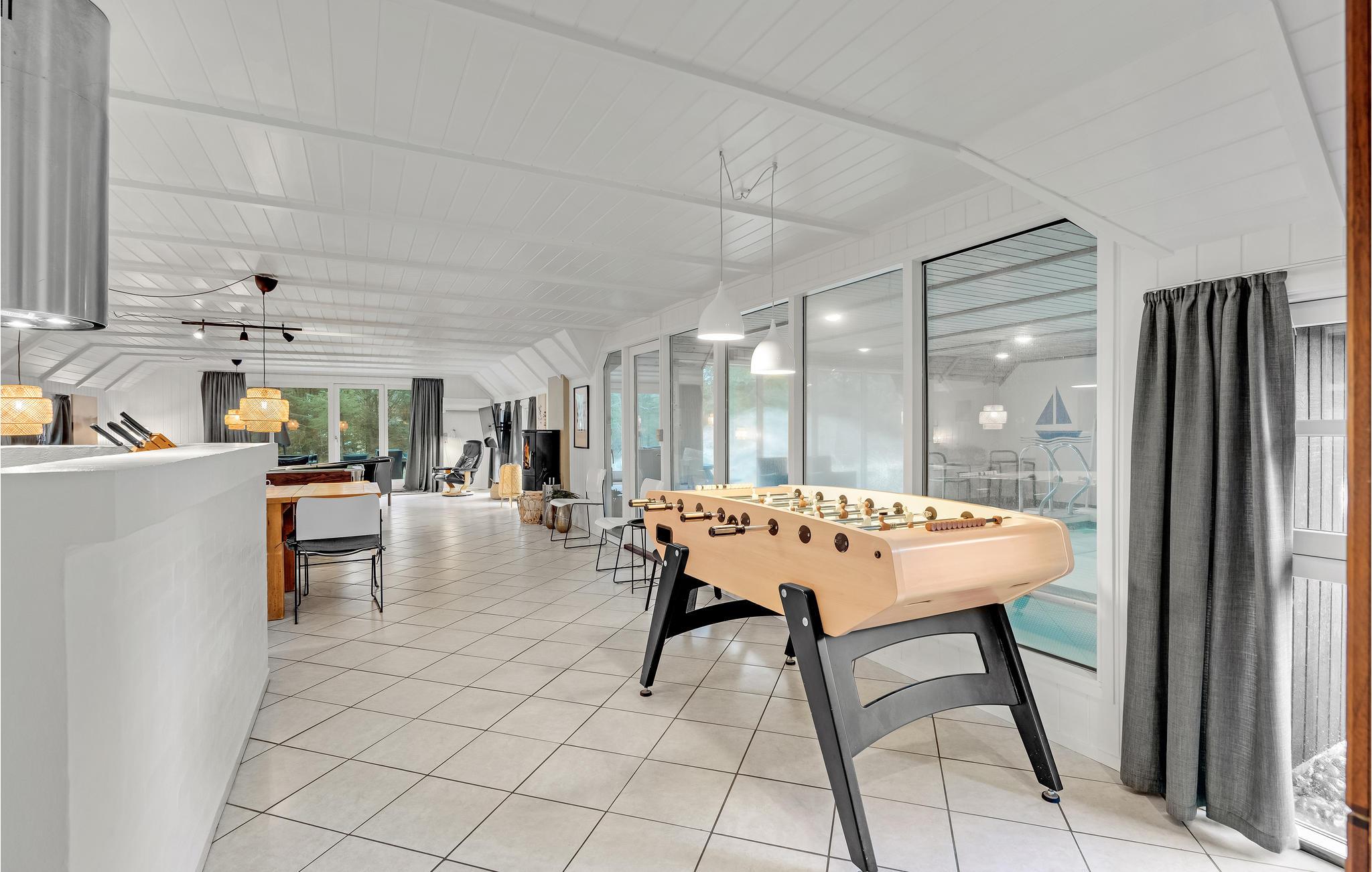 Verlangt u naar een grote familievakantie of wilt u met vrienden en familie op reis? Dan heeft u hier het ideale vakantiehuis gevonden. Alle gasten en uw viervoeters zullen zich hier thuis voelen. De grote en open leefruimte richt uw blik op het zwembad, dat slechts door een vensterfront wordt gescheiden. Uw kinderen kunnen zich dus vermaken in het zwembad terwijl u comfortabel uw koffie drinkt aan de eettafel of op de bank. Een spelletje tafelvoetbal of biljart is ook mogelijk. De verbonden woon- en activiteitenruimte belooft dus gezelligheid. De tuin nodigt ook uw kinderen uit om te spelen, want verspreid over de tuin staan speeltoestellen. In de warme maanden kunt u ook barbecueën op het terras en buiten genieten van uw vakantiemaaltijden.