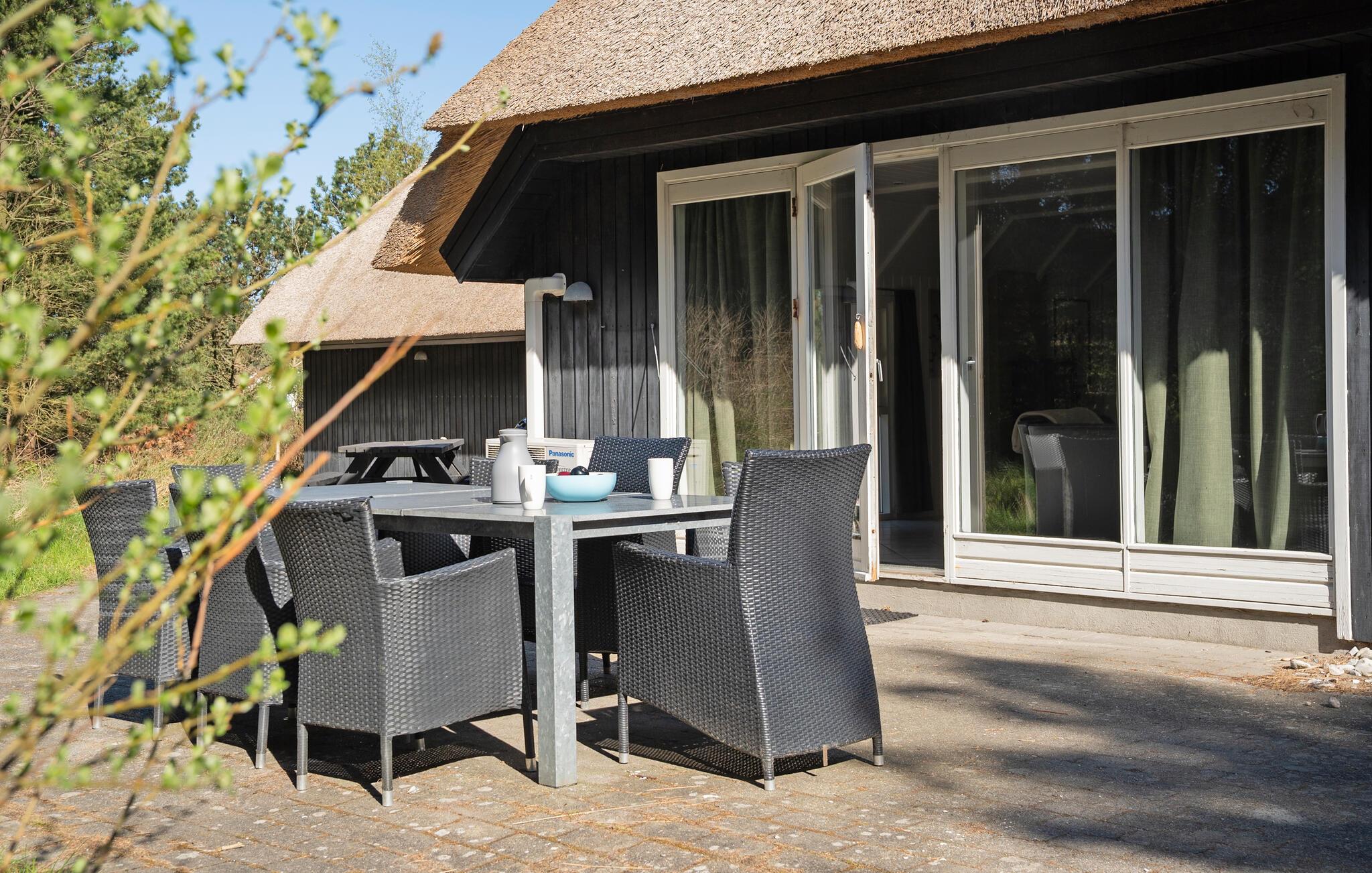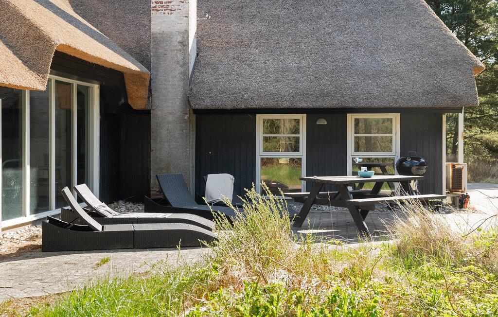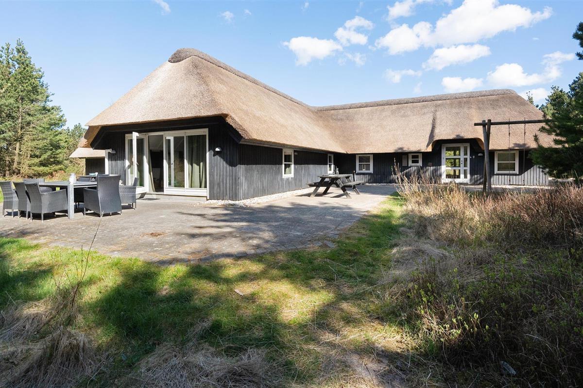 Breng een ontspannende vakantie door in het populaire vakantieoord Blåvand in een ruim rietgedekt huis met zwembad en sauna.