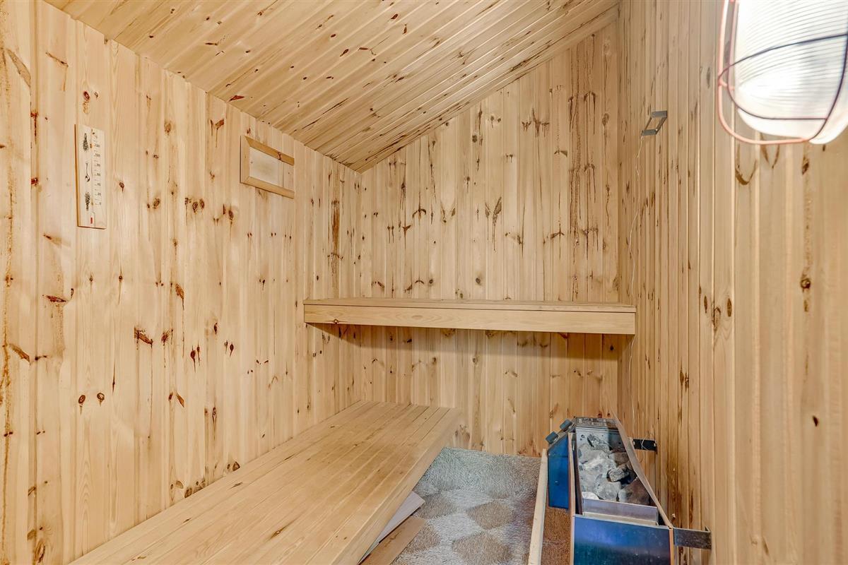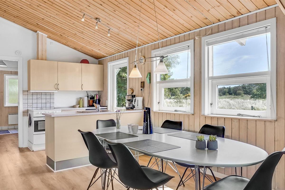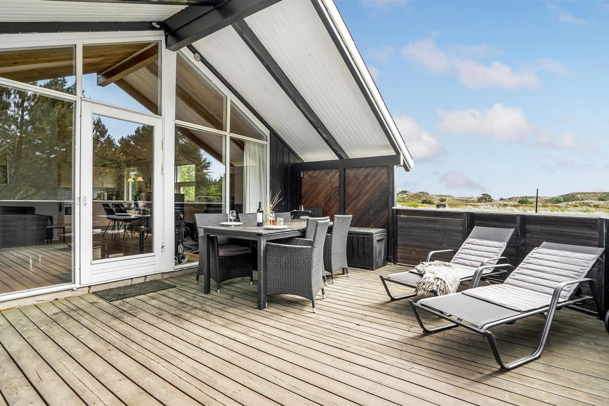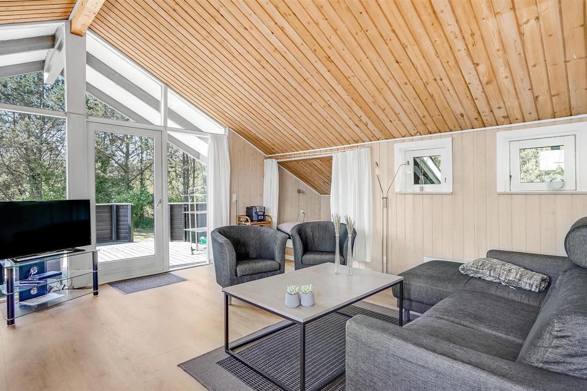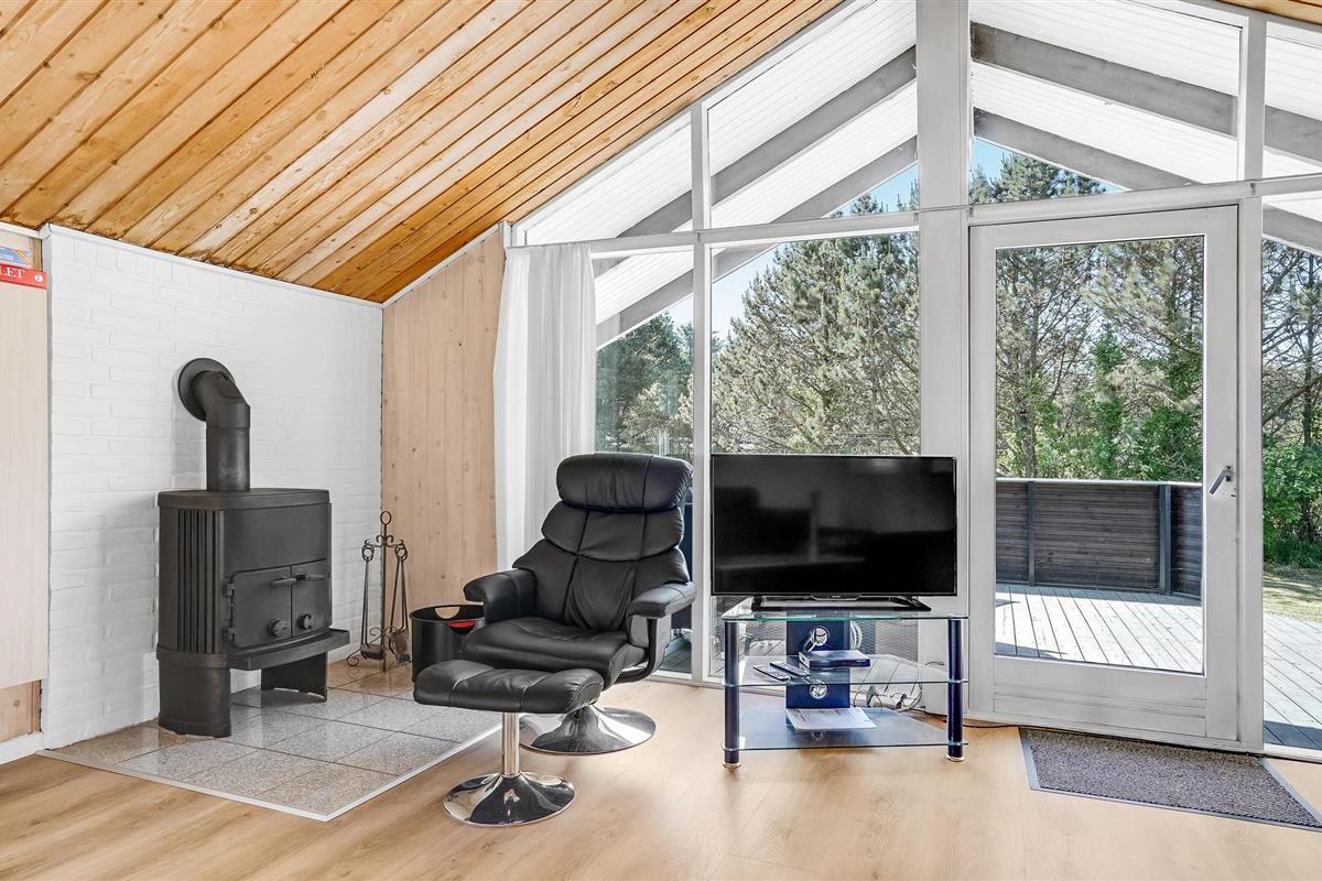 Doe alsof je thuis bent in de open woonkamer van je vakantiehuis in Blåvand met keuken, eettafel en comfortabele bank. De houtkachel zorgt voor gezellige warmte en het grote raam aan de voorkant met uitzicht op het gedeeltelijk overdekte terras laat veel licht in het huis. De eigen sauna belooft ontspanning voor lichaam en geest aan het eind van de dag.