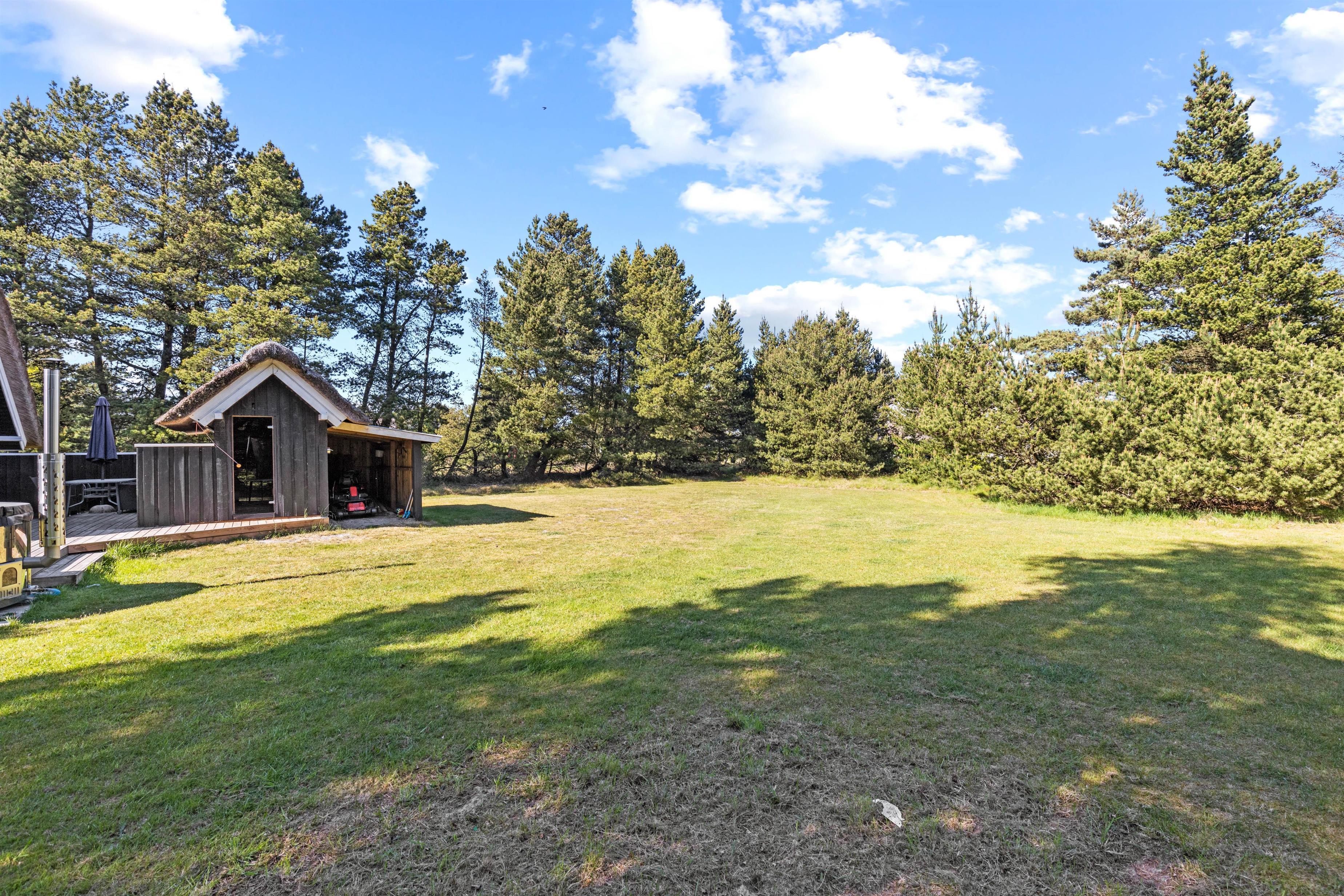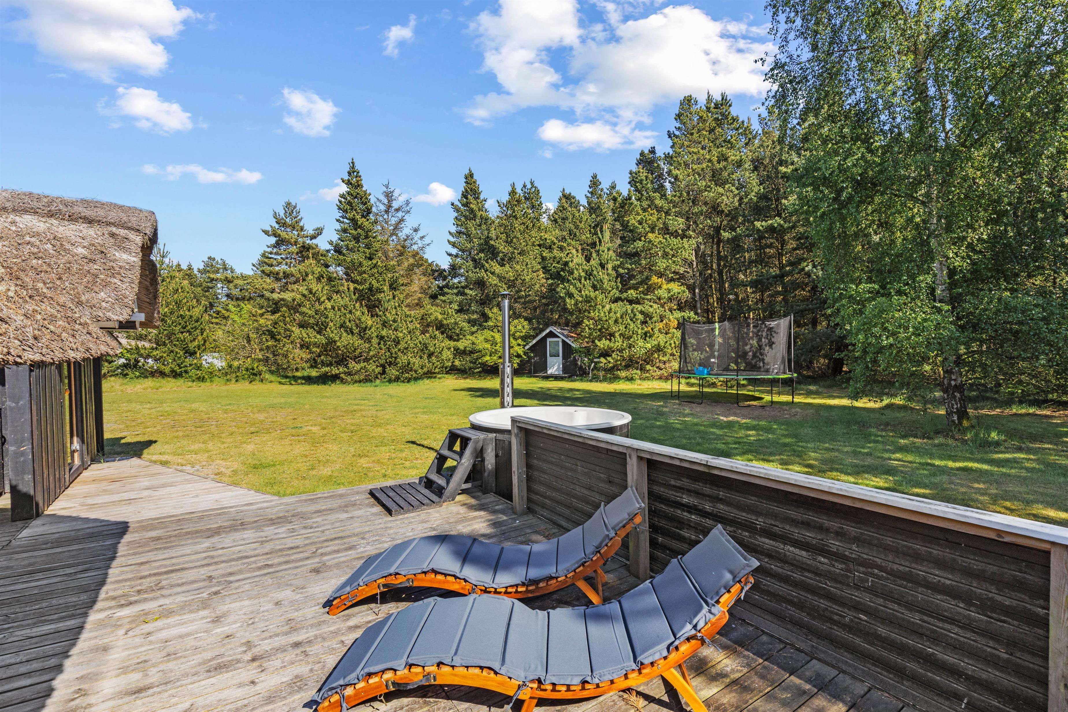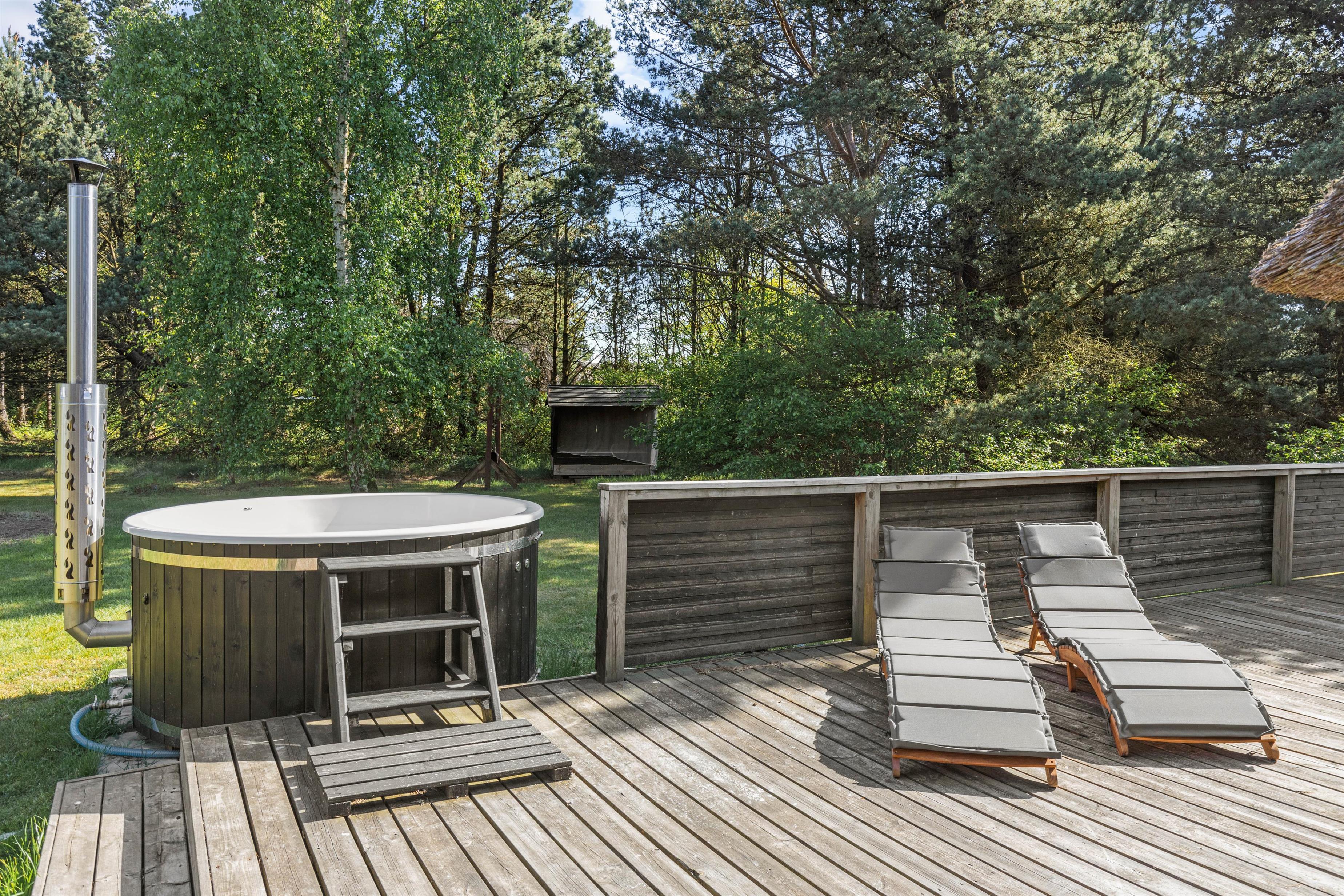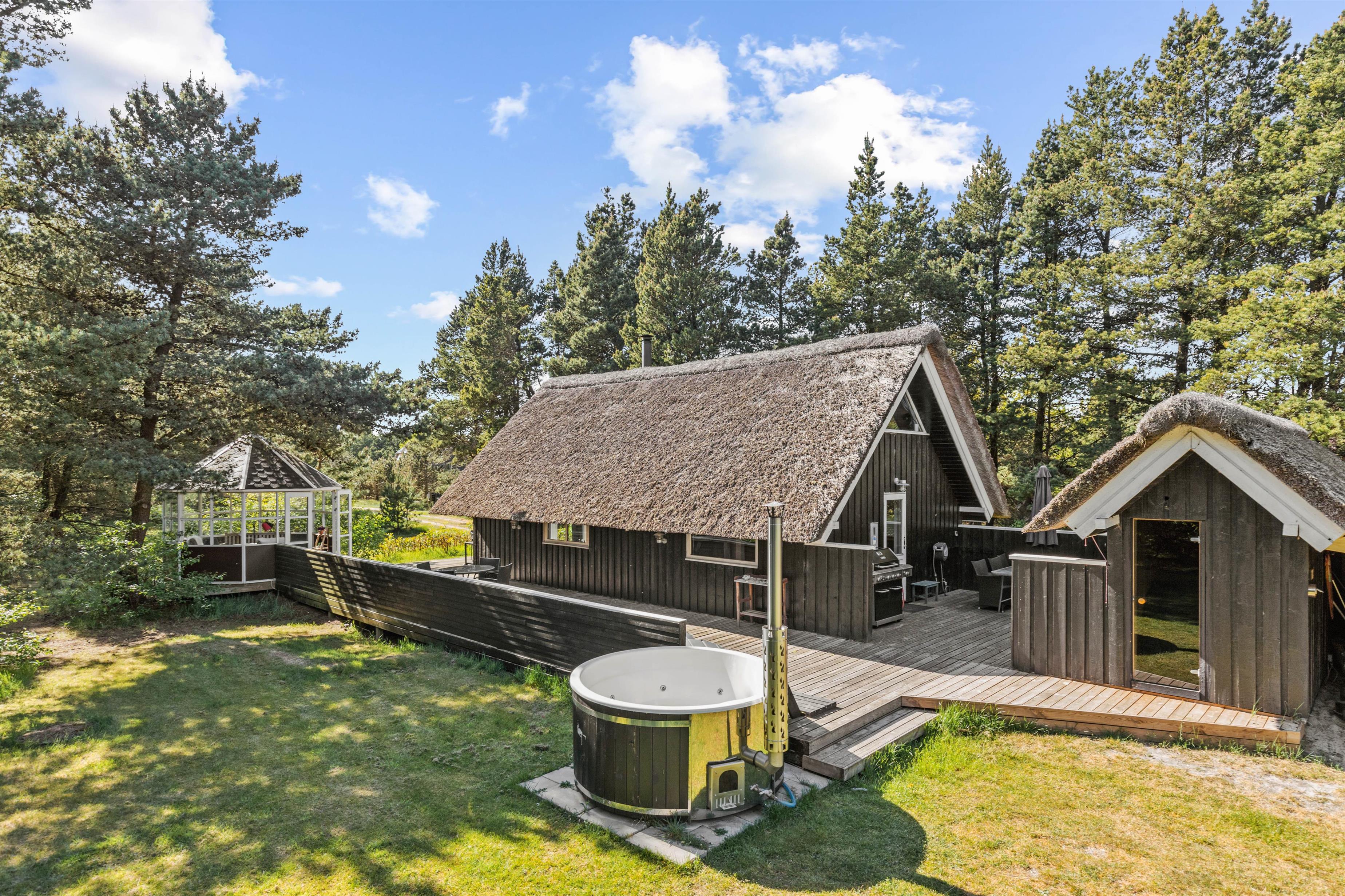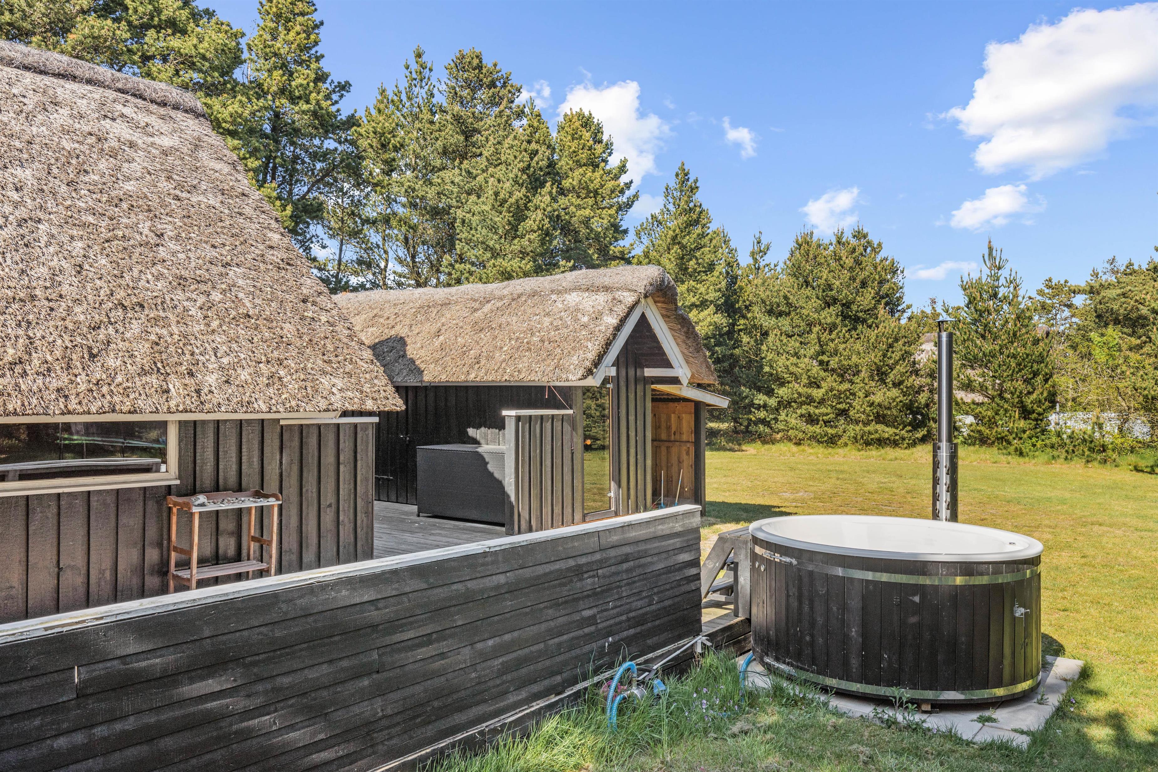 Beautifully enclosed by trees and bushes, this recently renovated holiday home on Sandtoftevej 53 (renovated in 2021) awaits you. There's plenty of space for family or friends – and your two dogs are also very welcome. Spread across 73 square metres, there are two bedrooms, plus a heated annexe with two additional sleeping spaces. For ultimate relaxation, you'll find a wood-fired hot tub and outdoor sauna where you can recharge after a long day.