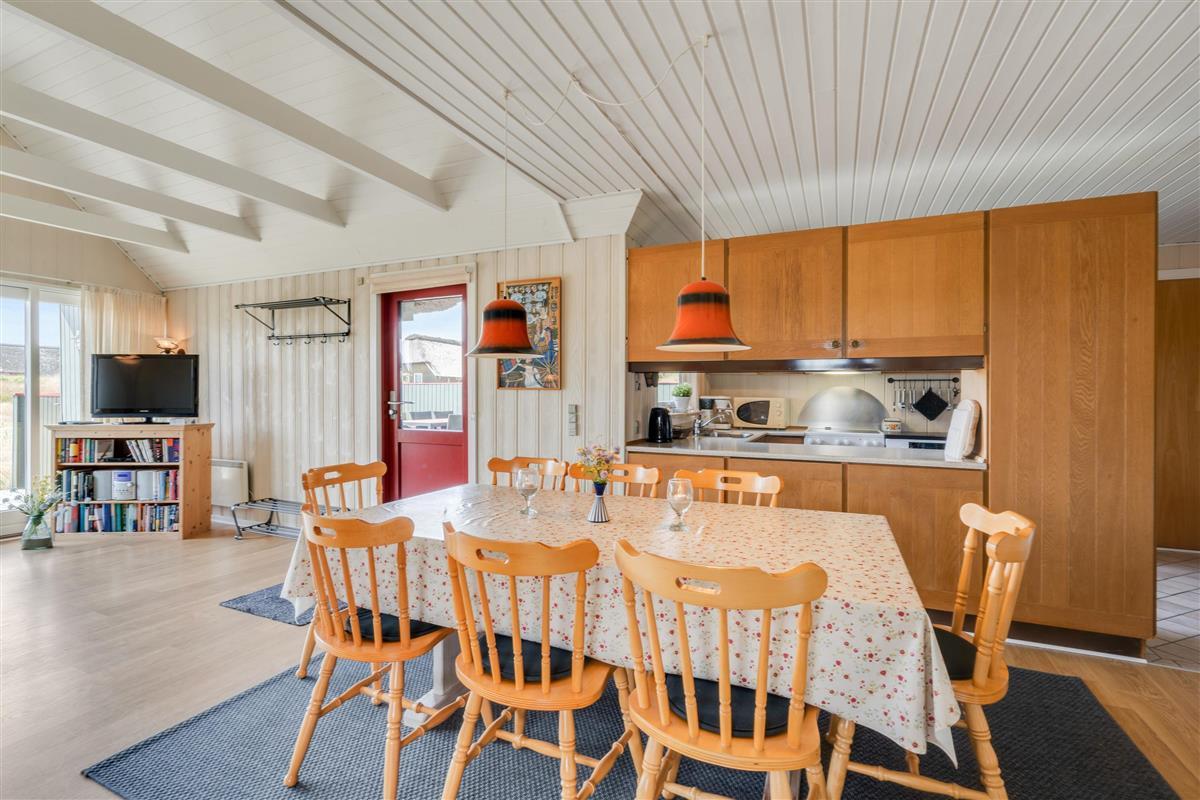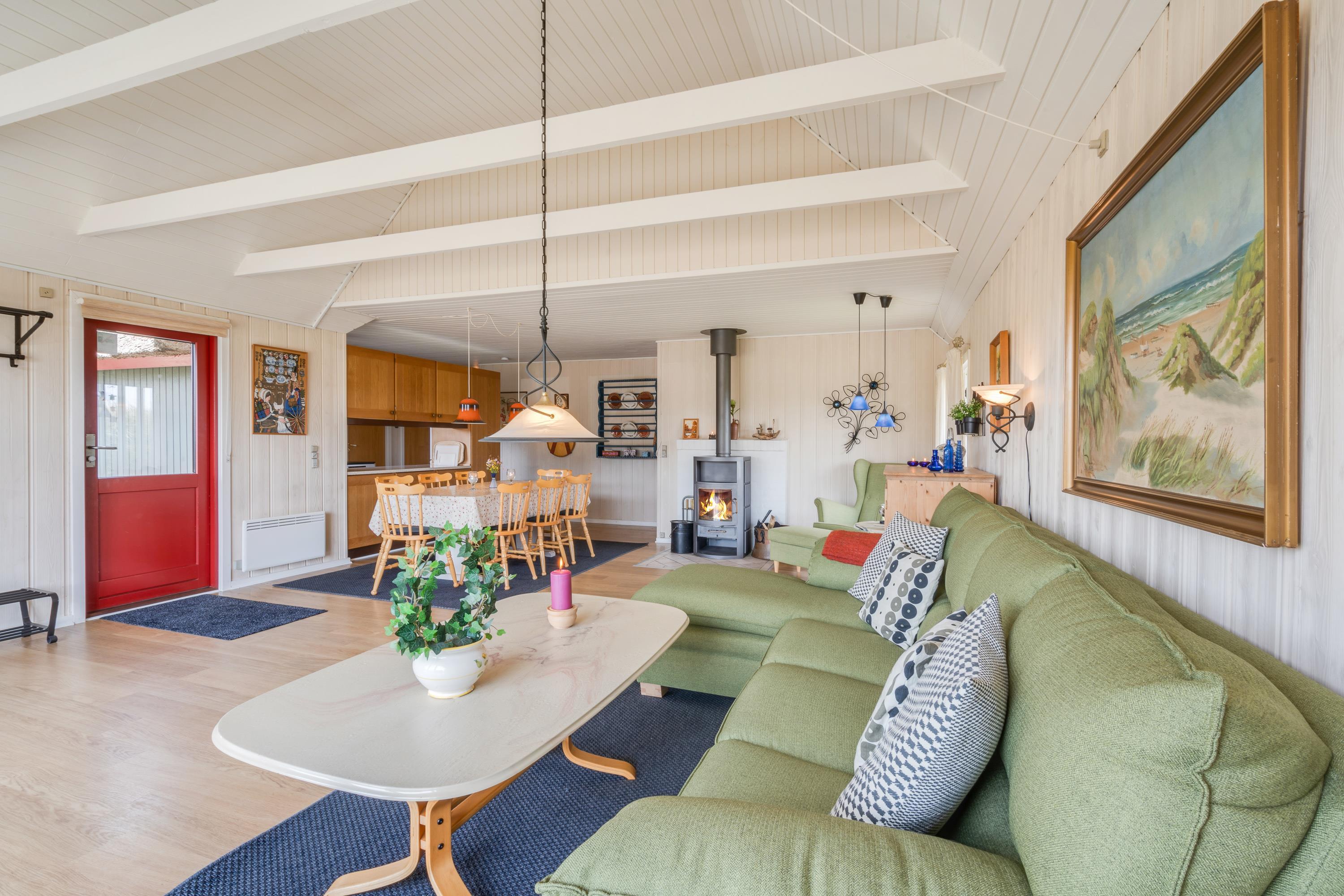 The open-plan living and dining area adjoining the kitchen features comfortable 70s-style furniture, perfect for relaxing holiday moments. Enjoy evening meals together in the warmth of the wood-burning stove. The kitchen includes a dishwasher, ensuring nothing stands in the way of a fun family games evening.