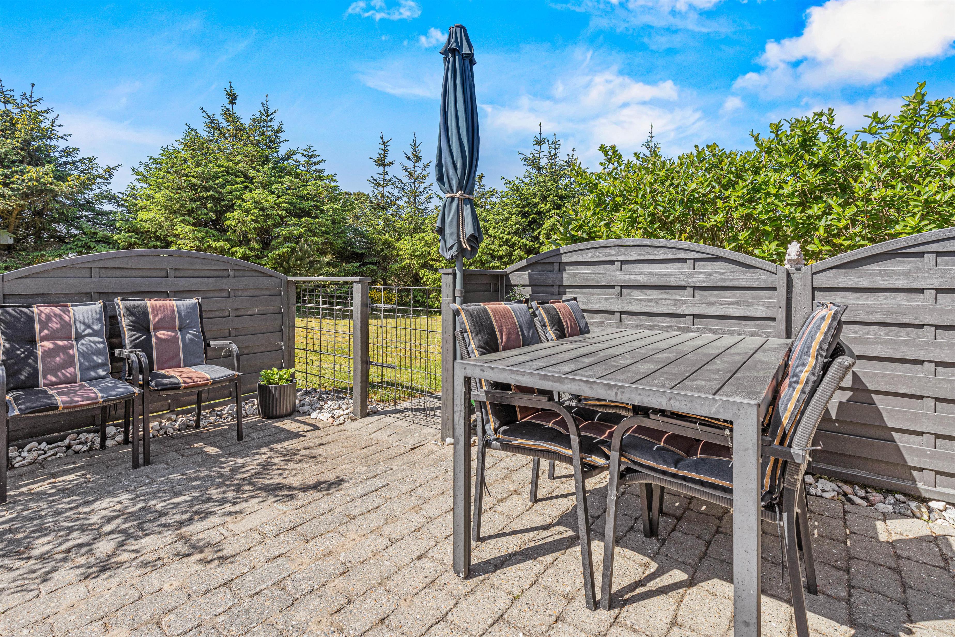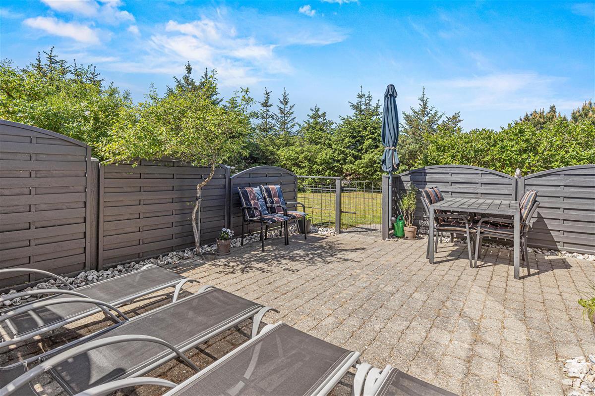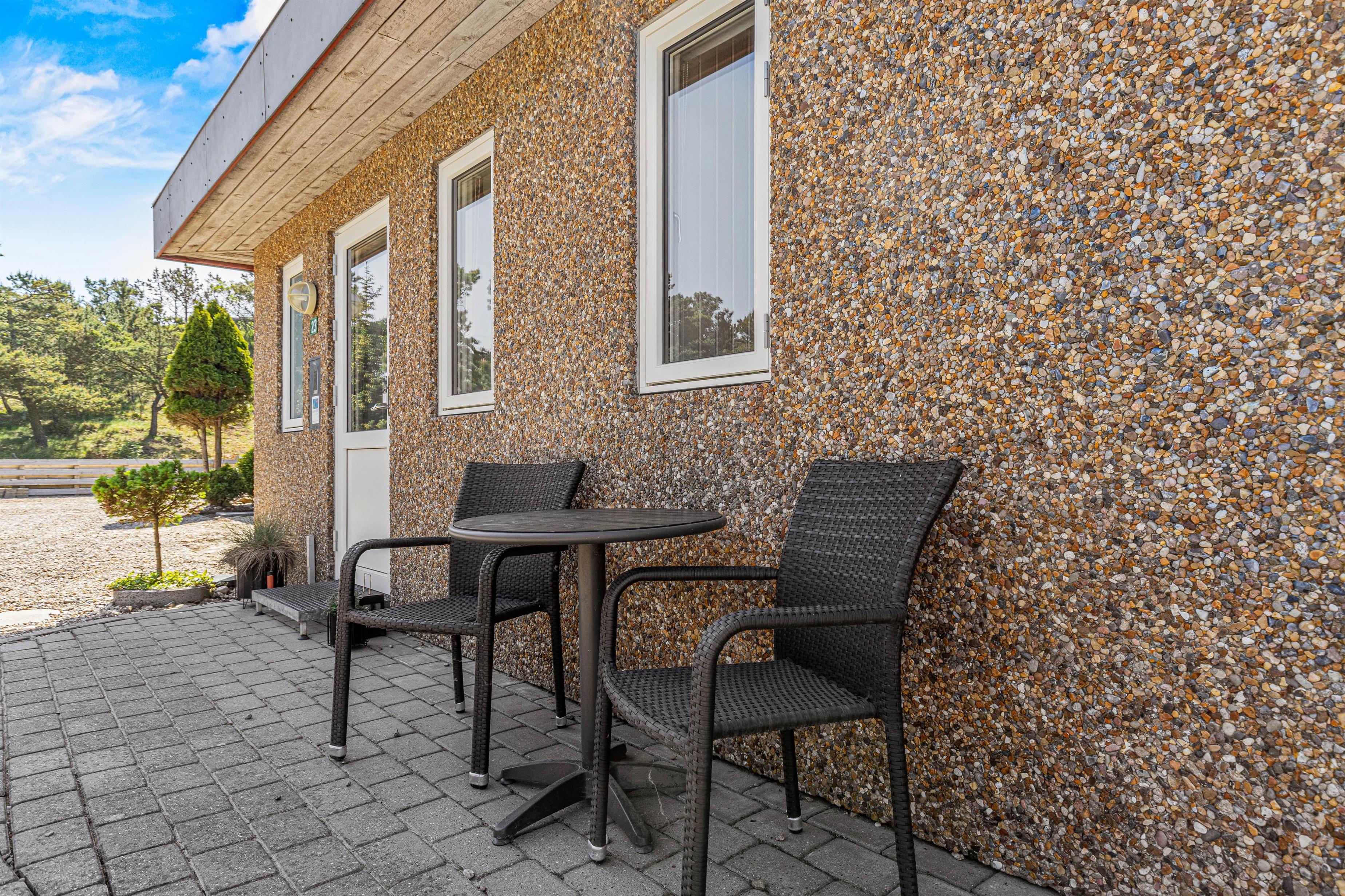 You can enjoy sunny, warm holiday days on the fenced terrace at Fyrgården 23. Sun loungers and garden furniture are provided for relaxation in the fresh air.