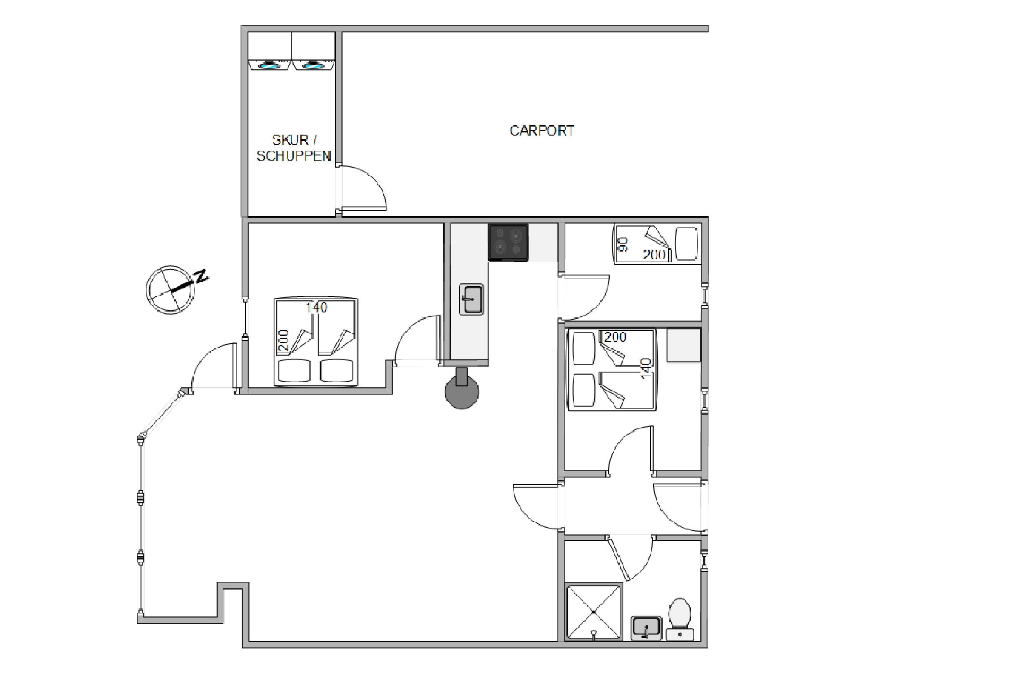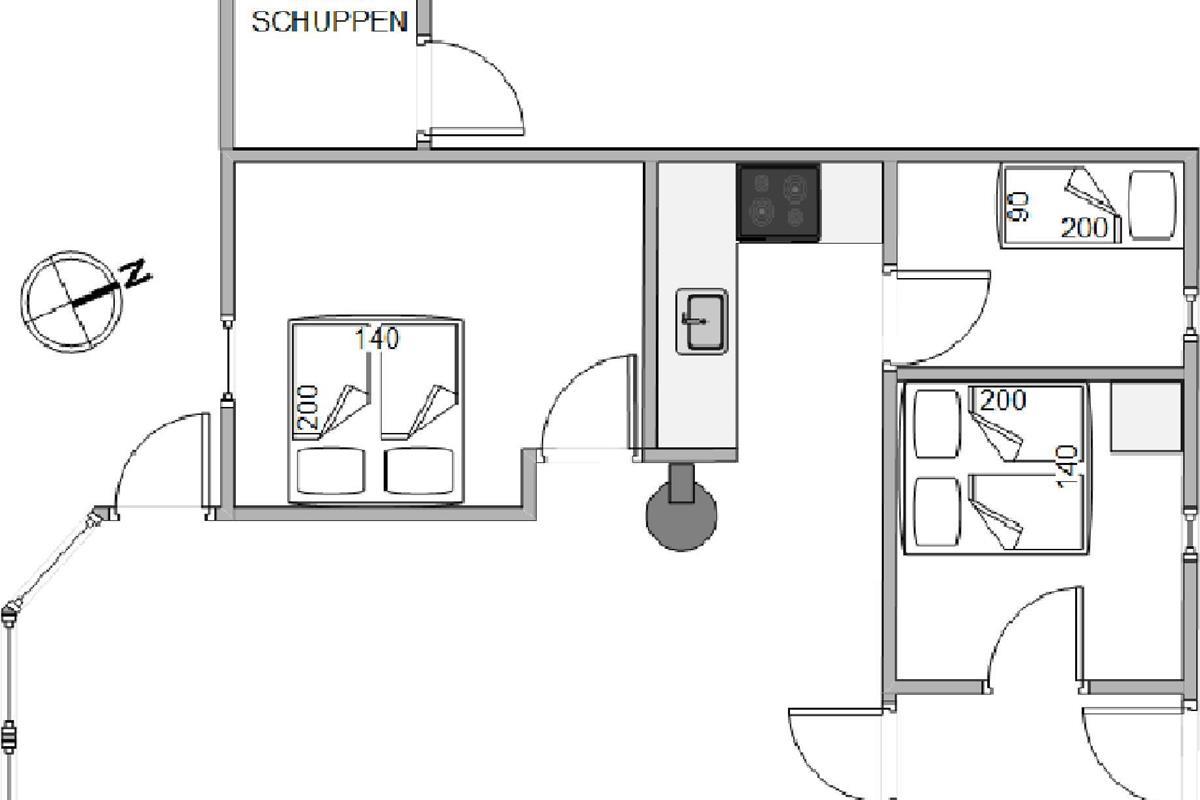 The holiday home has three bedrooms in total. Two are equipped with double beds, and one with a single bed.